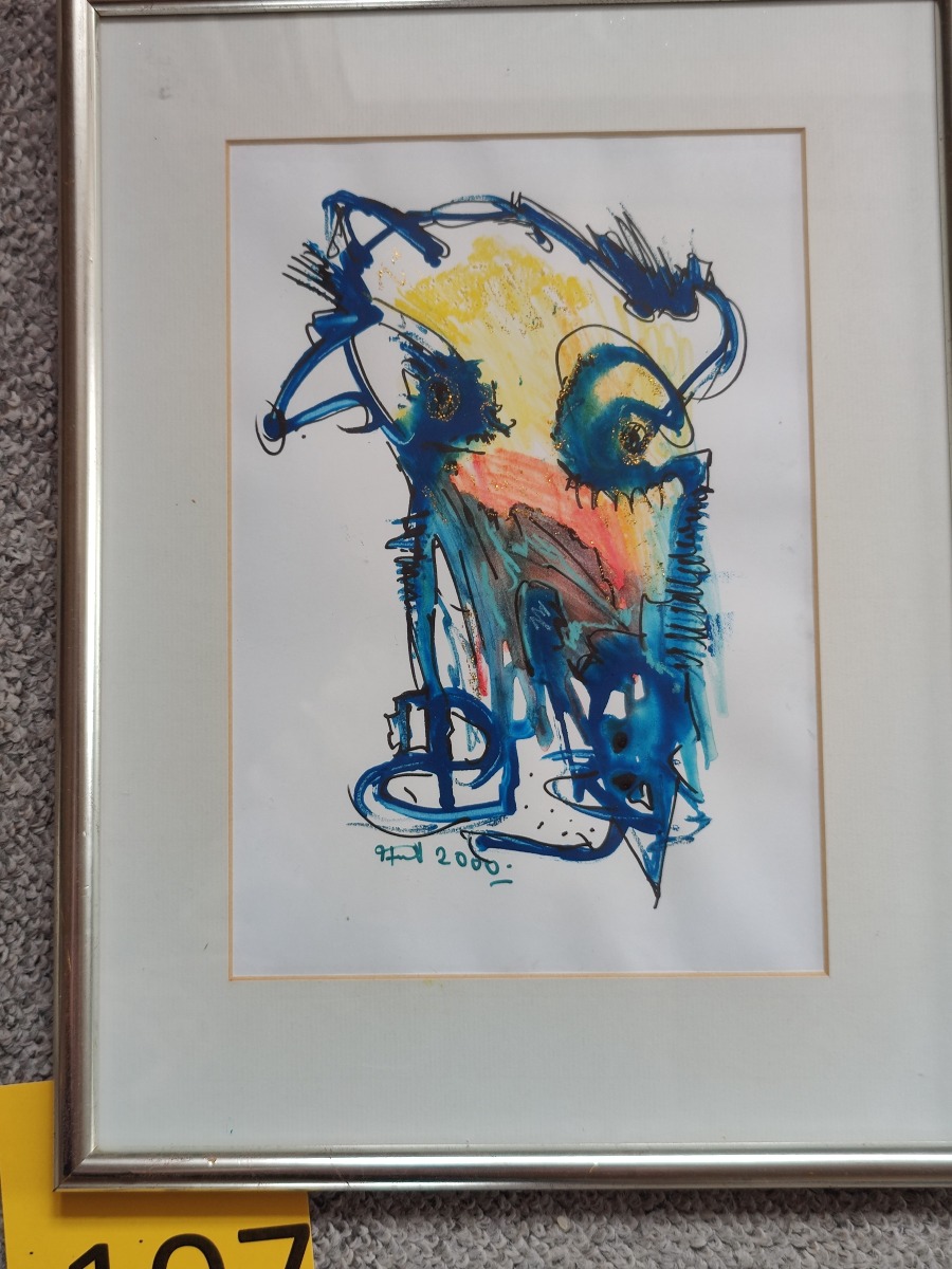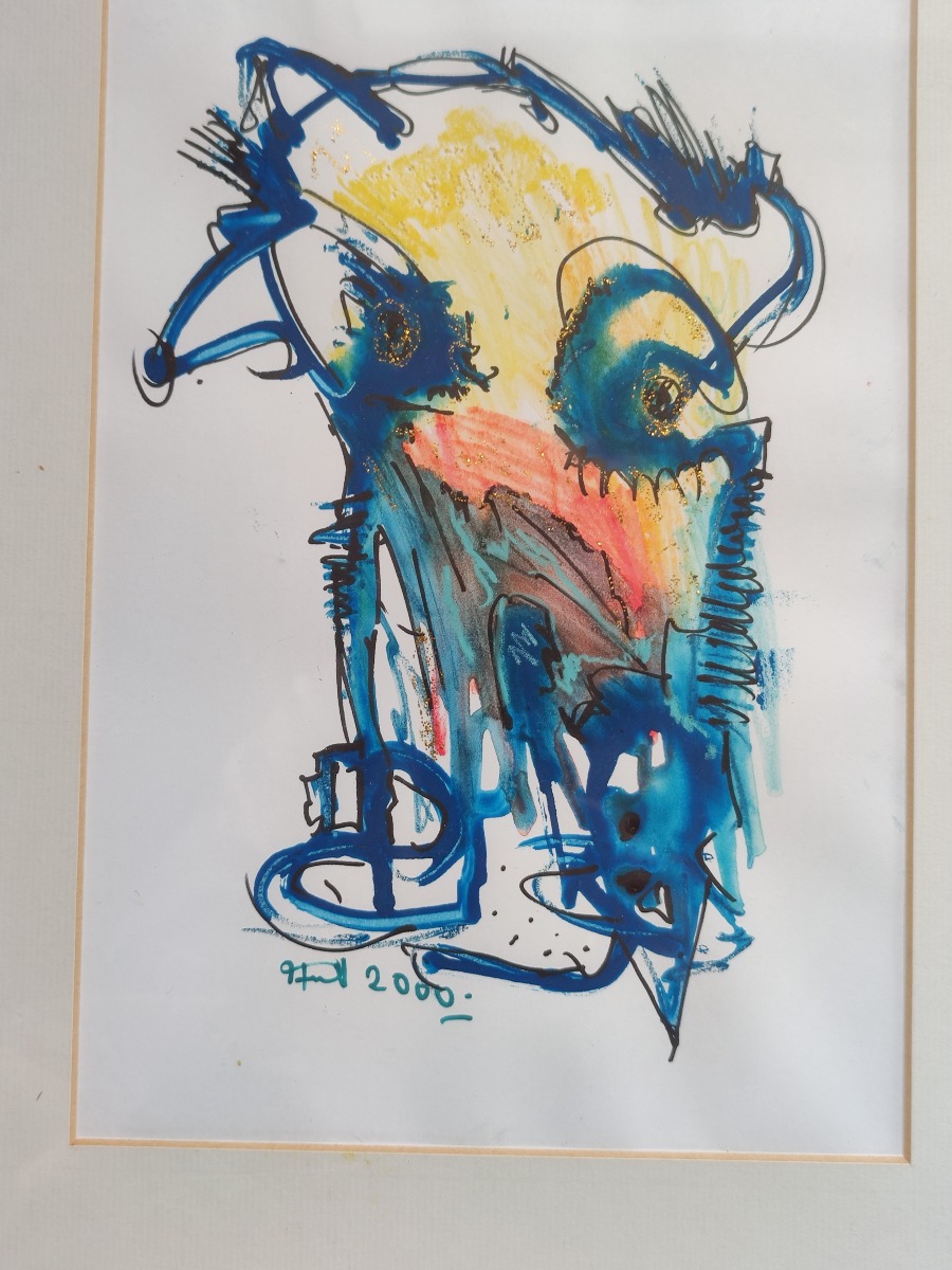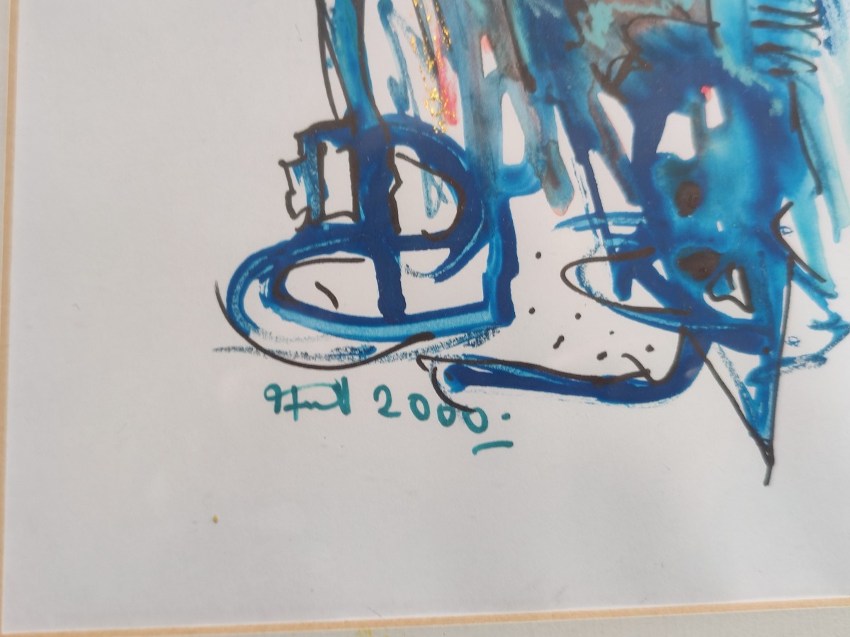 Ubk. kunstner. Maskekomposition. Antageligt Akvarel og tusch på papir. Signeret utydeligt og dateret 2000. 42 x 32 cm.