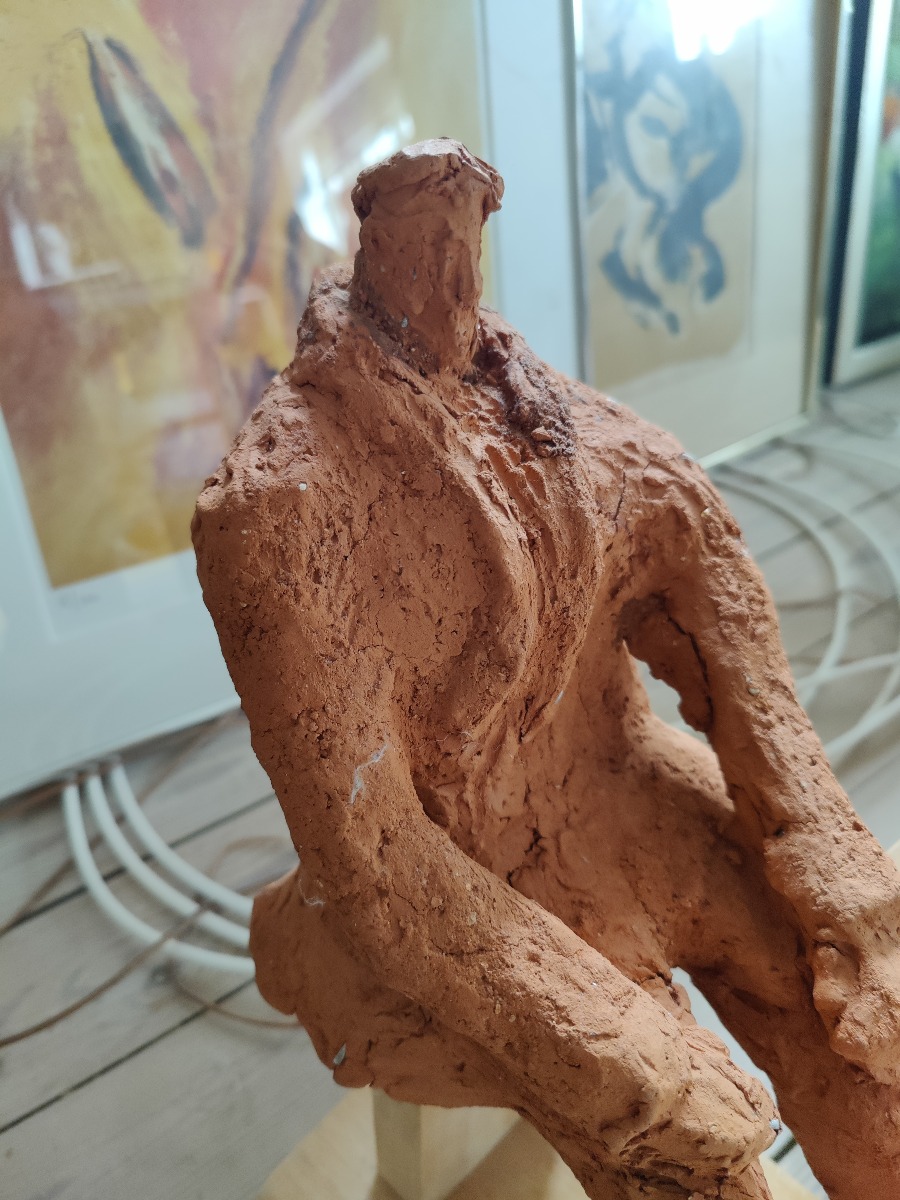 Ubk. kunstner. Siddende mand. Modelleret på metalskelet. Sokkel af træ. 40 x 28 x 16 cm. Umiddelbart ikke signeret.