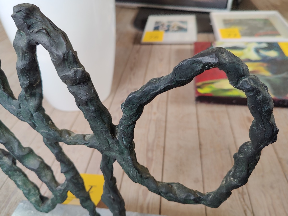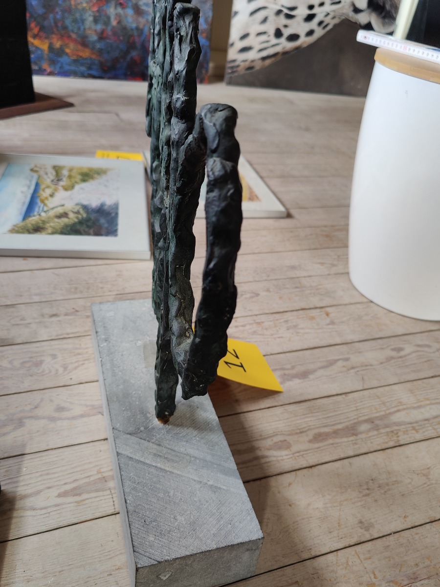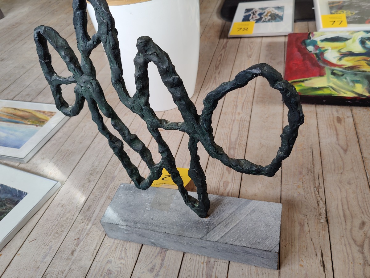 Ubk. kunstner skulptur af bruneret metal på fod af granit. 57 x 48 12 cm.