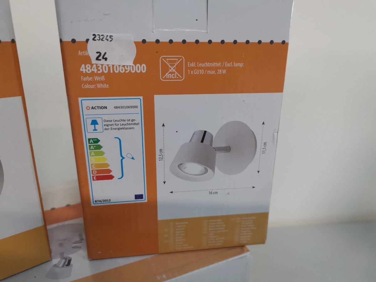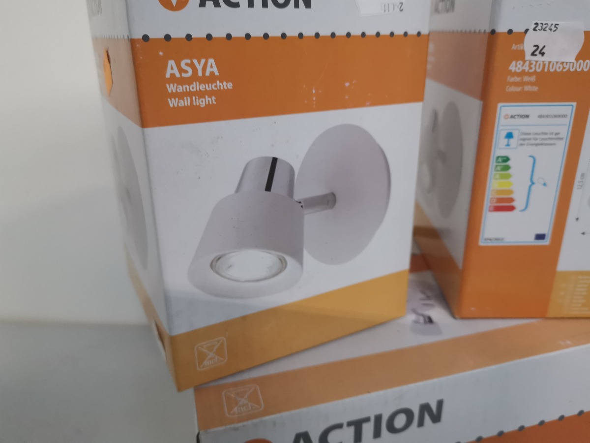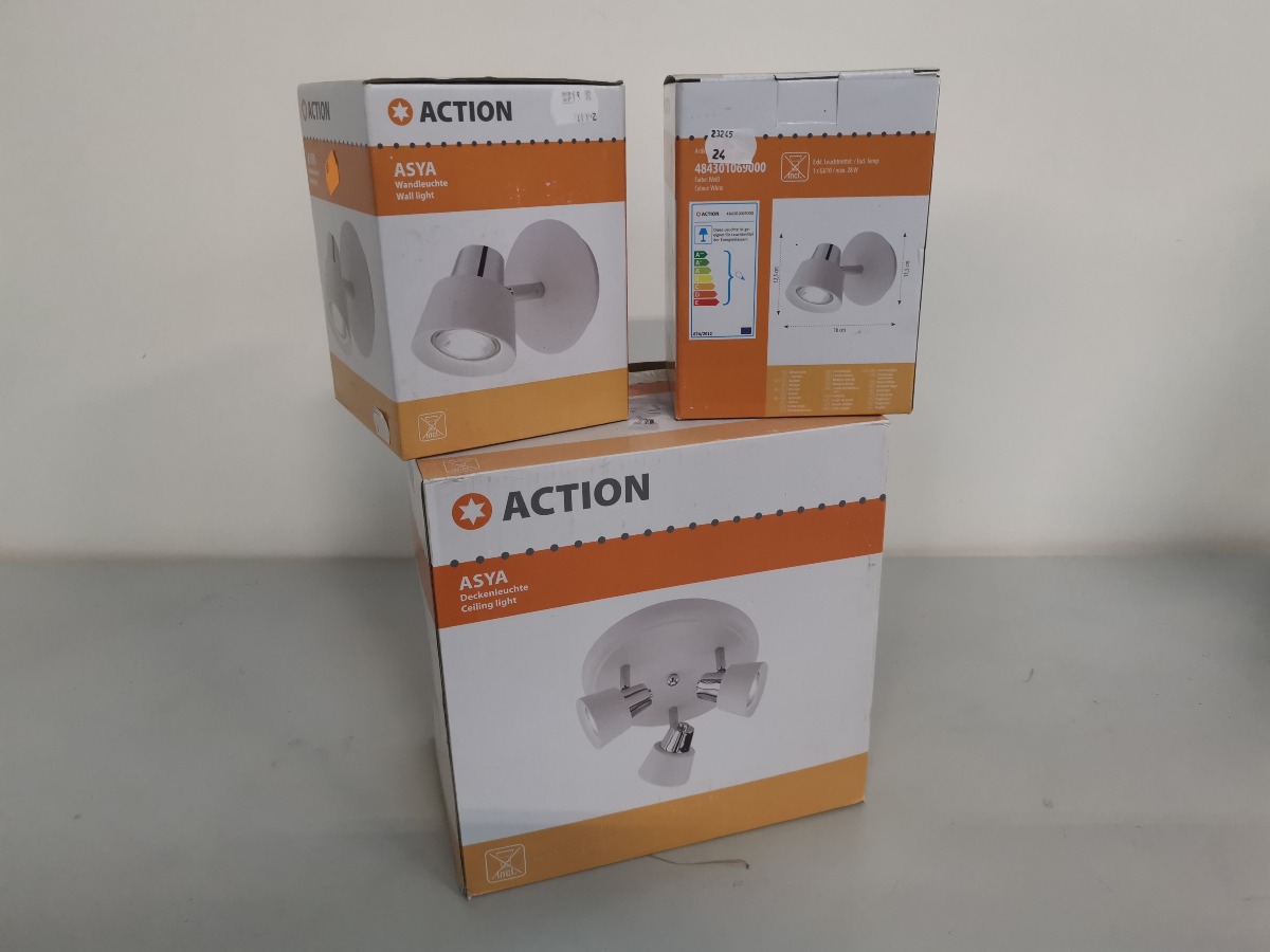 Action Asya loft og vægpots. Rund loftspot med 3 lyskilder samt 2 enkelte vægspots. Ubrugte og i origional embalage. (3)