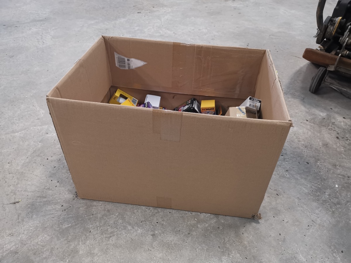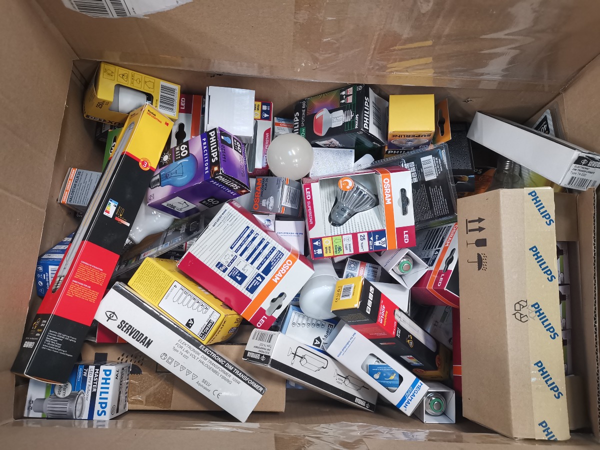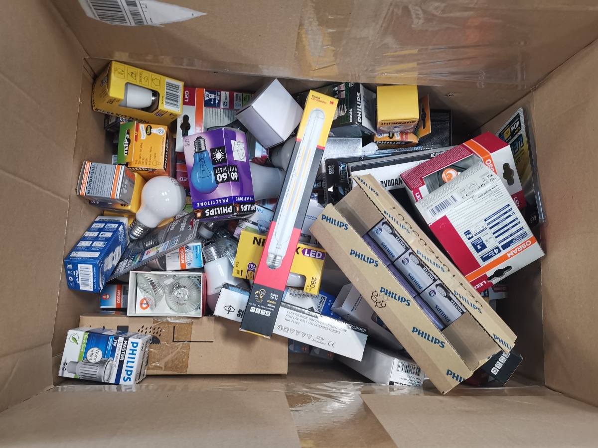 Flyttekasse med diverse pærer. LED og almindeliger m.m.
