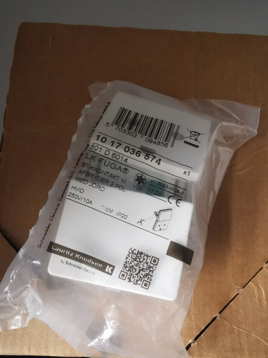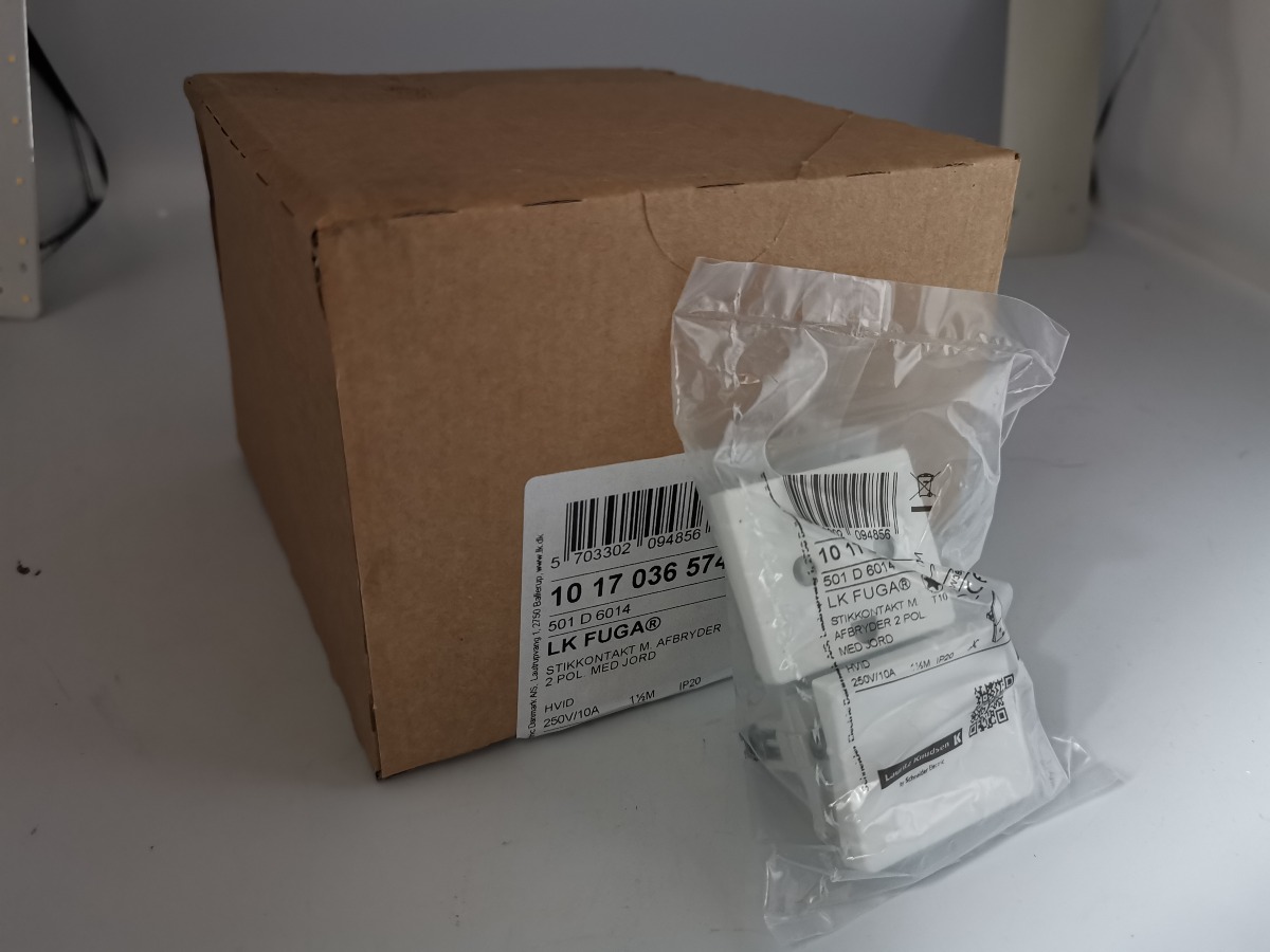 10 stk. LK Fuga stikkontakt med afbryder med jord, 1,5 modul, hvid. Kontakterne ligger i origial forpakning og med ubrudt plastembalage.