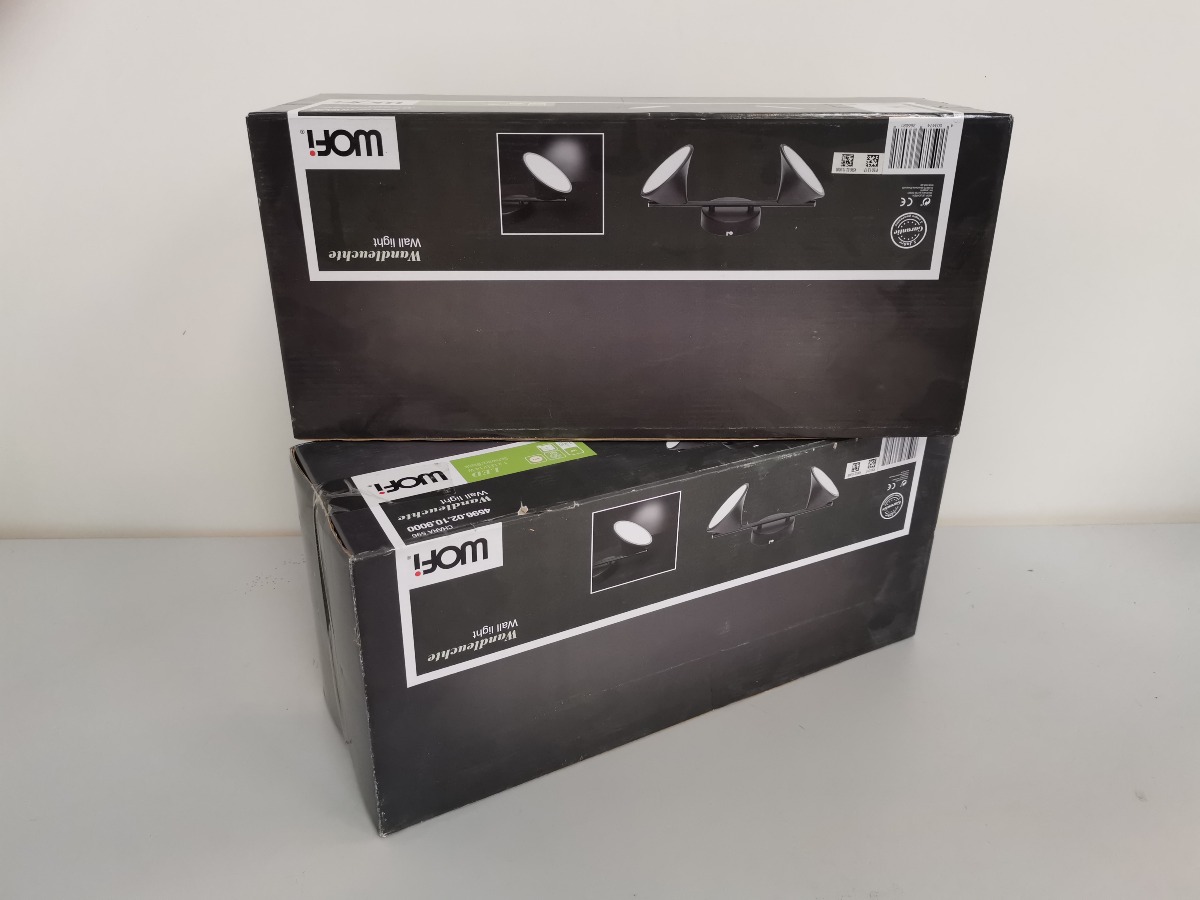 2 Wofi spotskinner med 2 lyskilder, LED, sortlakeret. 14W, 1300 Lumen, 3000 Kelvin. H. 18, B. 40 cm. Varerne ligger i original embalage.