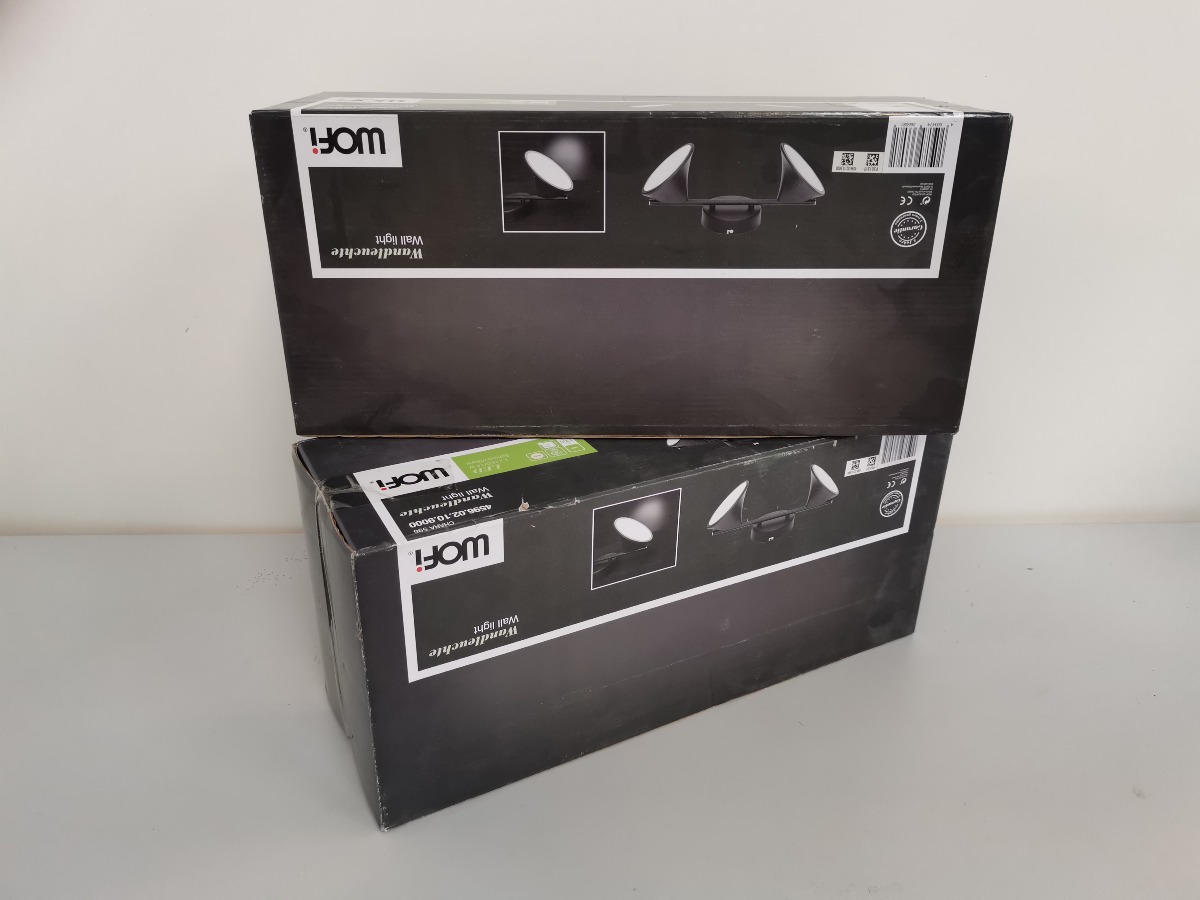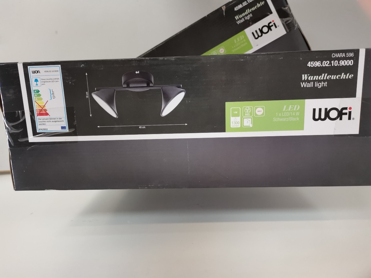 2 Wofi spotskinner med 2 lyskilder, LED, sortlakeret. 14W, 1300 Lumen, 3000 Kelvin. H. 18, B. 40 cm. Varerne ligger i original embalage.