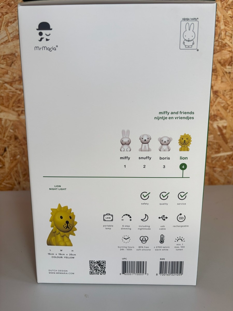 2 stk. Lion First Light natlampe. Højde: 25 cm. Materiale: Højkvalitets BPA-fri silikone. 6 dæmpningstrin inkl. nattilstand. 8-120 batteritimer (afhængig af den valgte indstilling). Genopladelig med USB-C-kabel (medfølger). Samlet nypris ca. 1100,- kr. Kan nemt bruges med kun to knapper. Ubrugt og i original emballage