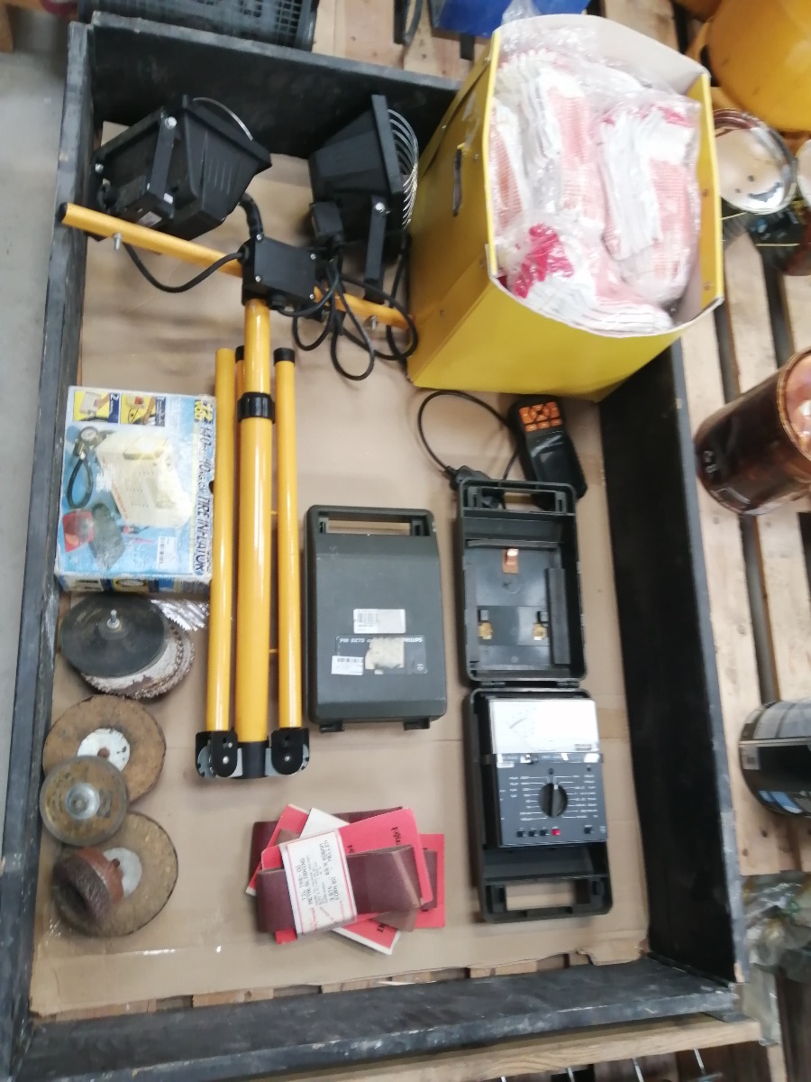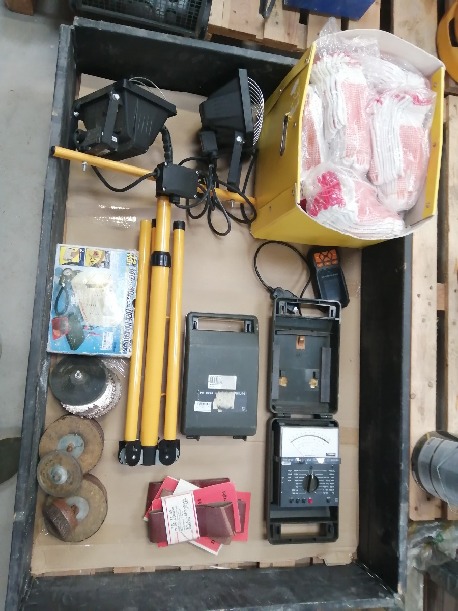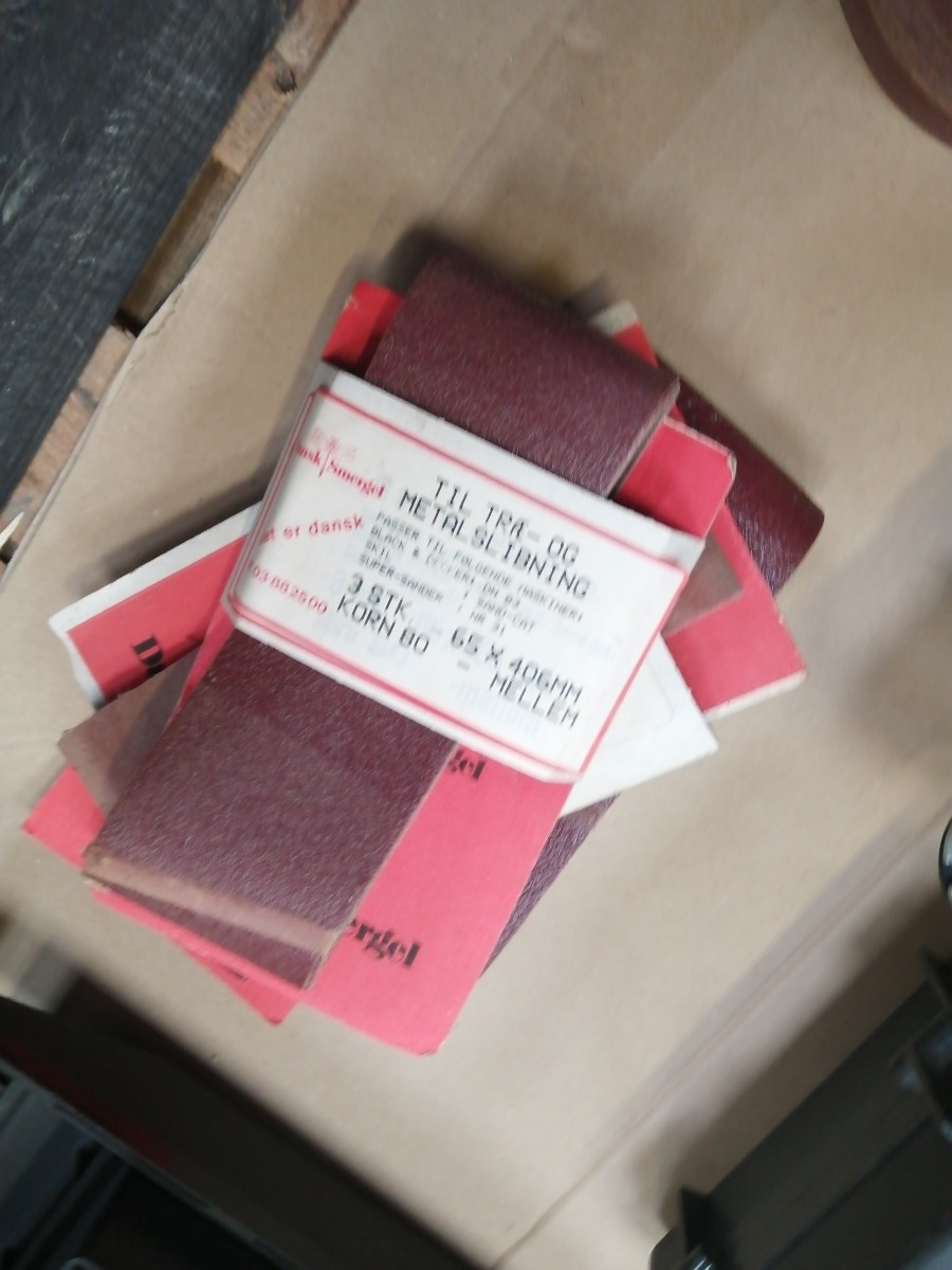 Arbejdshandsker, arbejdslampe, slibepapir, lille kompressor mm. Noget brugt, andet ubrugt.