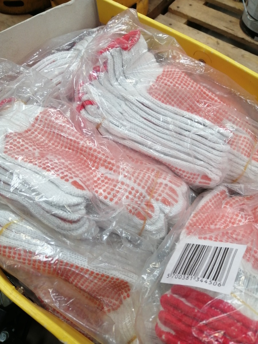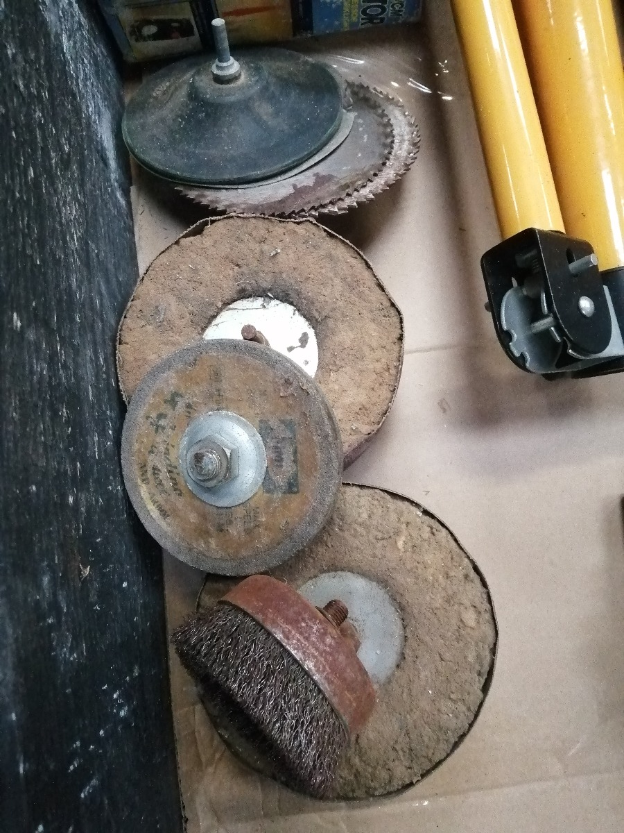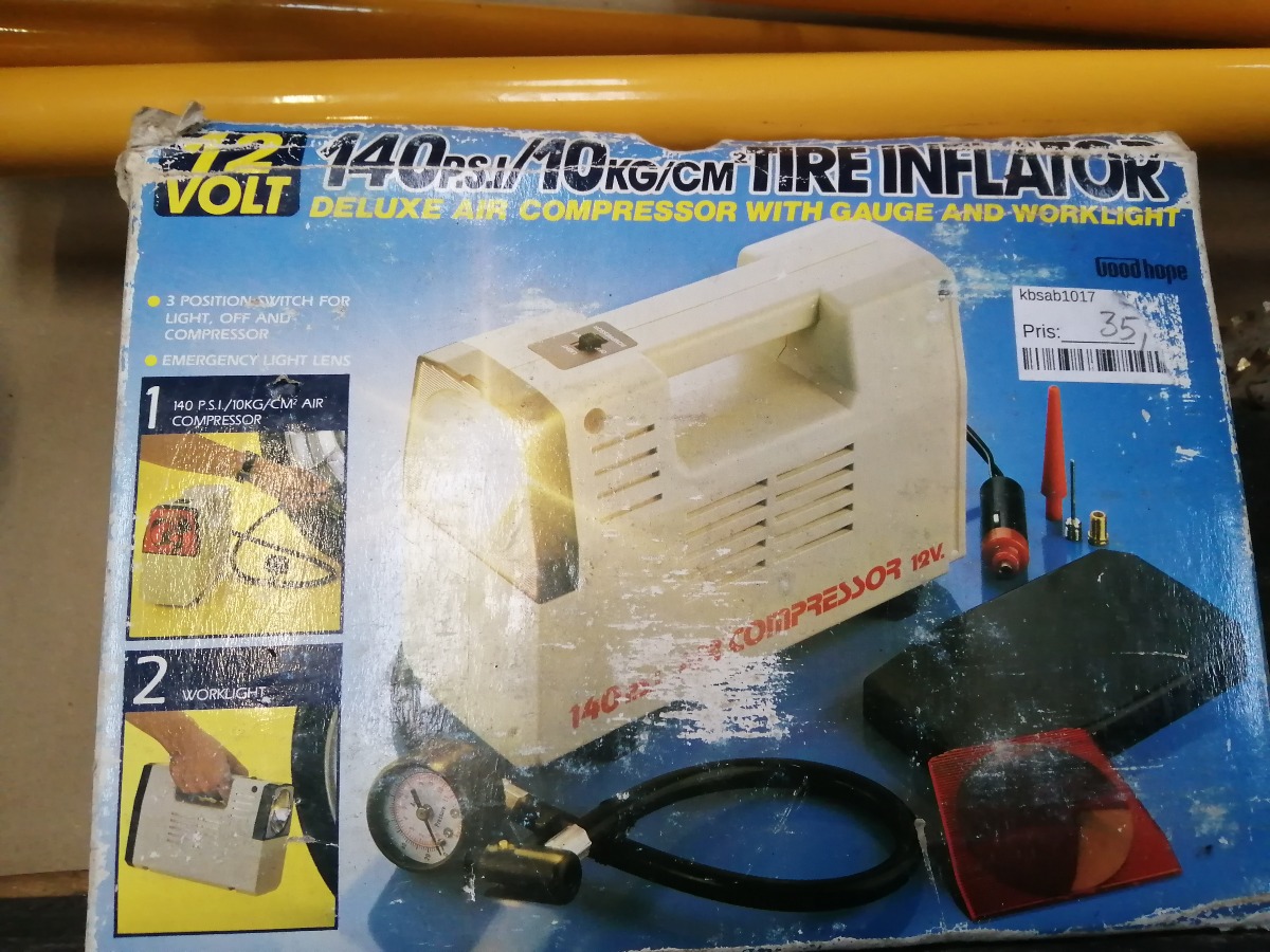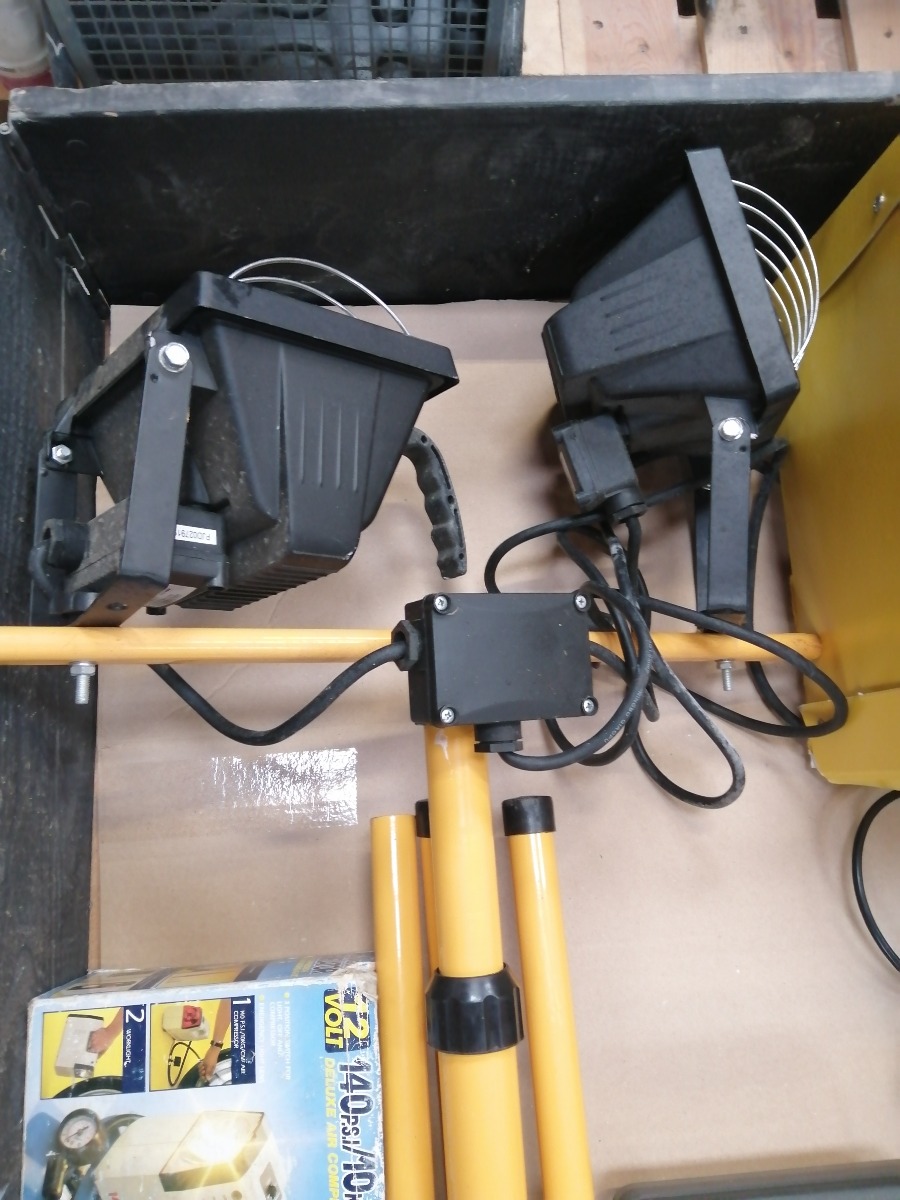 Arbejdshandsker, arbejdslampe, slibepapir, lille kompressor mm. Noget brugt, andet ubrugt.