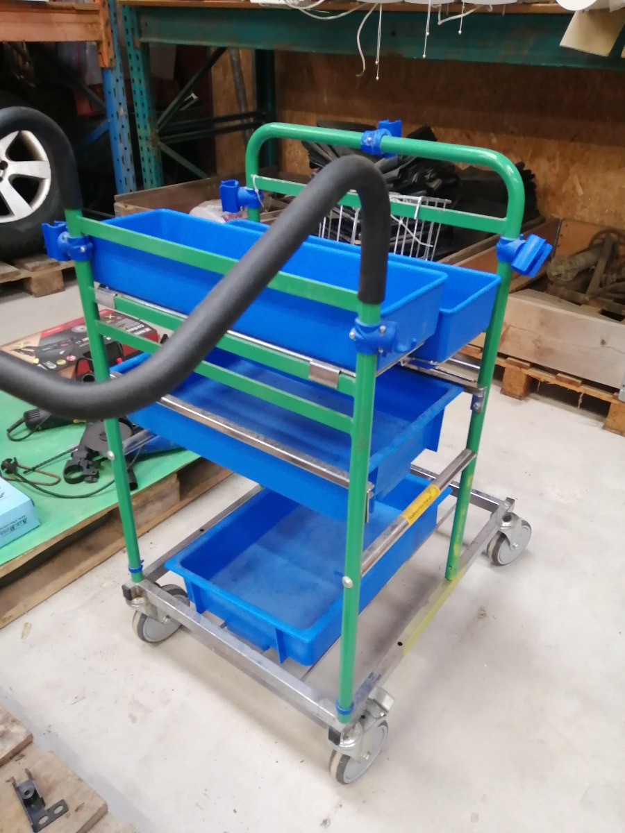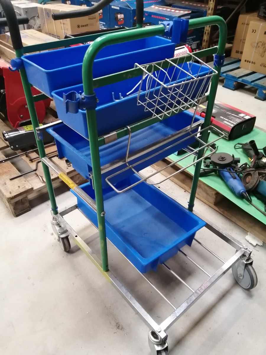 Rengøringsvogn med 4 plastbakker. Brugt.
