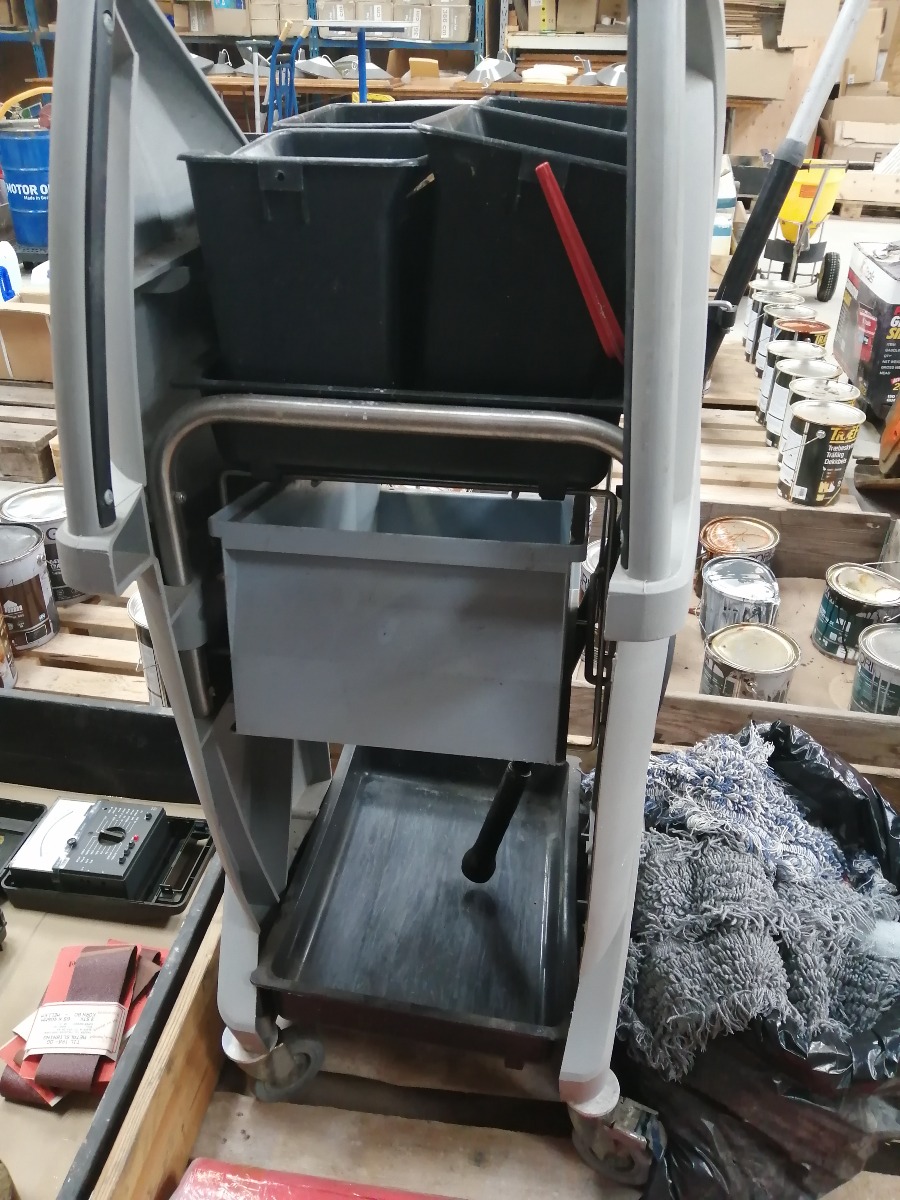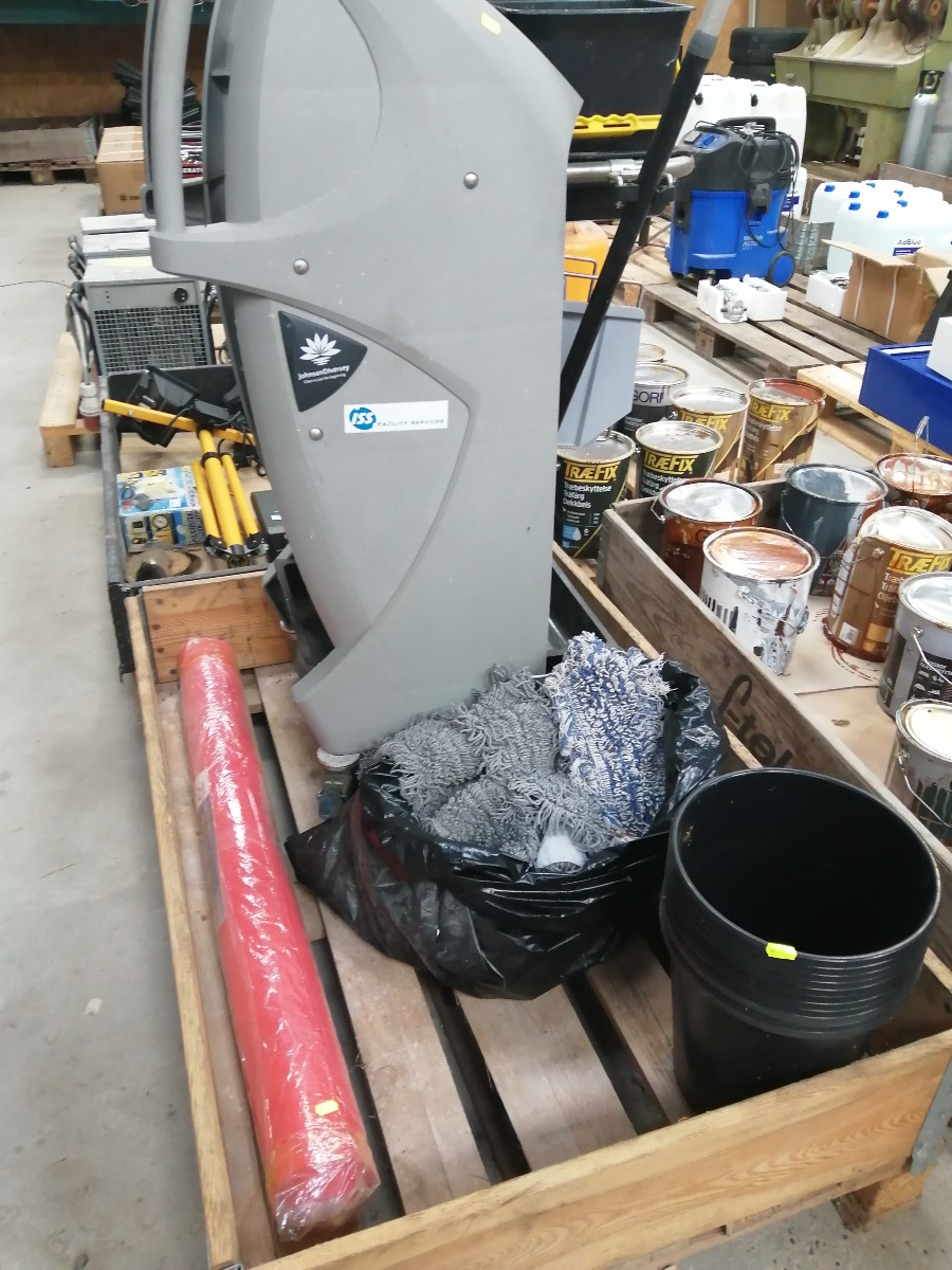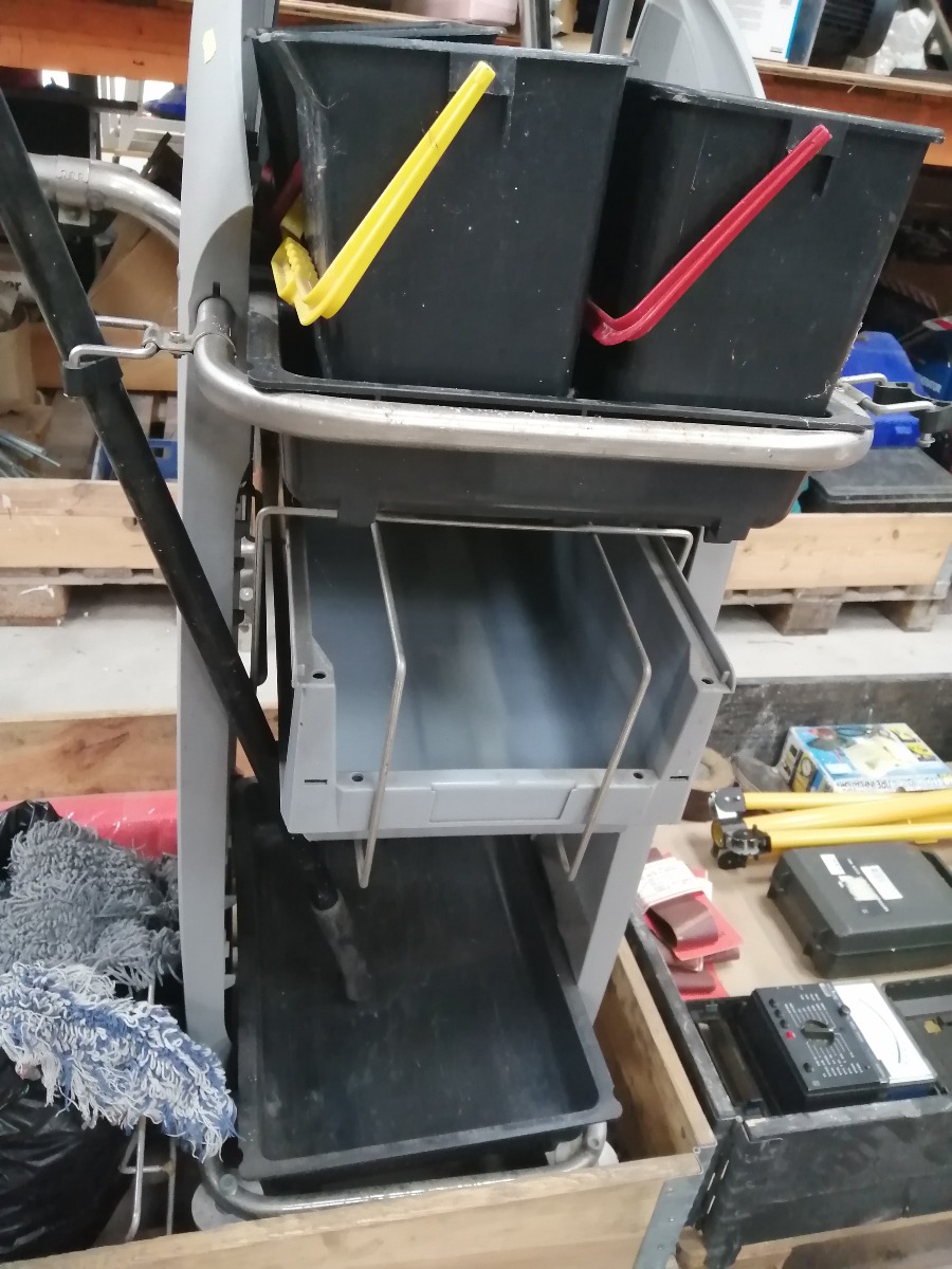 Rengøringsvogn med udstyr i form af spande, mopper, moppestang. Derudover sorte plastspande og rød løber (1 x 3 meter). Brugt