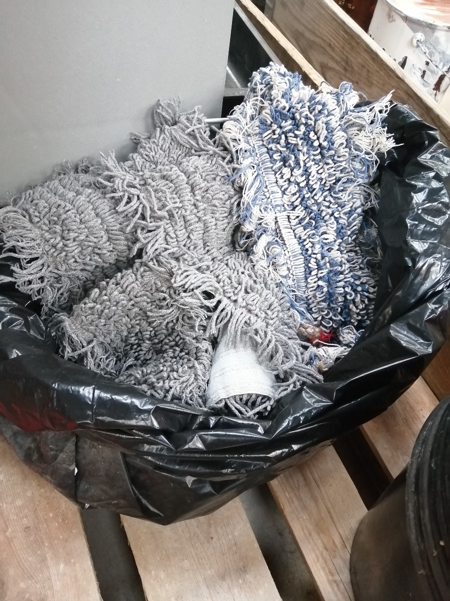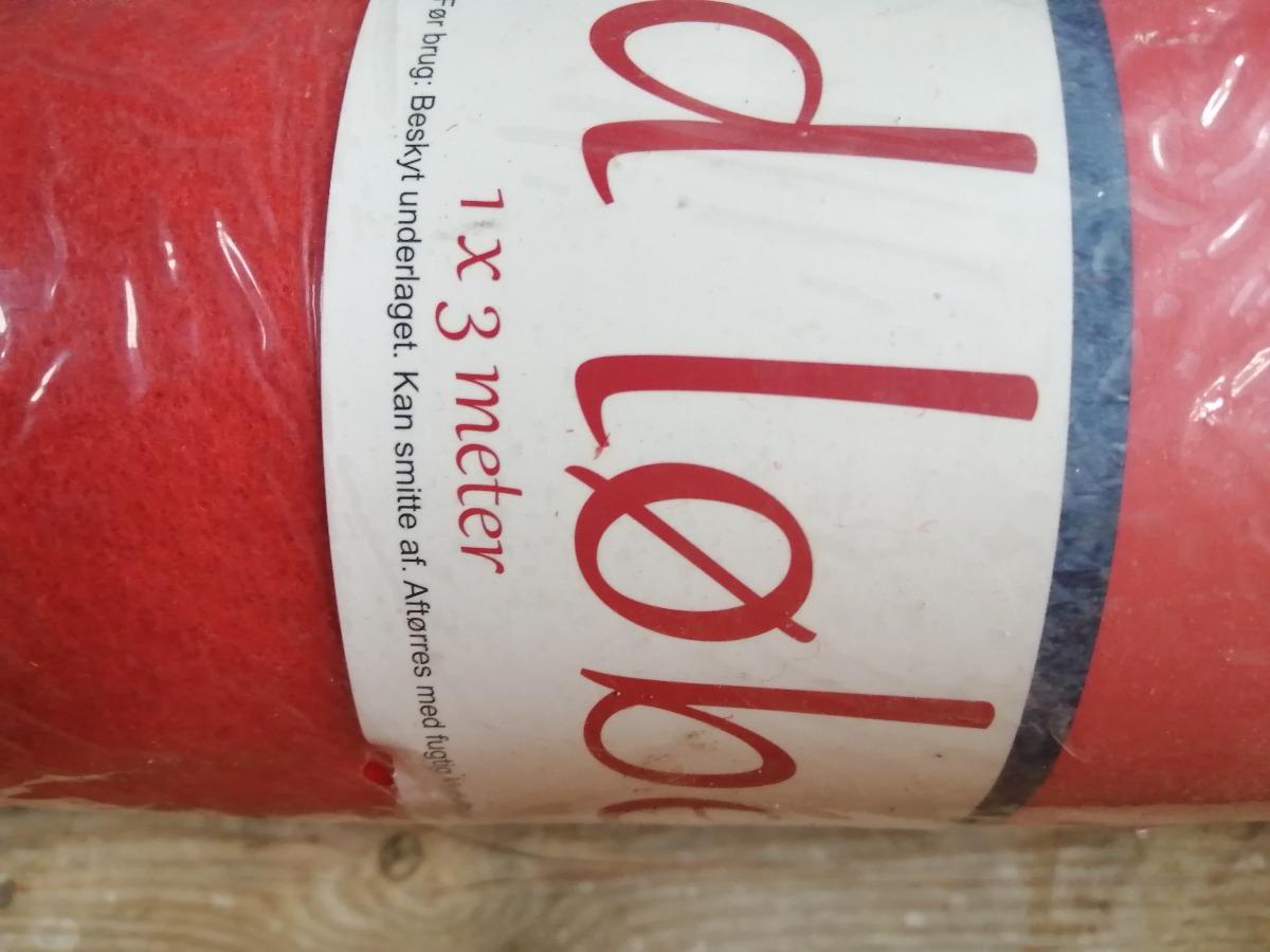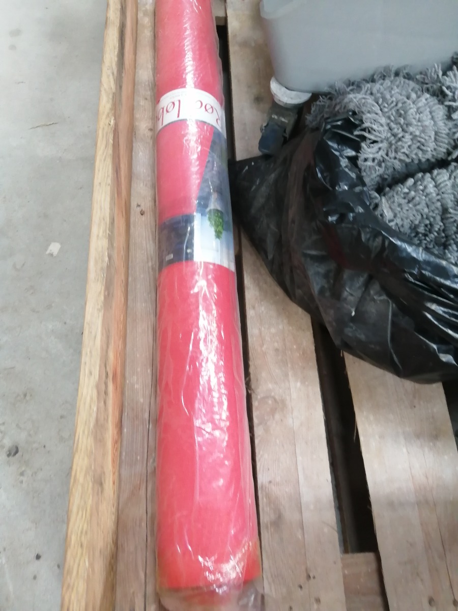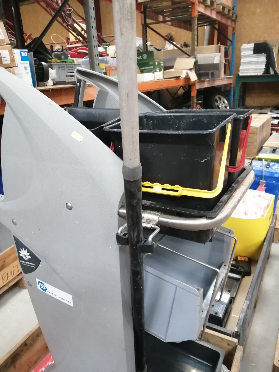 Rengøringsvogn med udstyr i form af spande, mopper, moppestang. Derudover sorte plastspande og rød løber (1 x 3 meter). Brugt