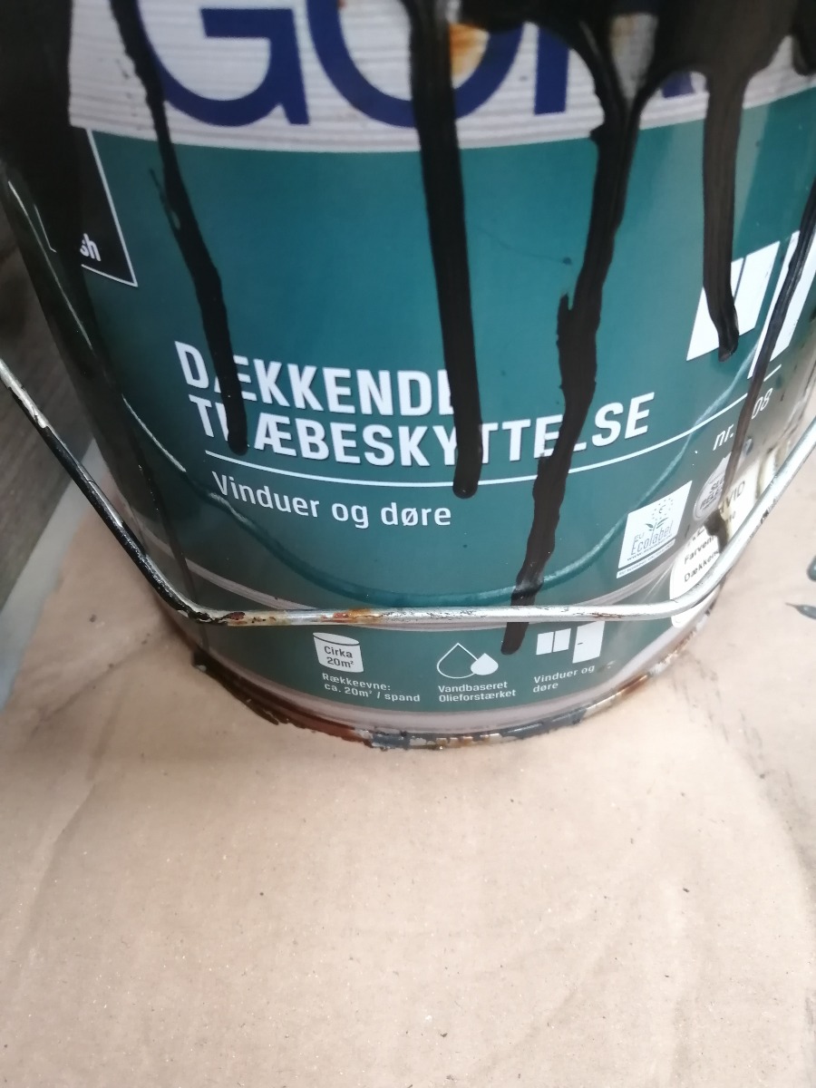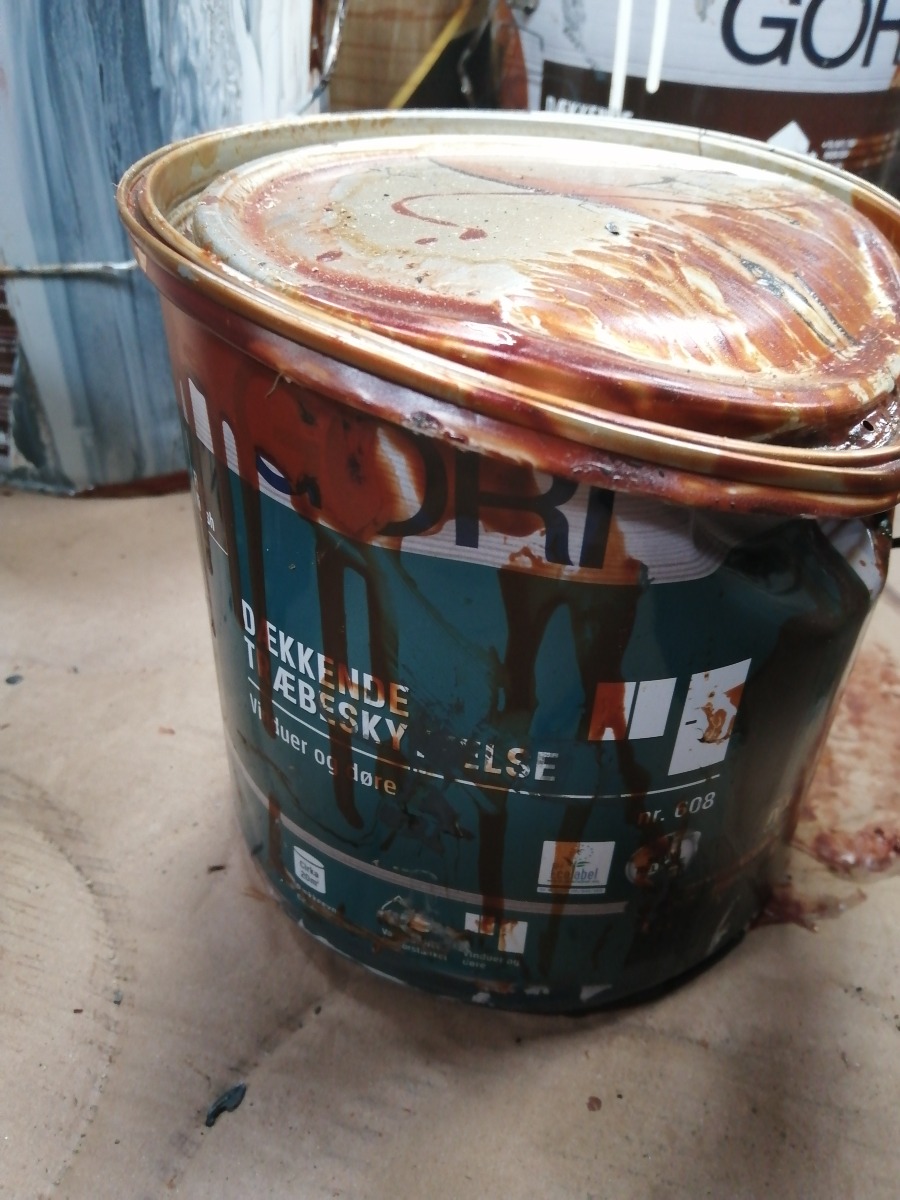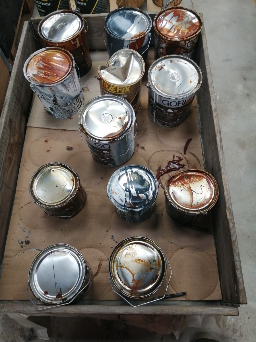 Diverse spande maling. De er uåbnede, men har været i uheld. Derfor har flere af spandene maling, buler og mærker.