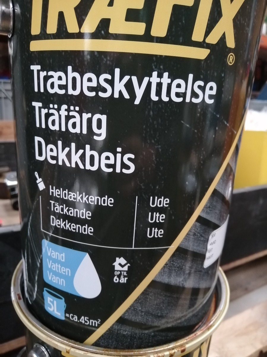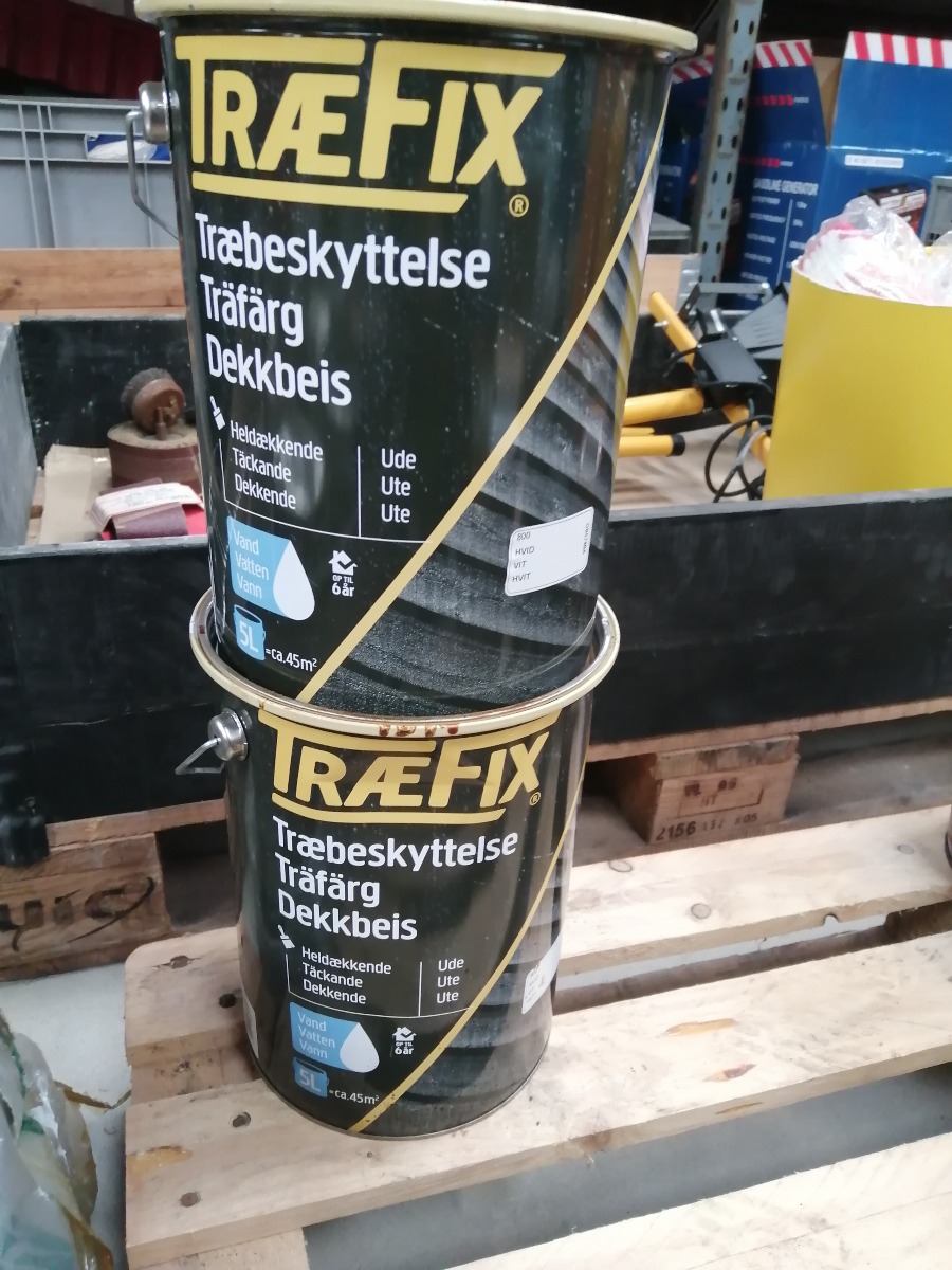 2 spande træfix træbeskyttelses maling, hvid. De er uåbnede, men har været i uheld. Derfor har spandene maling, buler og mærker.