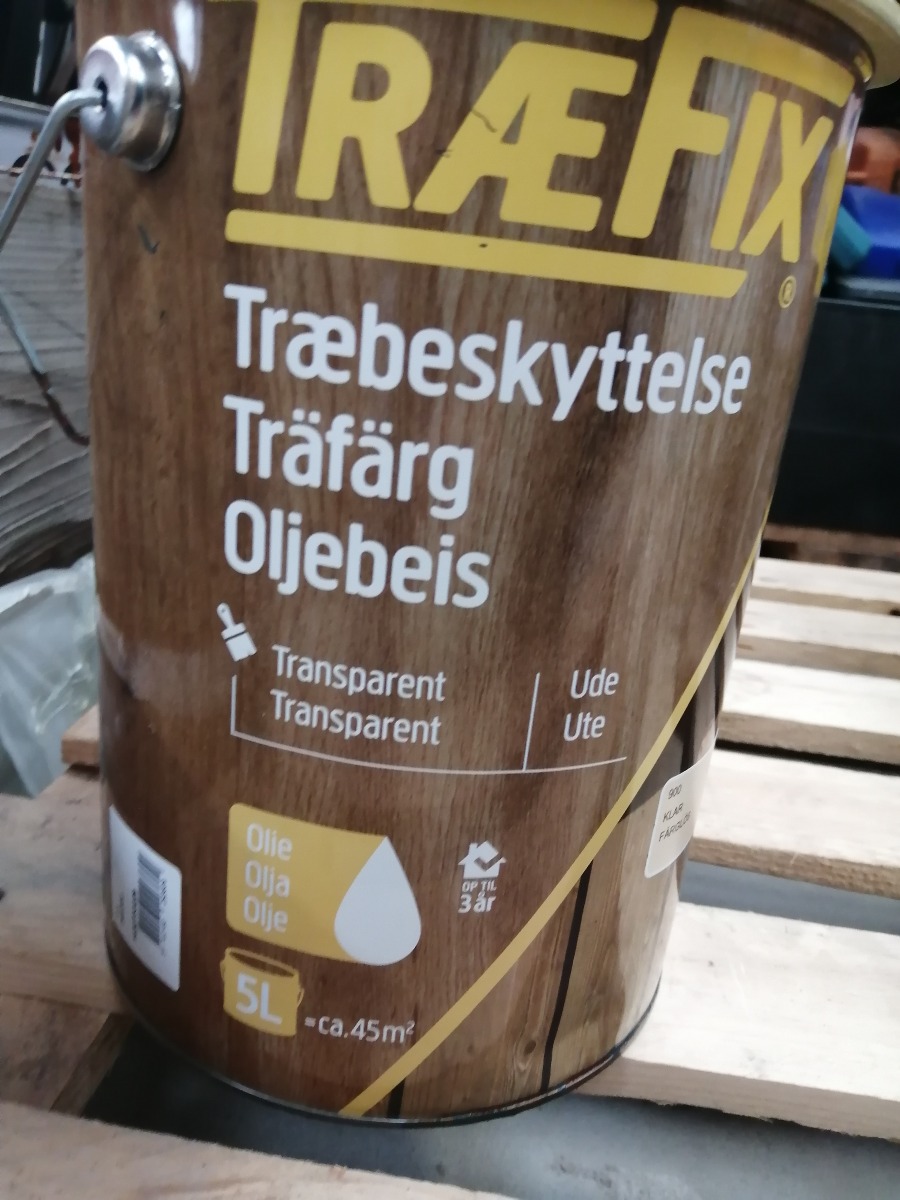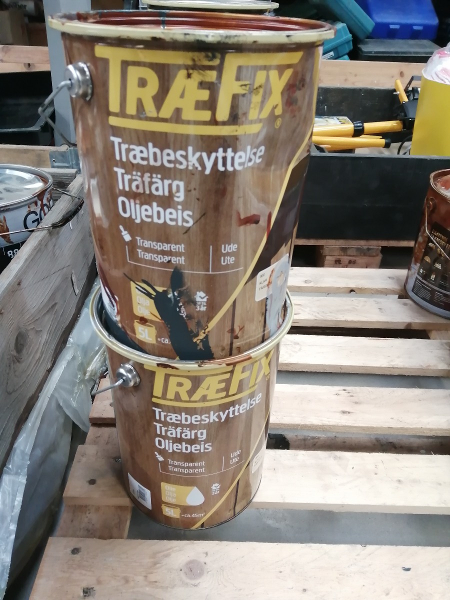 2 spande træfix træbeskyttelses maling, klar. De er uåbnede, men har været i uheld. Derfor har spandene maling, buler og mærker.