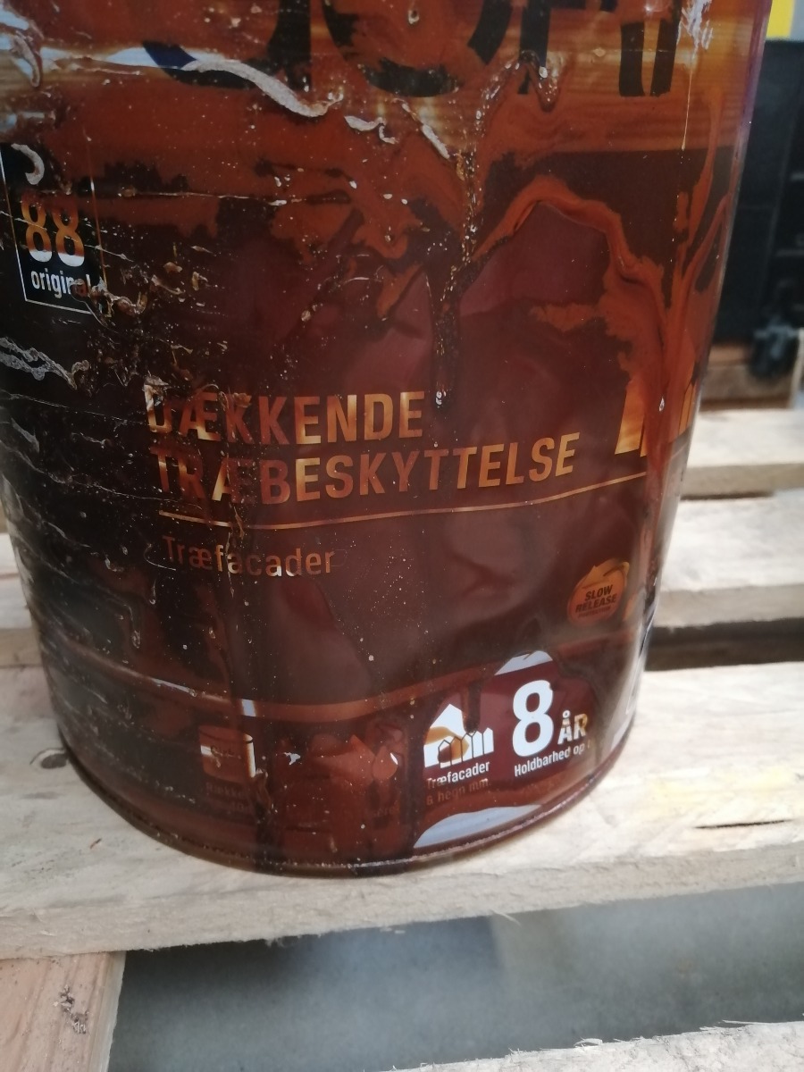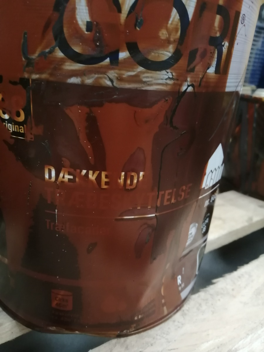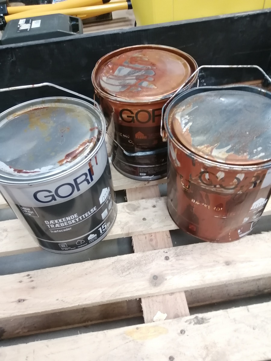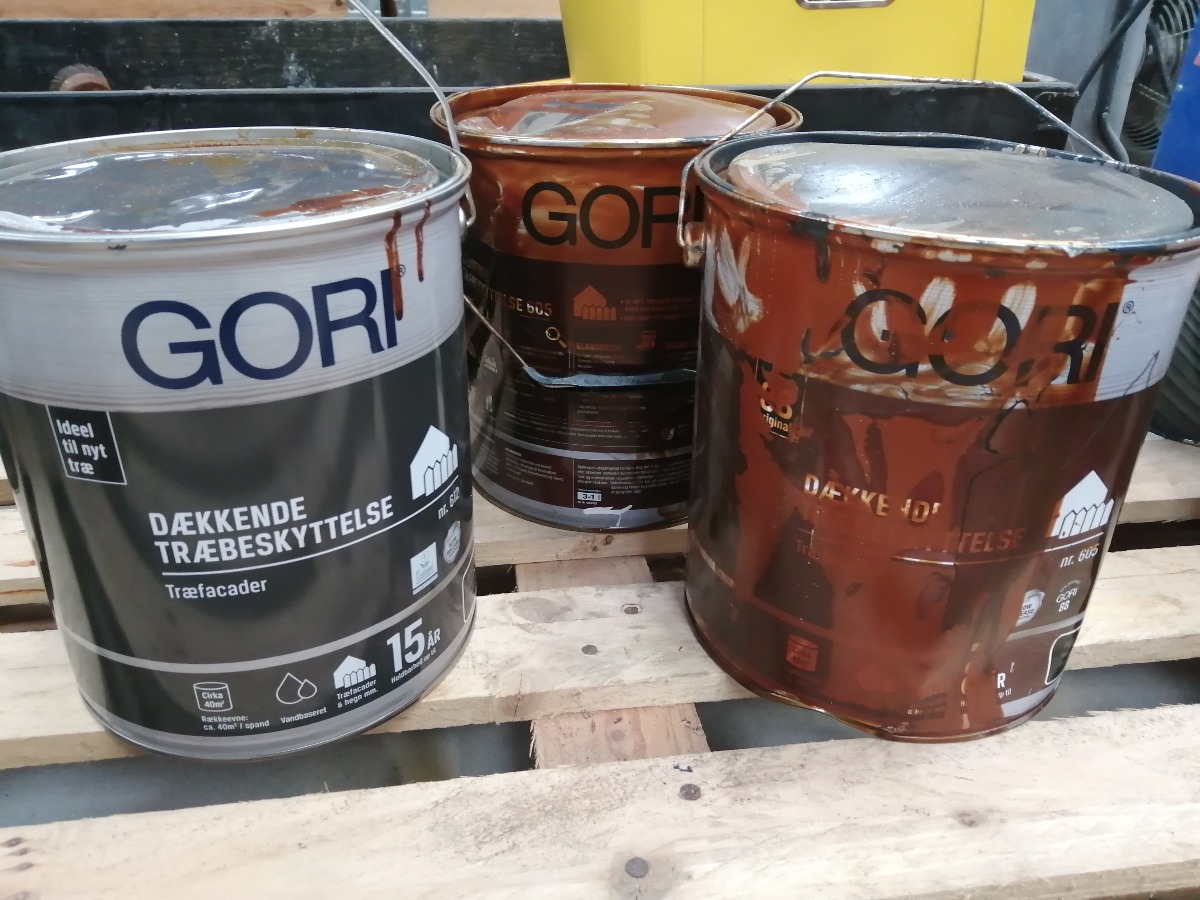 3 spande Gori træbeskyttelses maling. De er uåbnede, men har været i uheld. Derfor har spandene maling, buler og mærker.