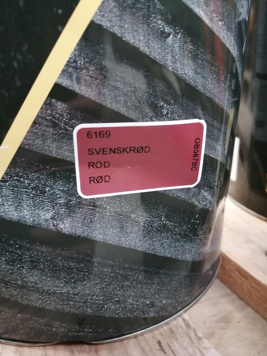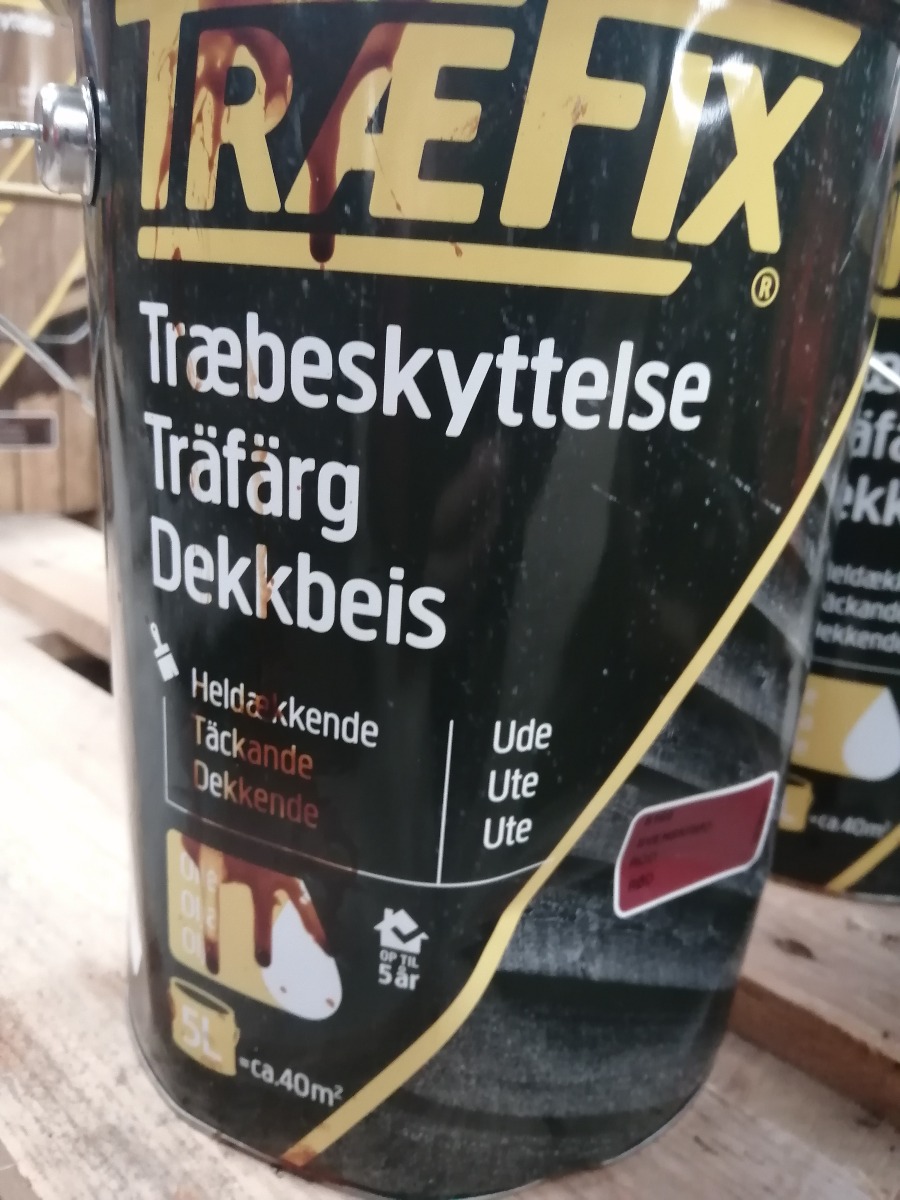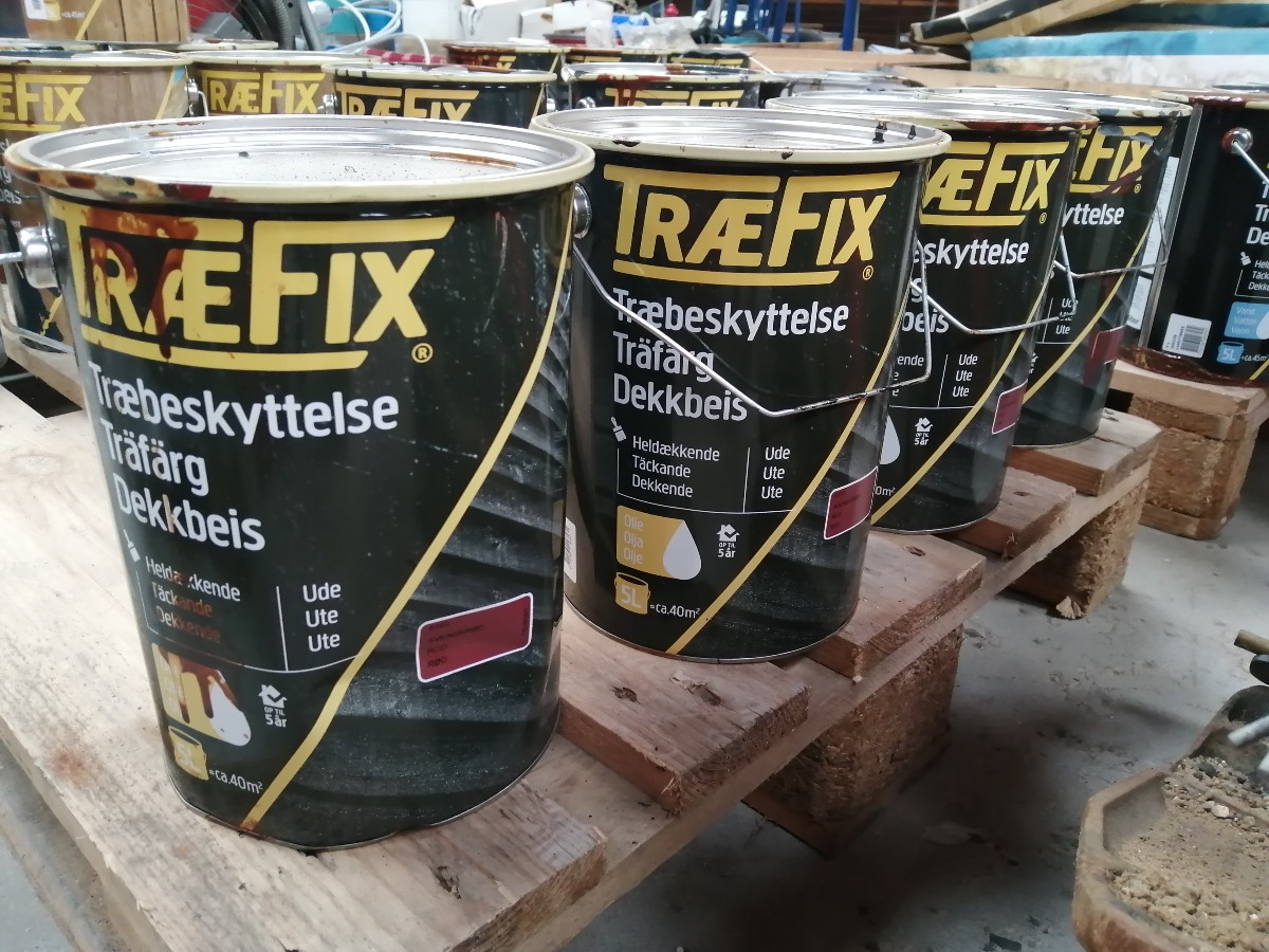 4 spande træfix træbeskyttelses maling, svenskrød. De er uåbnede, men har været i uheld. Derfor har spandene maling, buler og mærker.