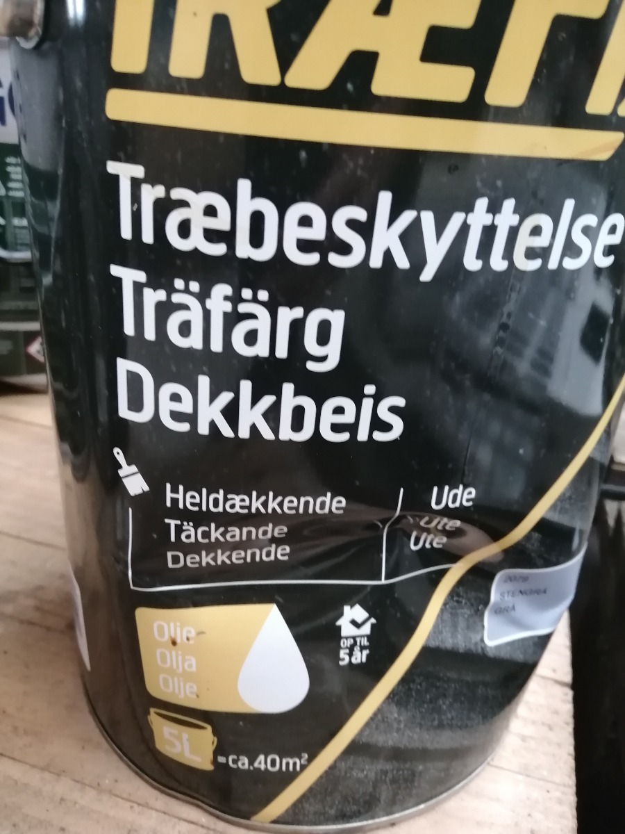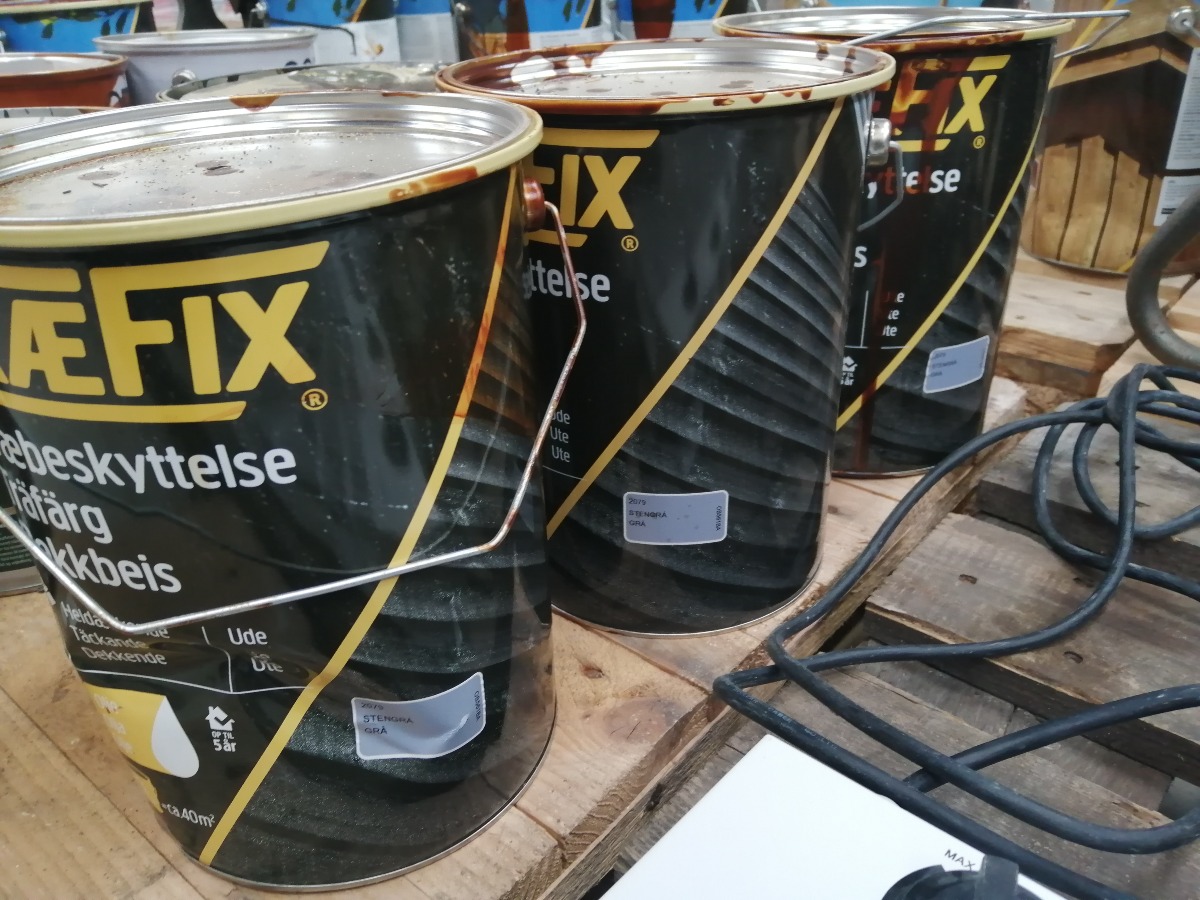 3 spande træfix træbeskyttelses maling, stengrå. De er uåbnede, men har været i uheld. Derfor har spandene maling, buler og mærker.