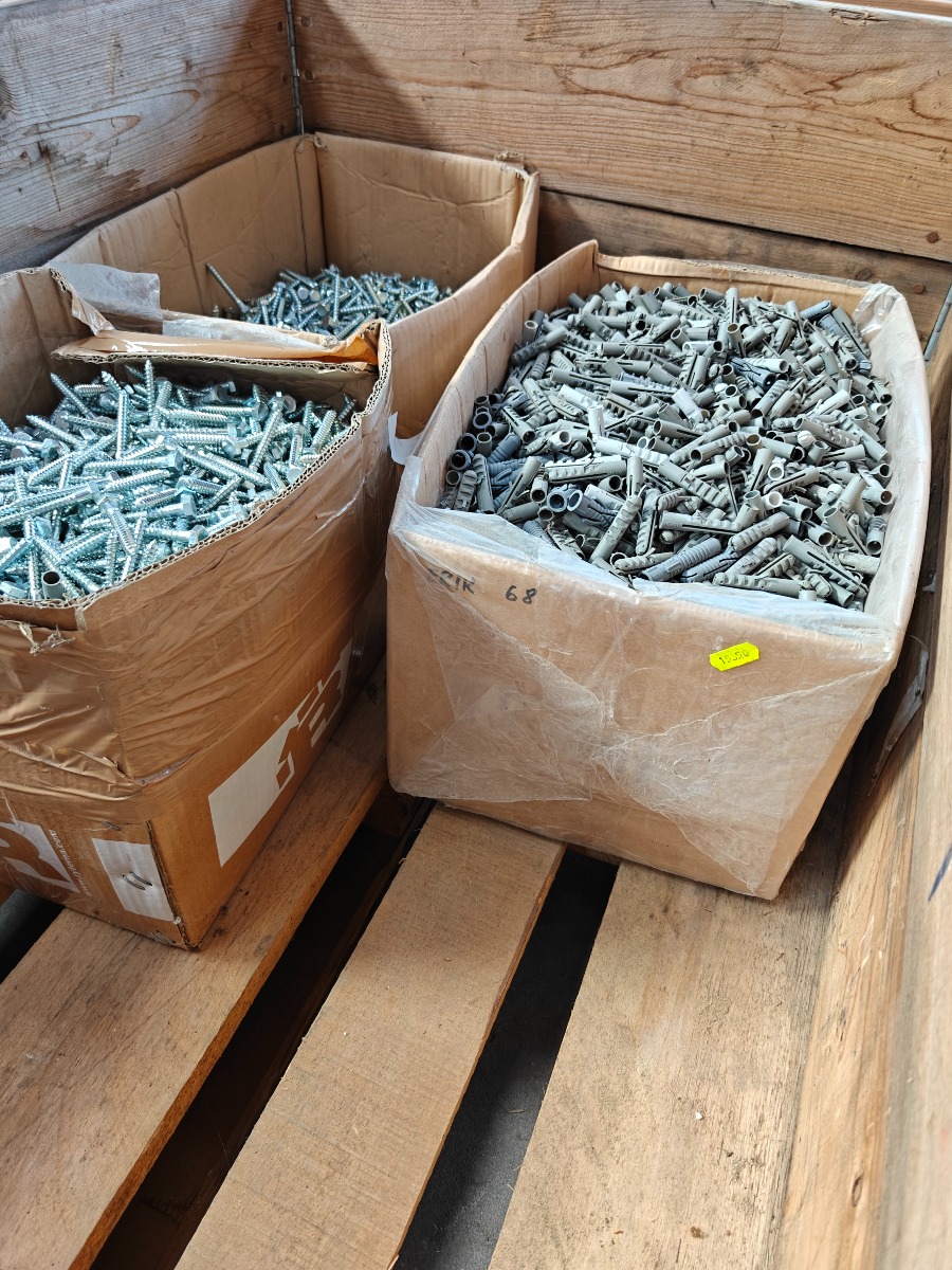 Parti franske skruer & ravplugs, 2 papkasser med skruer pap kasse med ravplugs