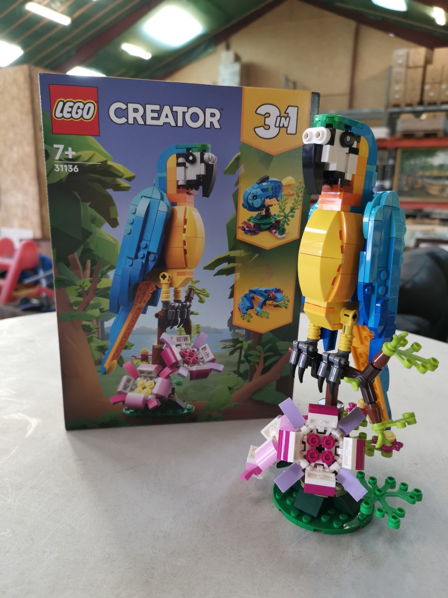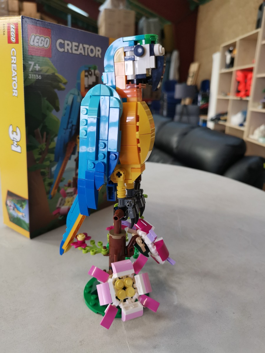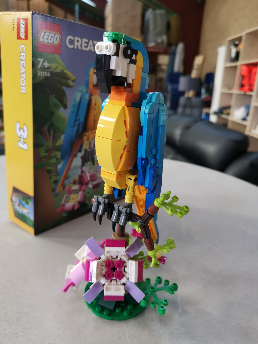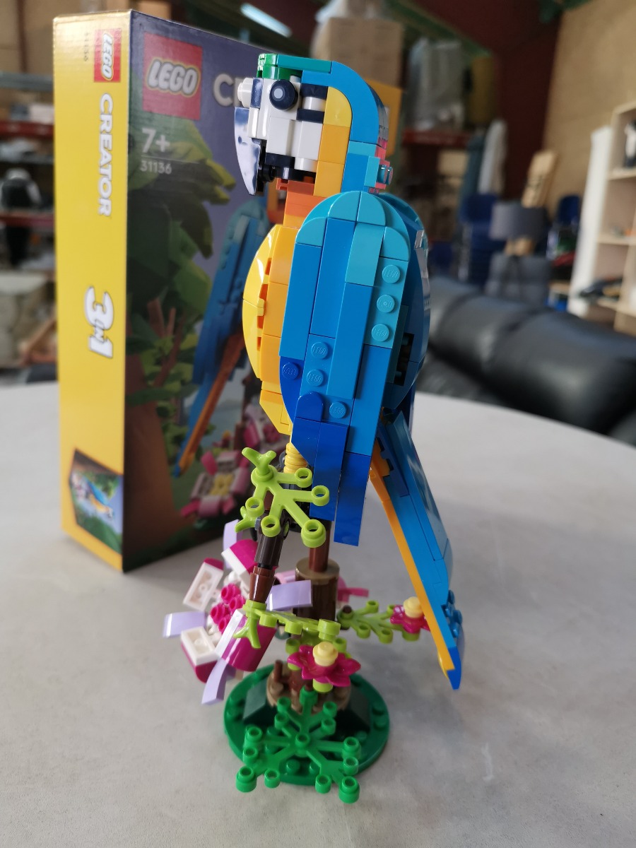 LEGO Eksotisk papegøje 31136. Genstanden er samlet. Vi garanterer ikke for eventuelle mangler. Æske medfølger og har en snært af røglugt. Umiddelbart forefindes alle samlemanualer.