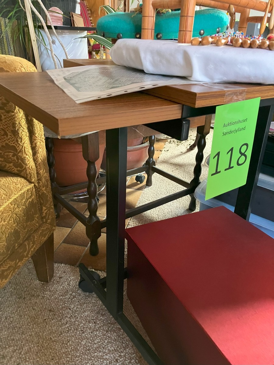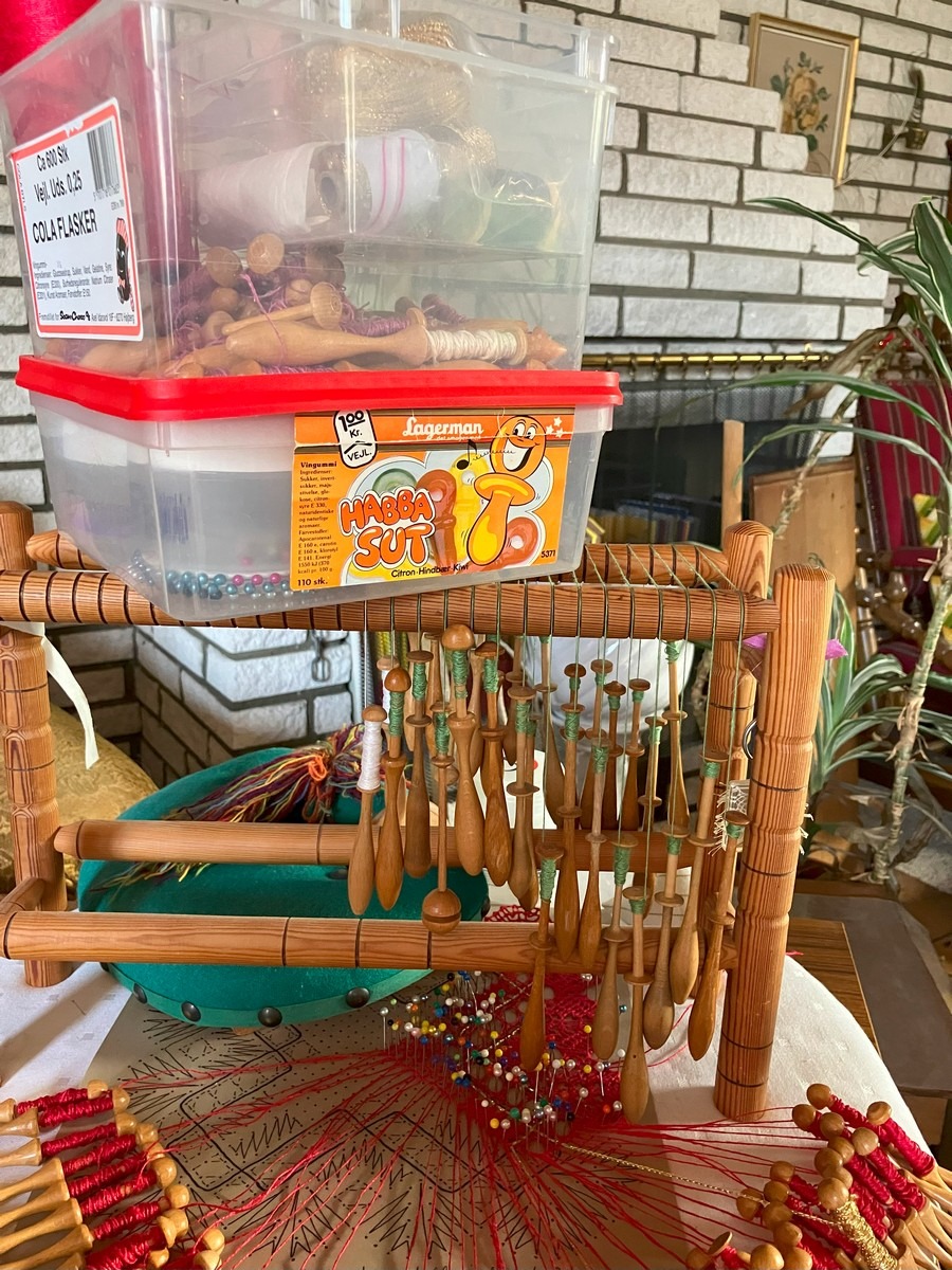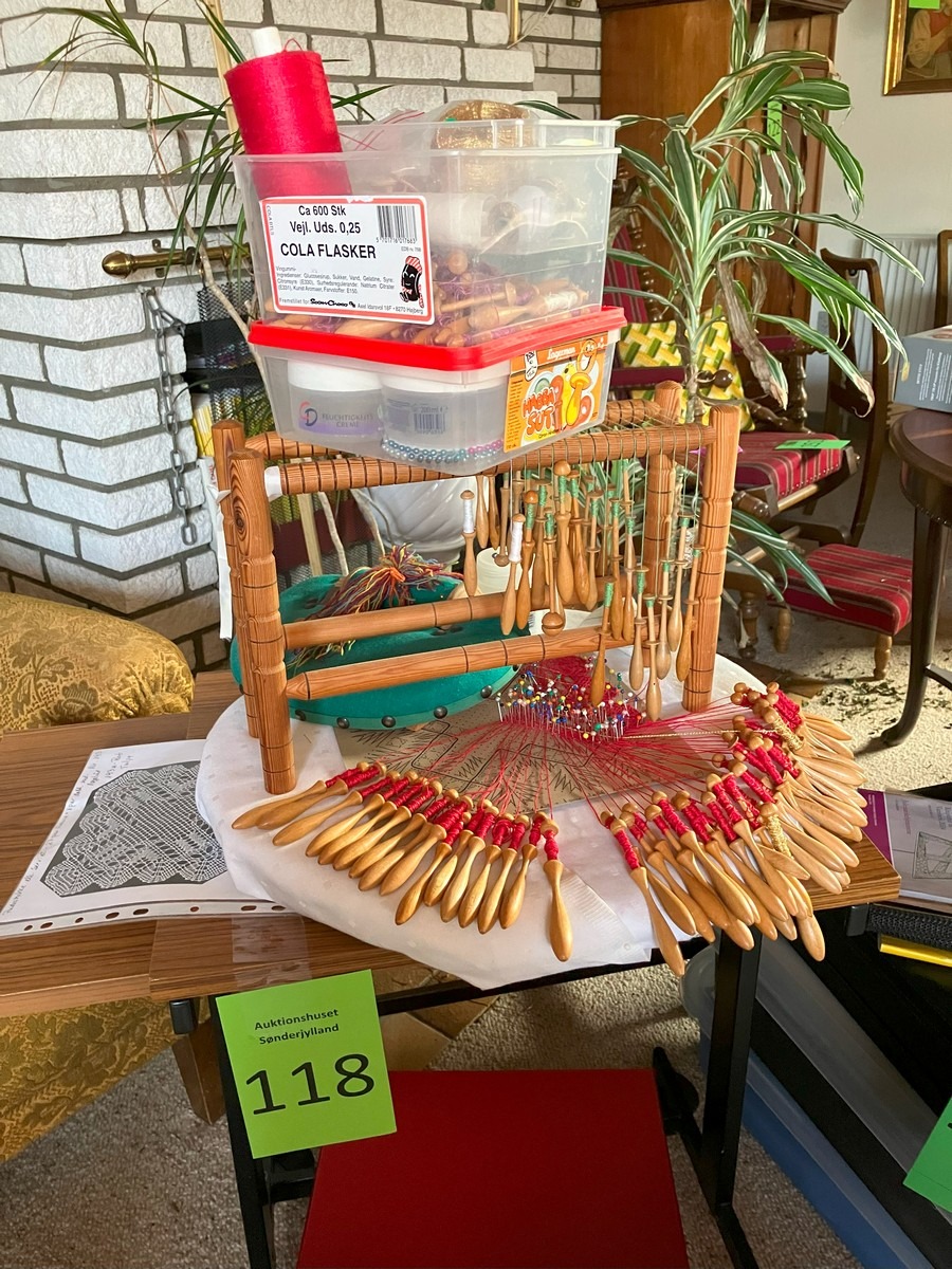 Står i 6780 Skærbæk. Kniplinge udstyr. Kniplepindeholder, ekstra pinde og tråd. Påbegyndt jule knipling. Med lille fin rulle bord med udtræk. Brugt. Fra dødsbo, MOMSFRI