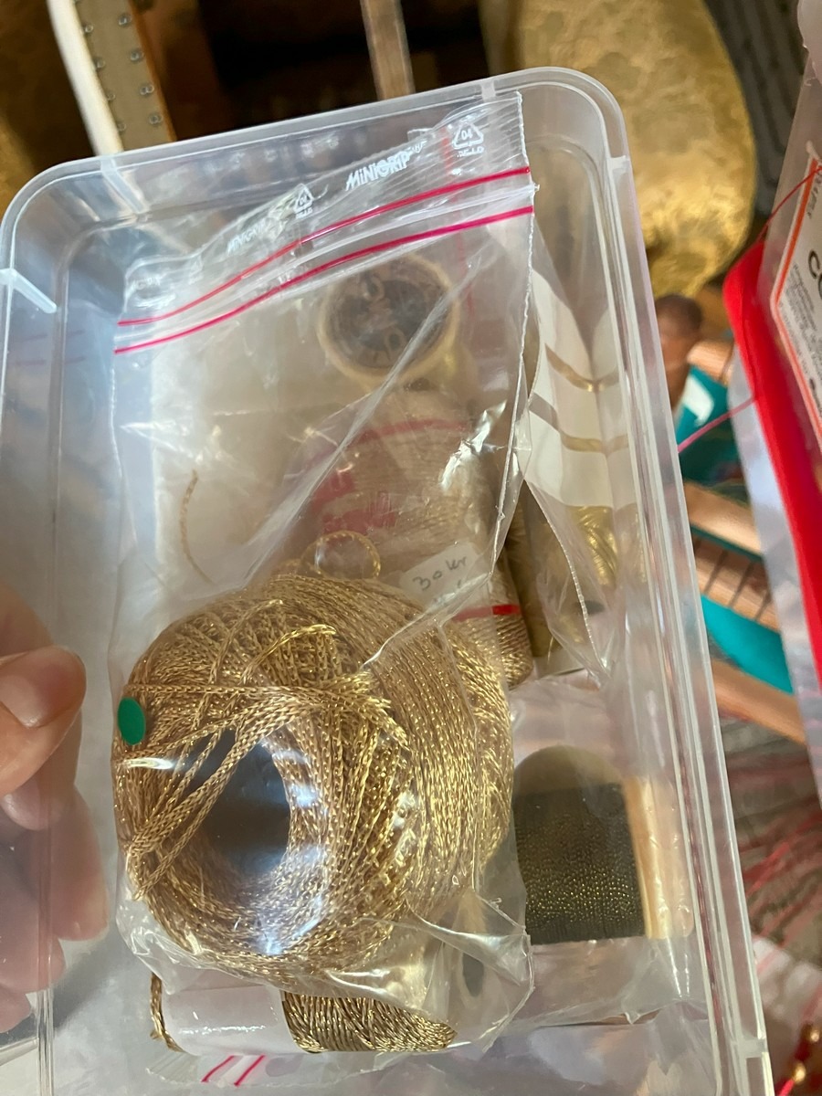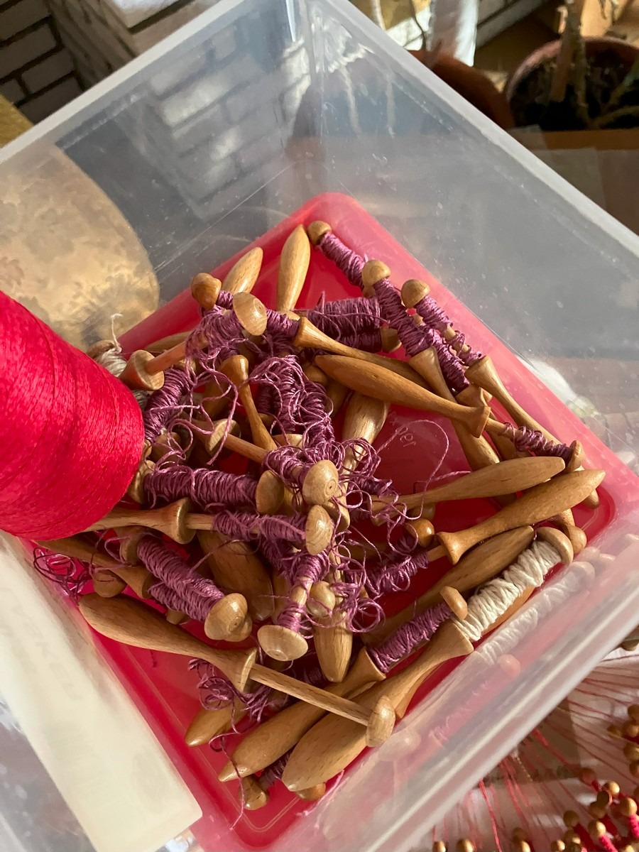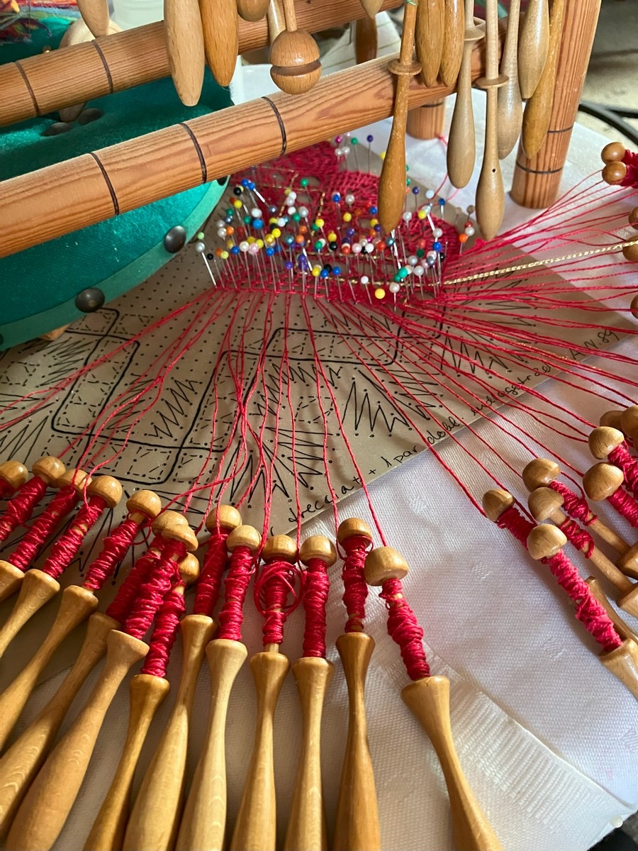 Står i 6780 Skærbæk. Kniplinge udstyr. Kniplepindeholder, ekstra pinde og tråd. Påbegyndt jule knipling. Med lille fin rulle bord med udtræk. Brugt. Fra dødsbo, MOMSFRI