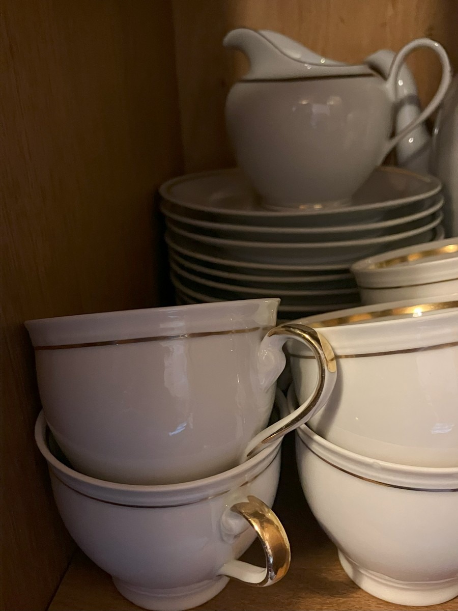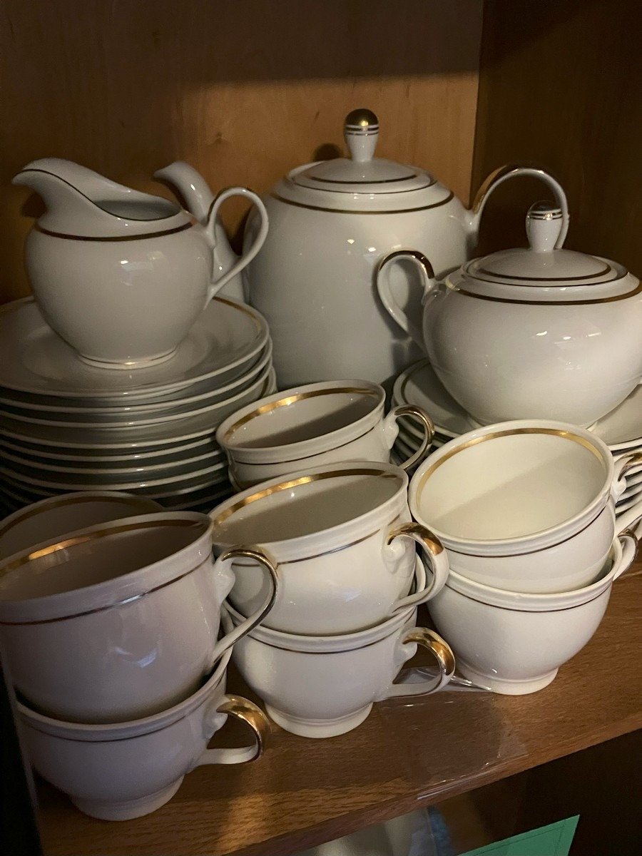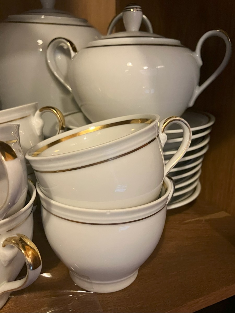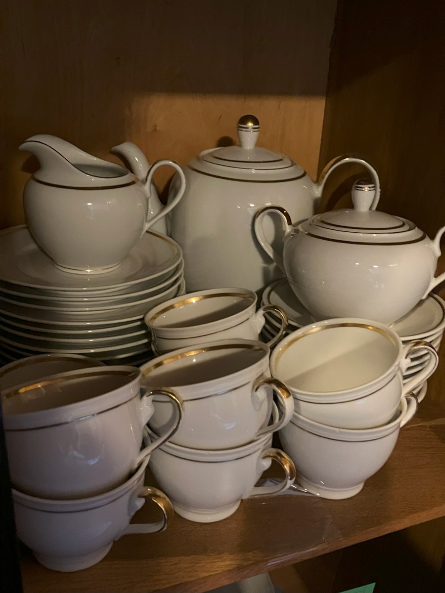 Står i 6780 Skærbæk. Triktis VEG kaffestel - hvid med guldkant. 8 sæt, med sukker, fløde, kaffekande og 3 stk. fade (dog andet mærke). Brugt. Fra dødsbo, MOMSFRI