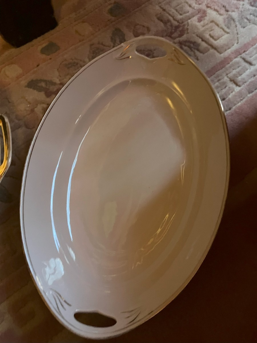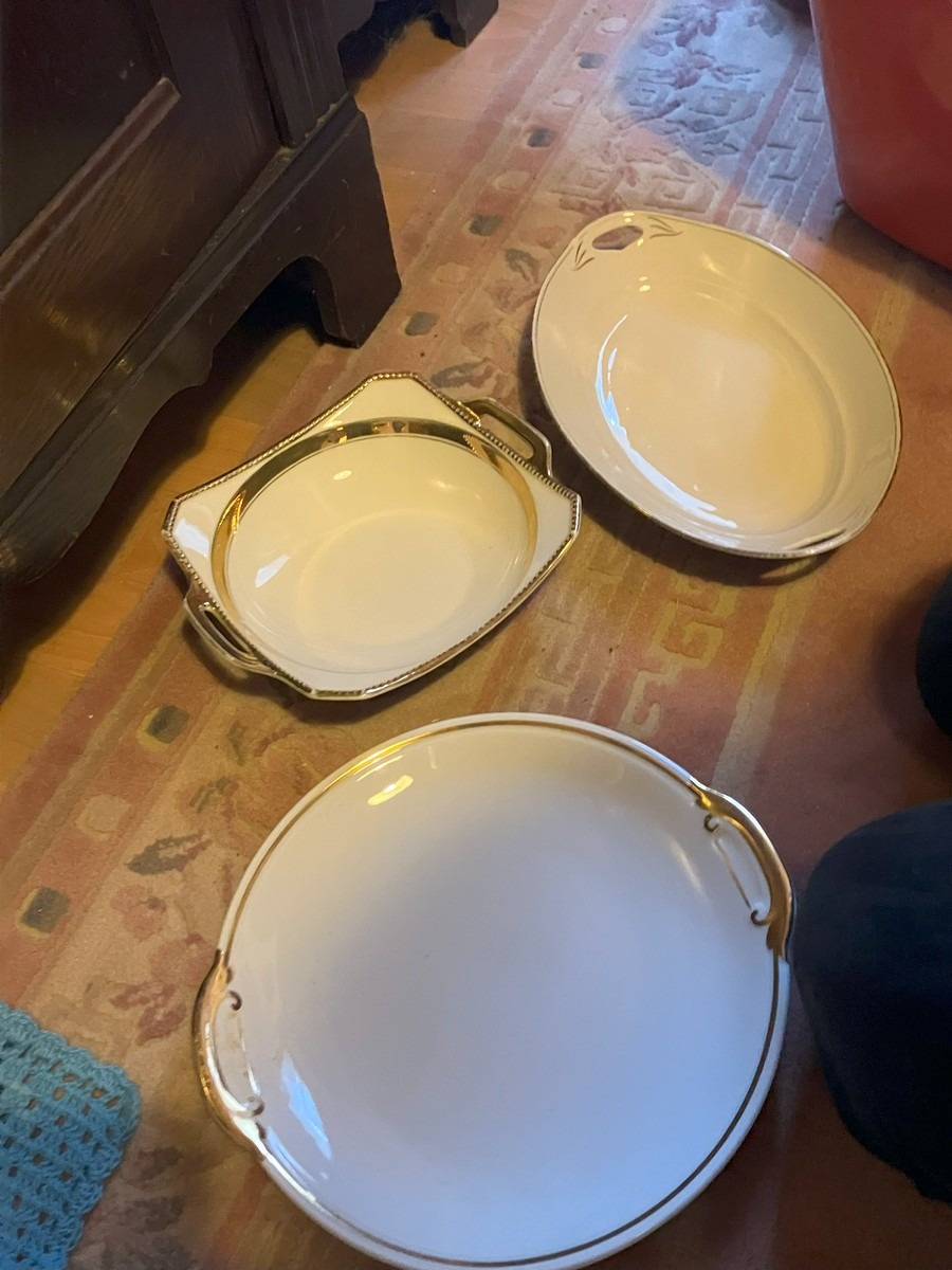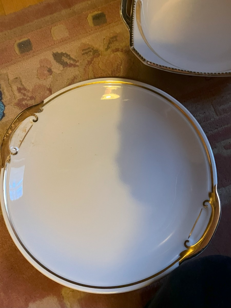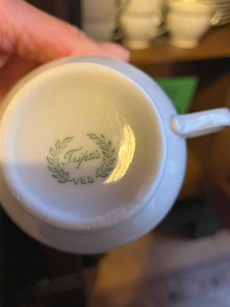 Står i 6780 Skærbæk. Triktis VEG kaffestel - hvid med guldkant. 8 sæt, med sukker, fløde, kaffekande og 3 stk. fade (dog andet mærke). Brugt. Fra dødsbo, MOMSFRI