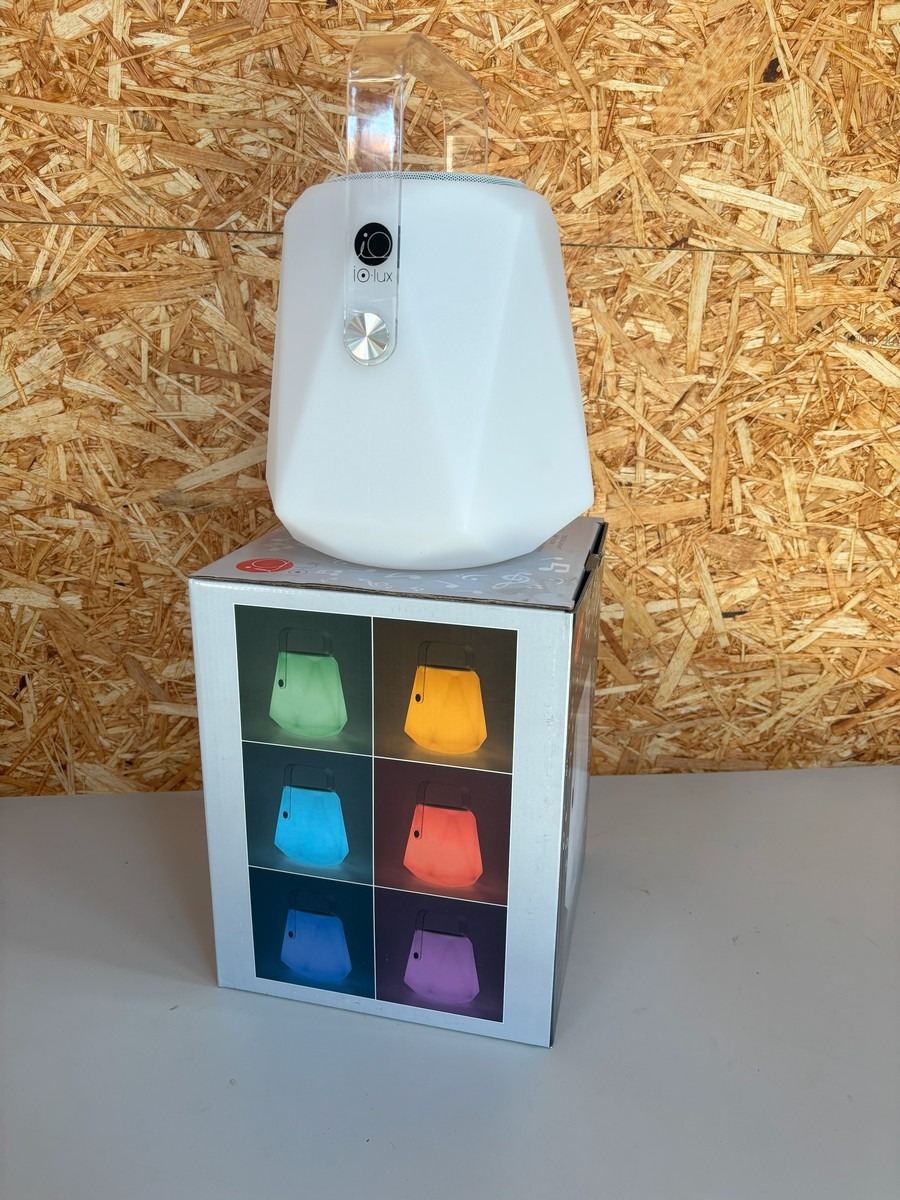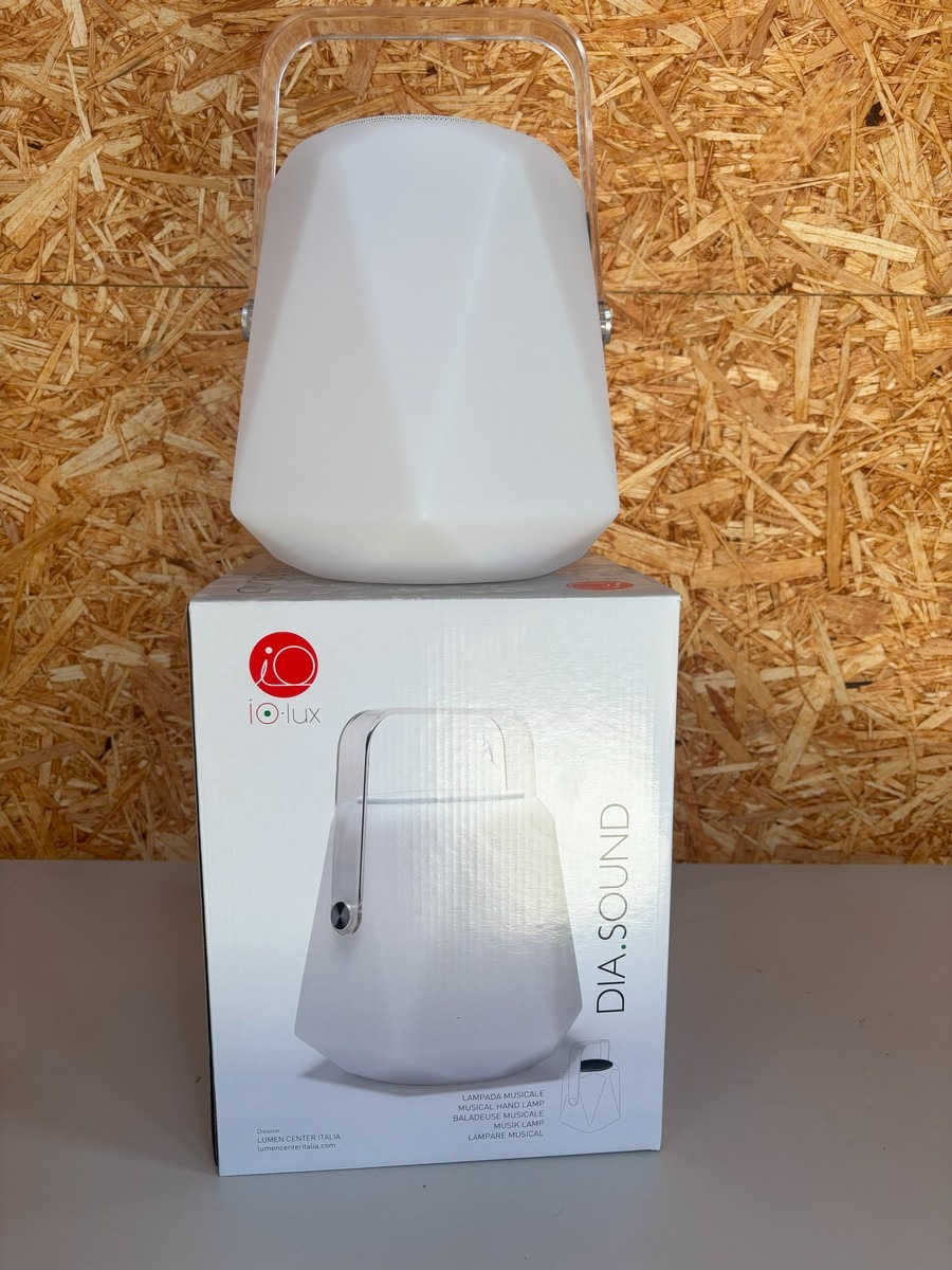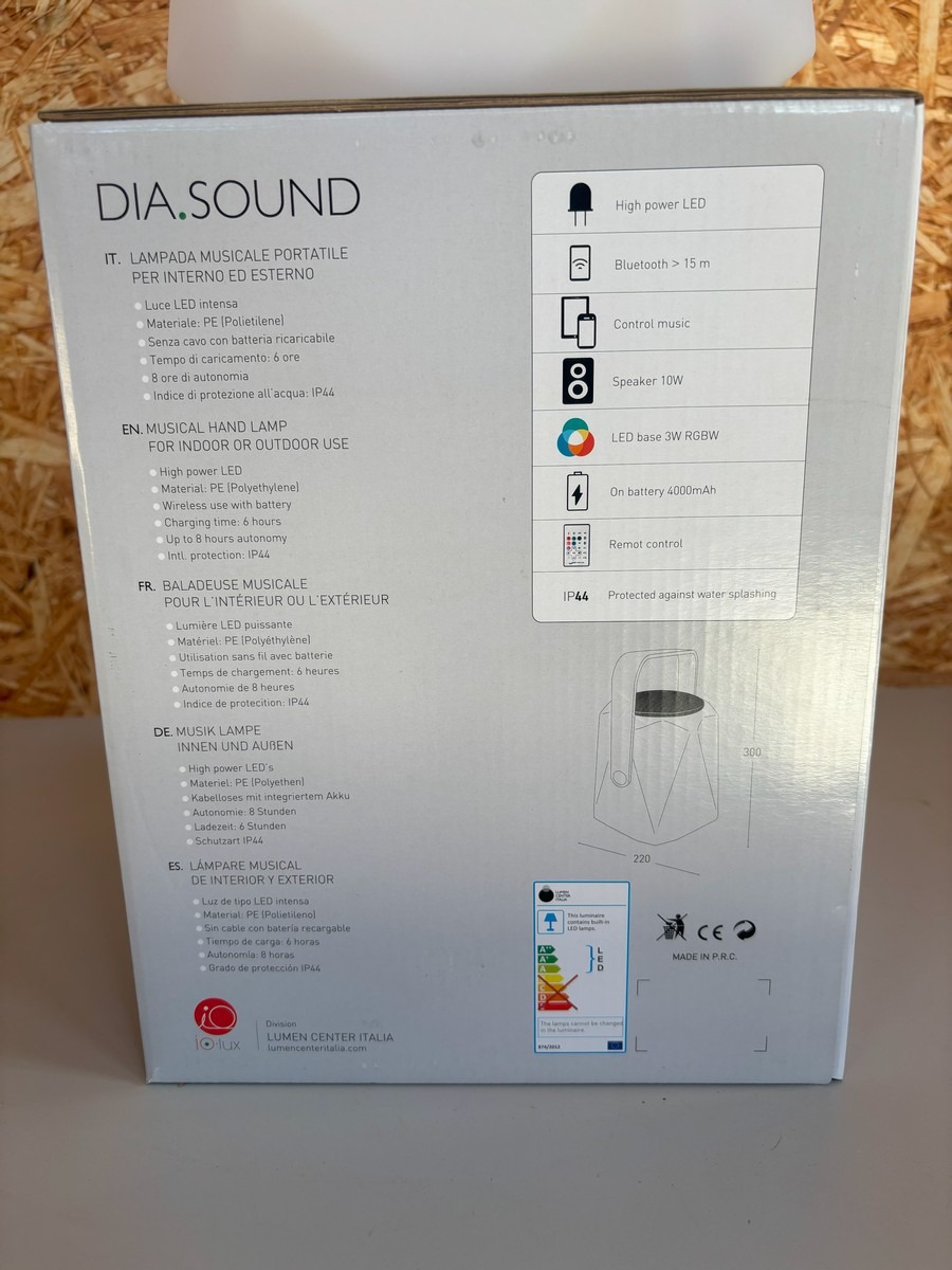 DIA.SOUND diamant højtaler / lampe m fjernbetjening. Lampen kan indstilles i forskellige farver med den medfølgende fjernbetjening og farverne kan følge rytmen af musikken, som bliver afspillet via bluetooth. Den kan både bruges inde- og udendørs. Kan spille og lyse op til 8 timer. Oplader medfølger. Den måler 22 x 30 cm. Nypris 1.095, - kr. Ubrugt, i original emballage