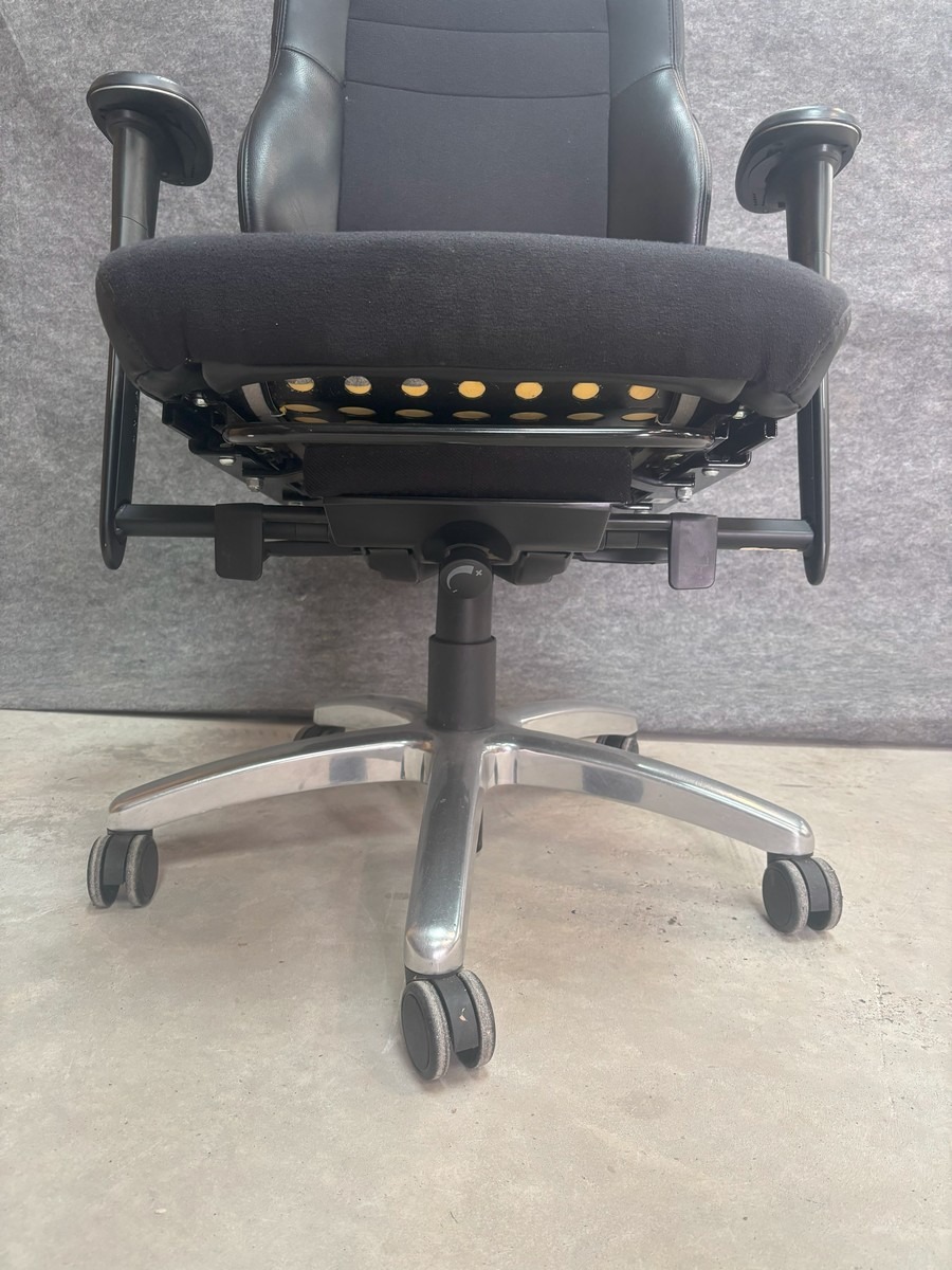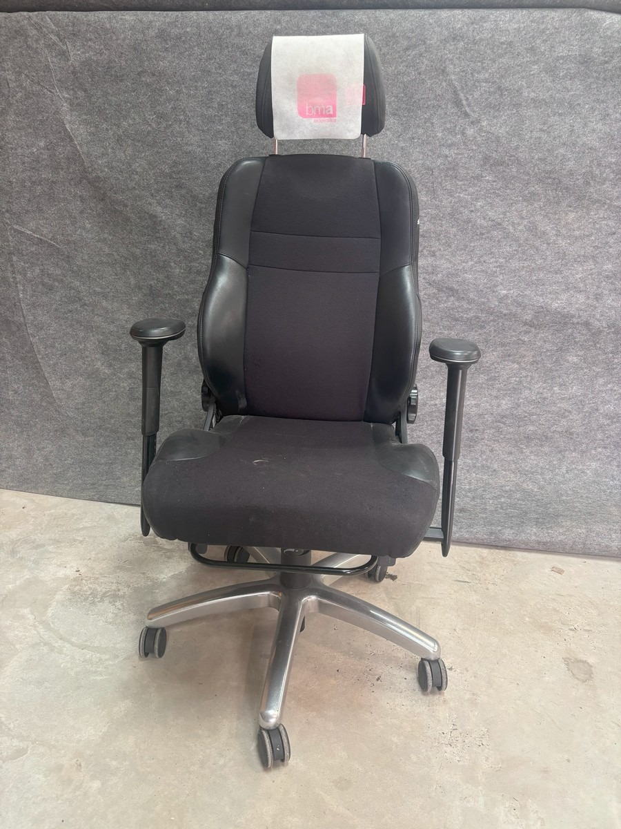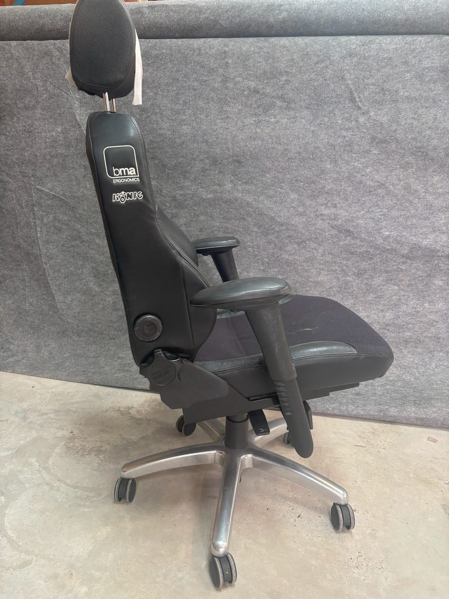 BMA Ergonomics König kontorstol, den er robust og kan klare en maxbelastning på 200 kg. Den har en kraftig, smudsafvisende polstring samt mange justérbare indstillinger, der nemt og hurtigt kan betjenes, og som sikrer brugeren en god komfort og ergonomisk siddestilling. Brugt og med diverse brugsspor. MOMSFRI