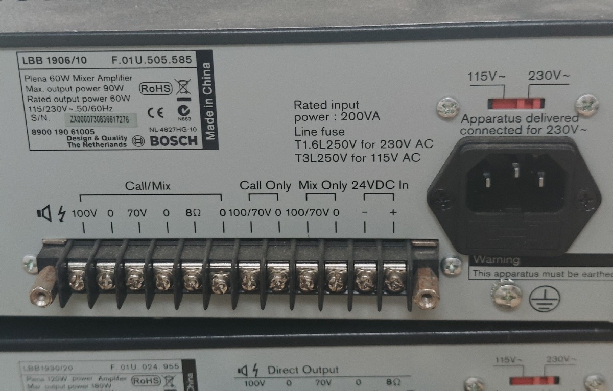 Plena mixer Amplifier & Plena Amplifier. Mrk Bosch. Model: Plena 60W Mixer Amplifier: LBB 1906/10. Plena 120W Power Amplifier: LBB 1930/20