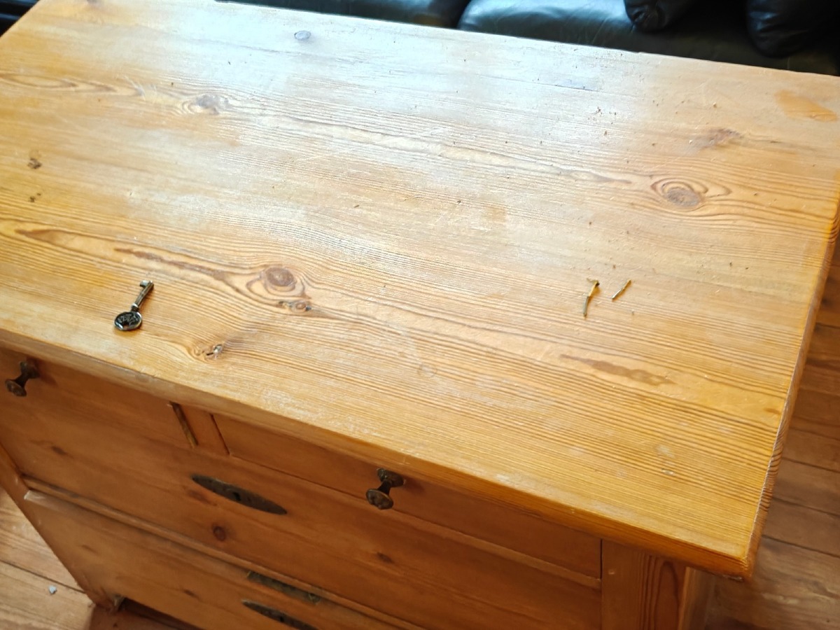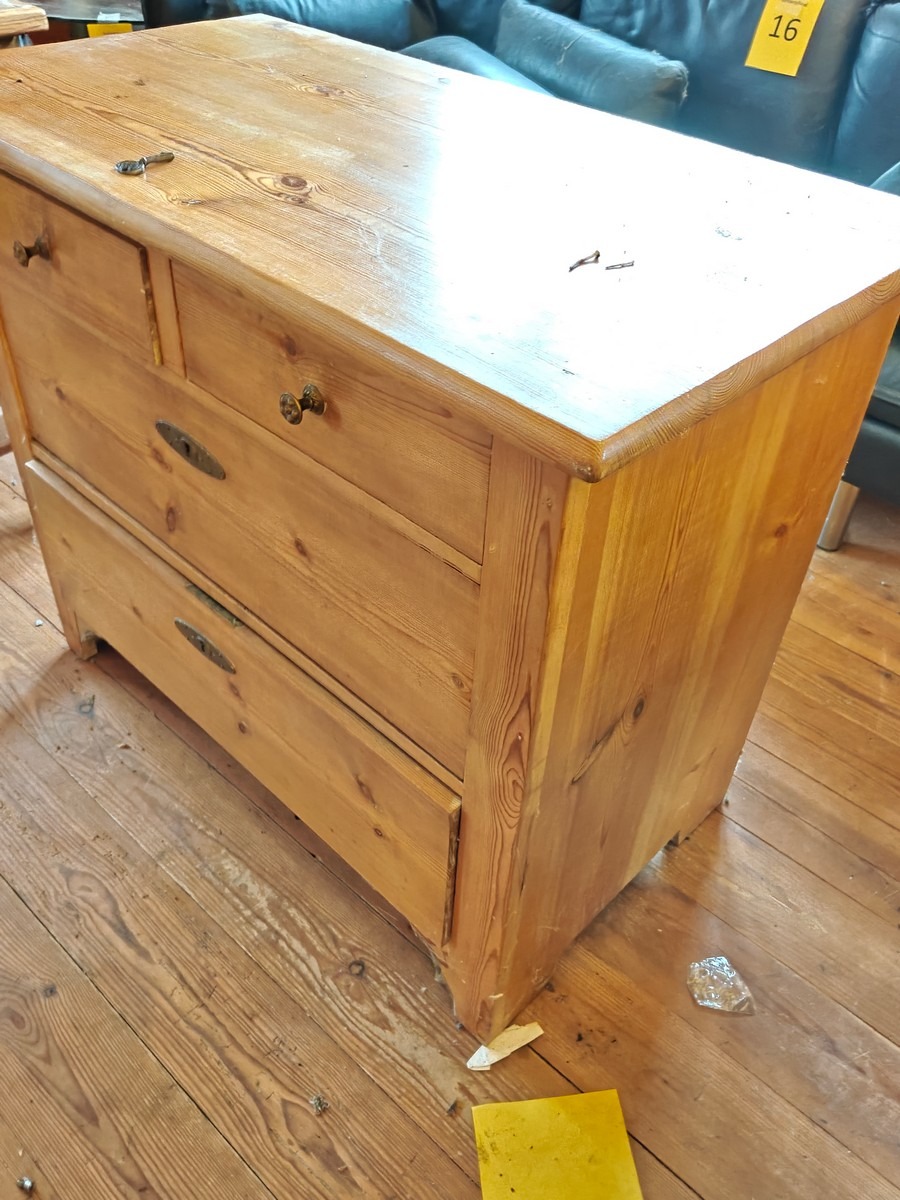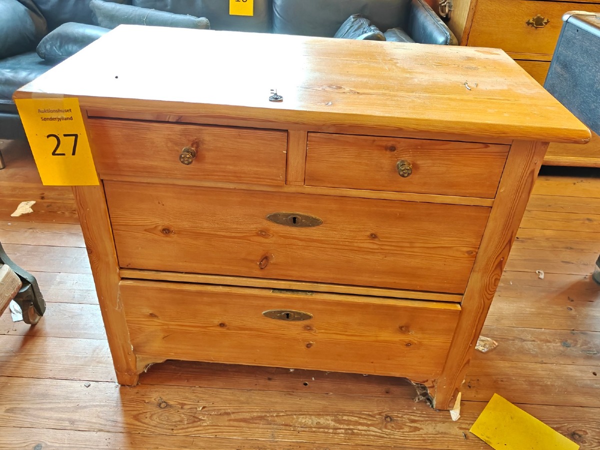 Afsyret antik kommode i fyrretræ. Måler 92 x 50 x 78 høj. I ok stand, trænger til rengøring. Fra dødsbo.