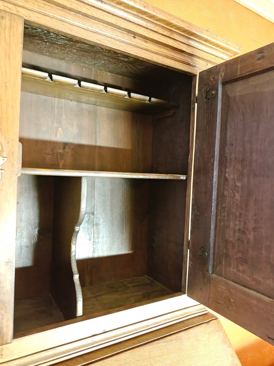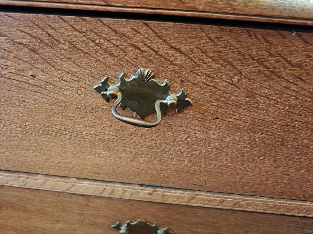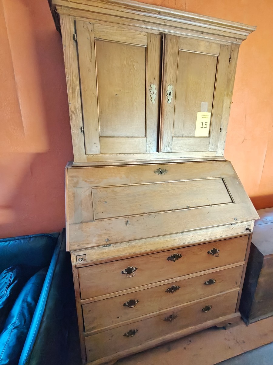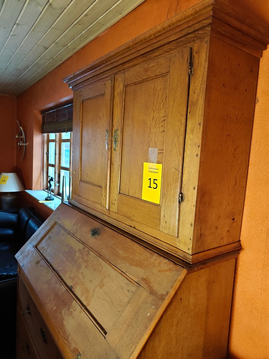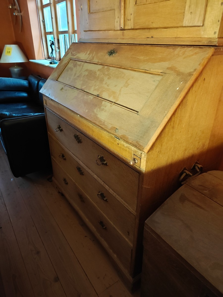 Afsyret antikt chartol i fyrretræ med overskab og 4 skuffer. Måler 200 x 112 bred x 57 dyb. I ok stand, trænger til rengøring. Fra dødsbo.