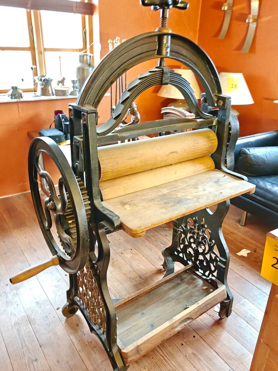 Antik tøjruller. Måler 88 x 60 x 150 cm høj. I ok stand, trænger til rengøring. Fra dødsbo.