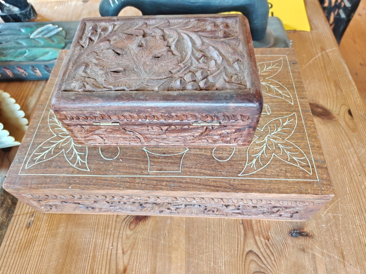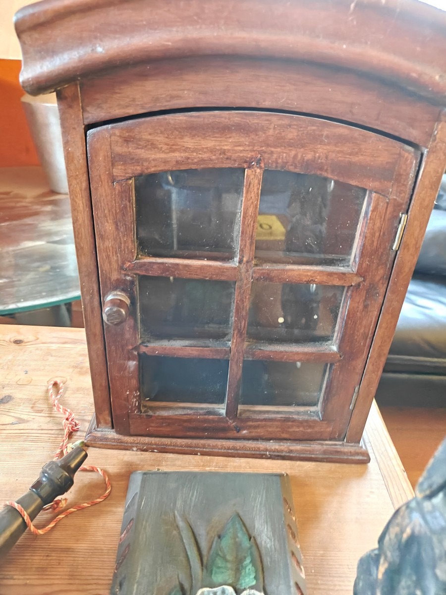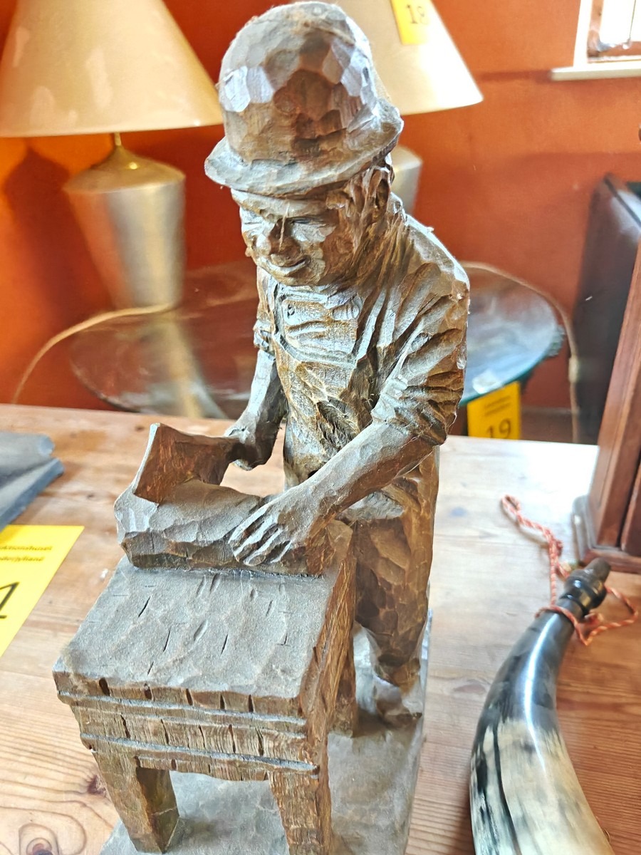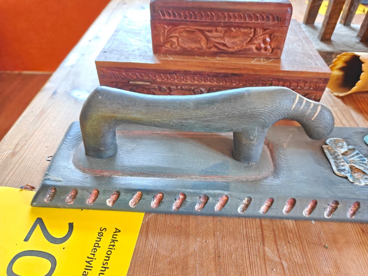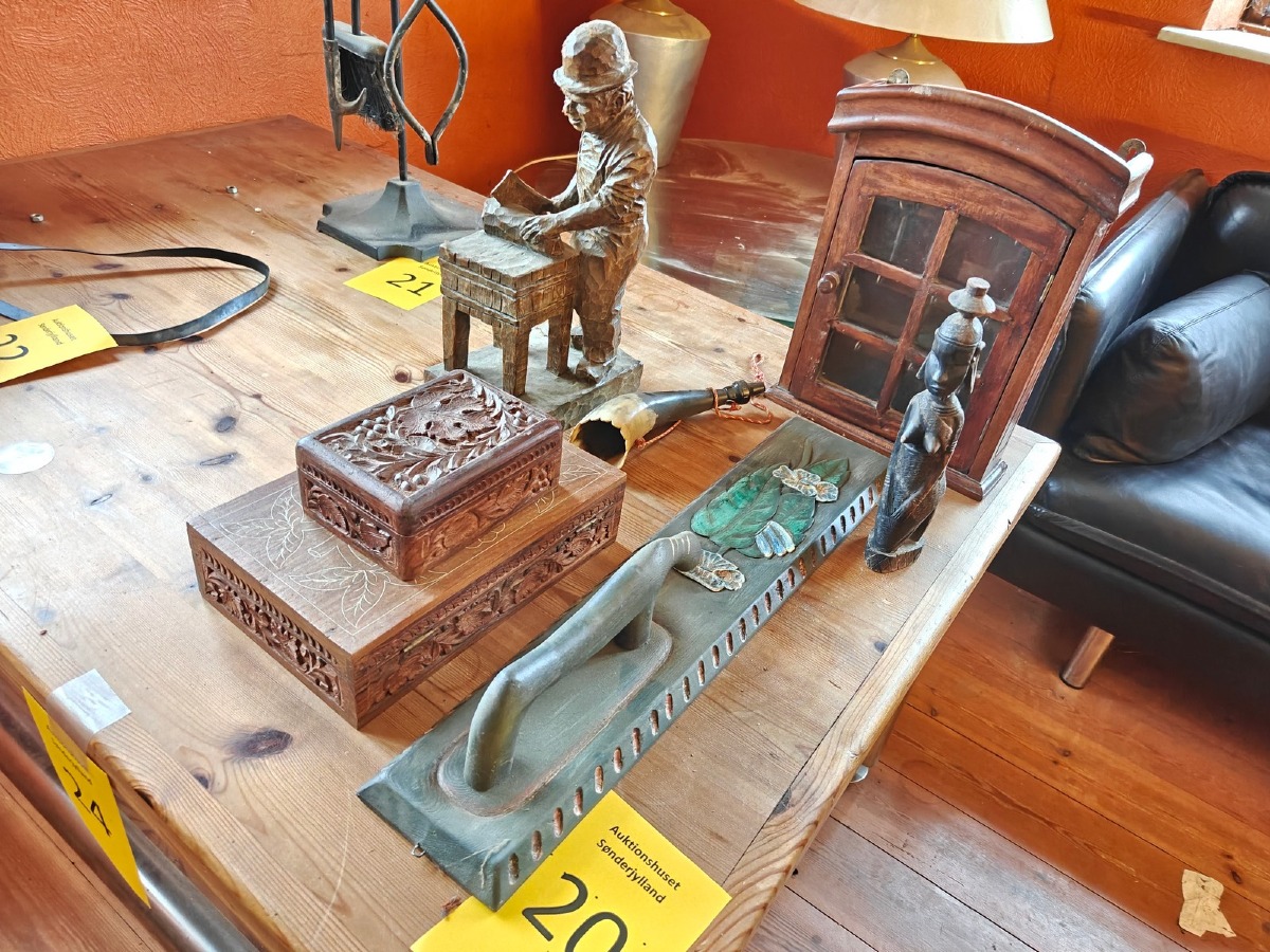 Antikke trævarer. Slagter figur, trææsker, nøgleskab m.m. Måler mellem 28 cm x cm lang. I ok stand, trænger til rengøring. Fra dødsbo.