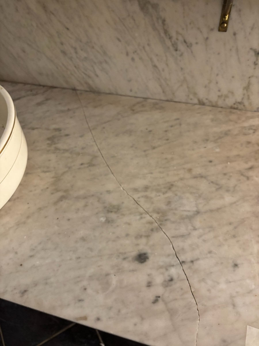 Antikt vaskebord med servantesæt. Vaskebordet har marmoplade, men den er knækket. Måler 91 x 51 x  72cm høj. I ok stand, trænger til rengøring. Fra dødsbo.