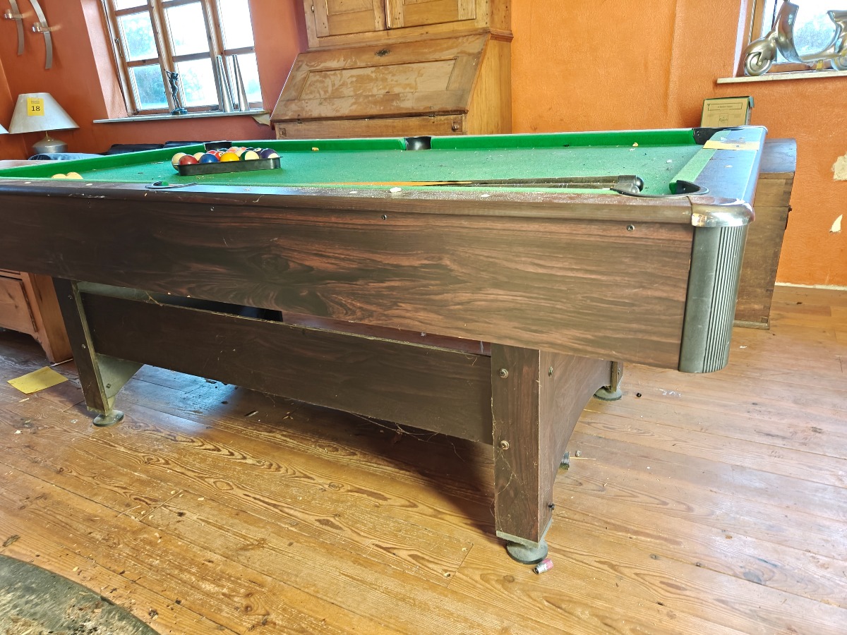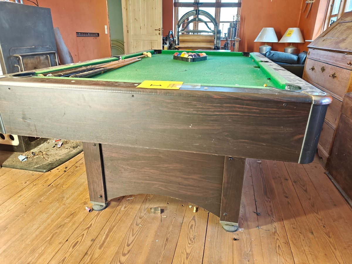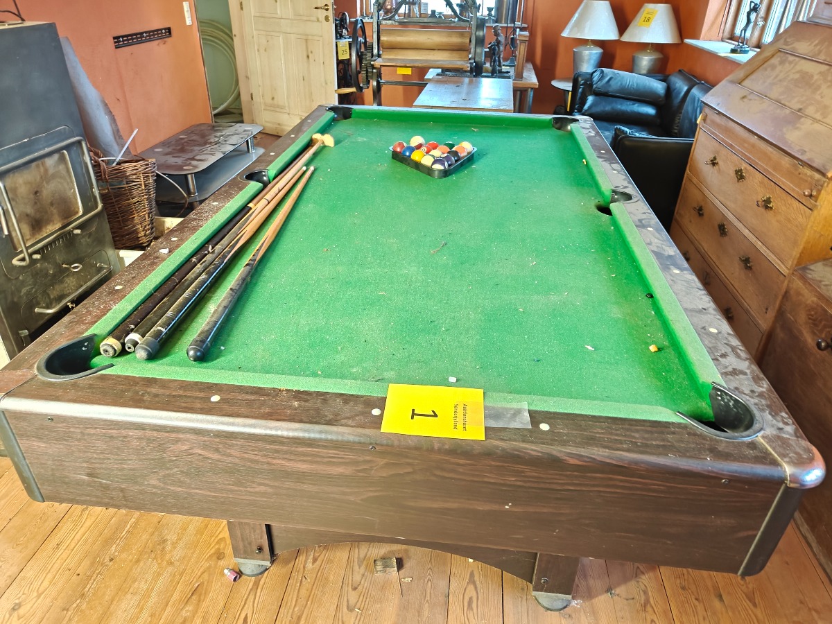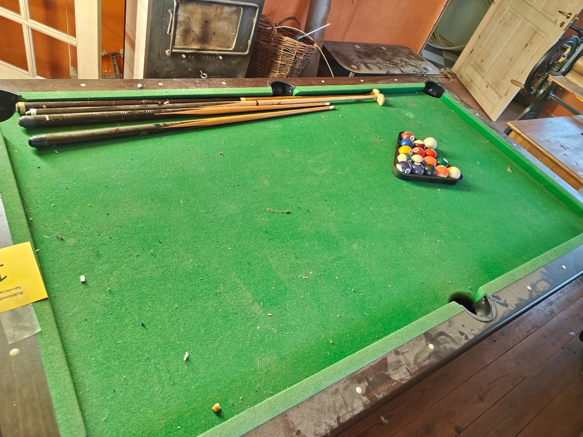 Billiard bord med kugler og køer. Måler 2,14 x 1,20 x  81 høj. I ok stand, trænger til rengøring. Fra dødsbo.