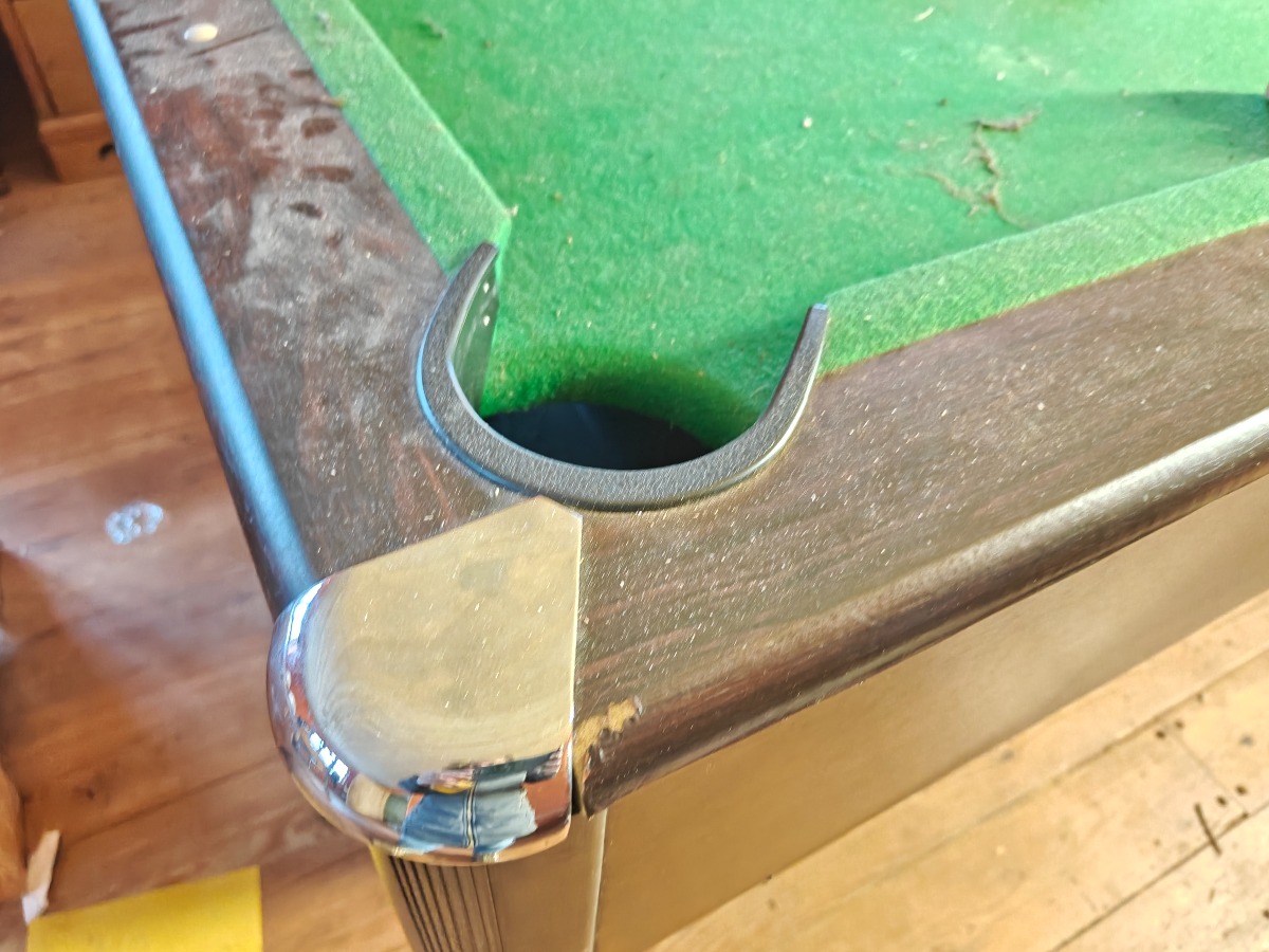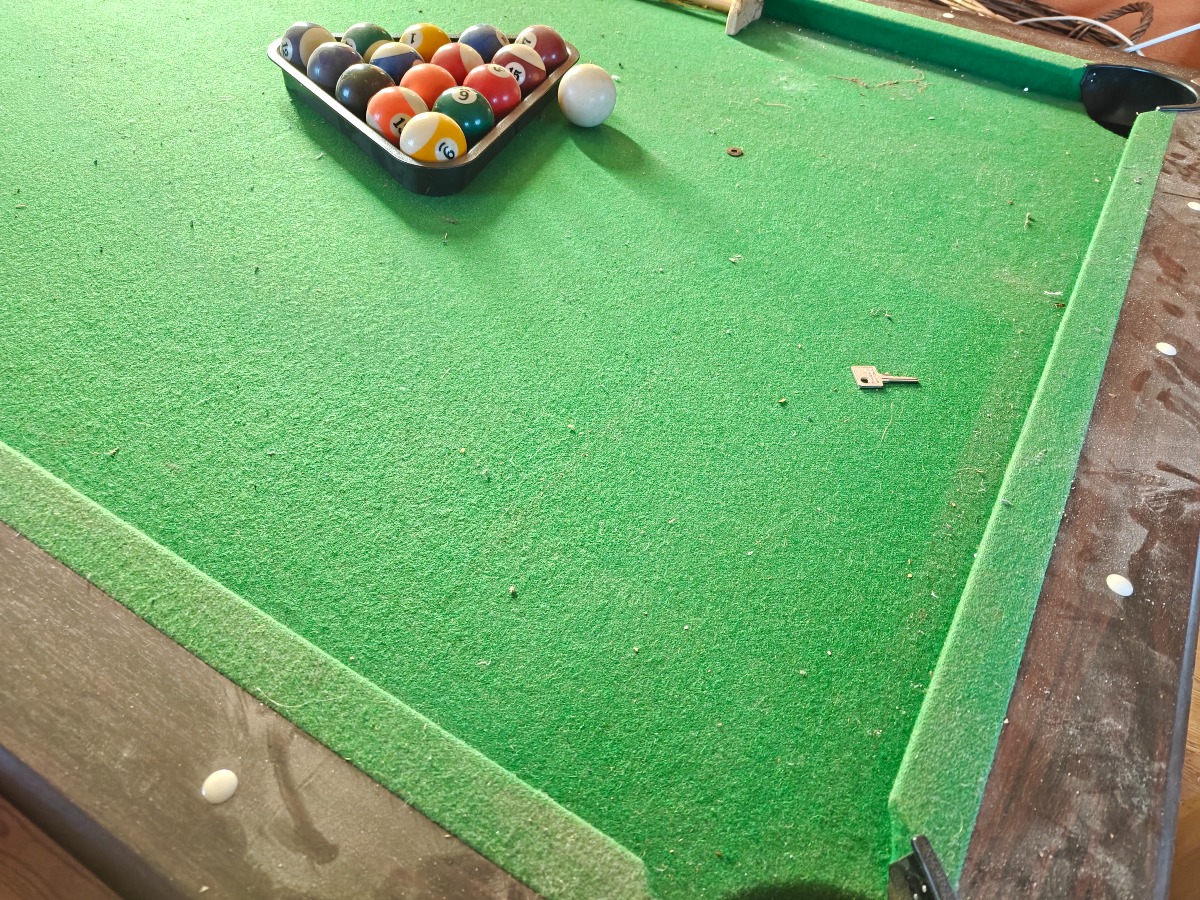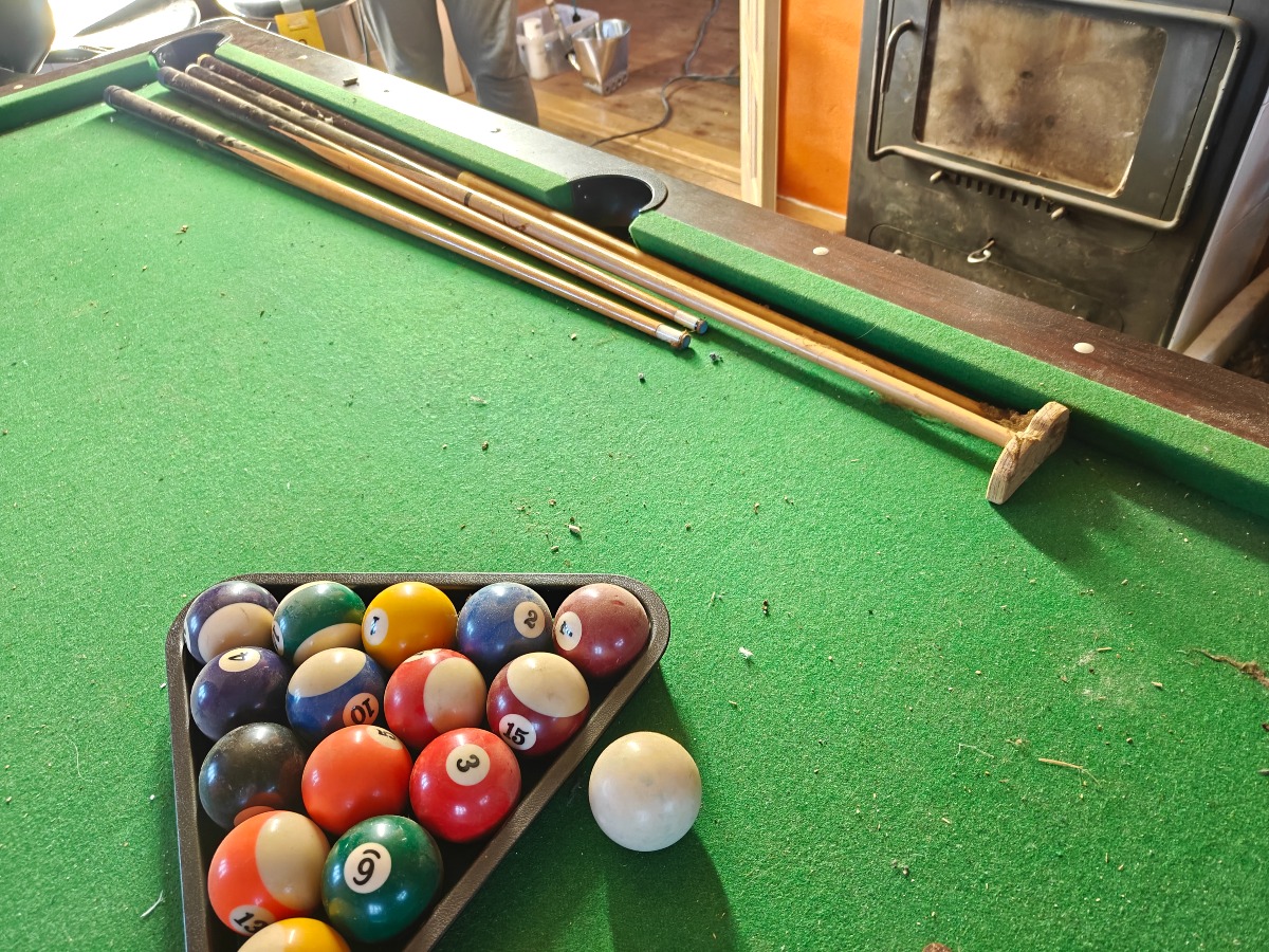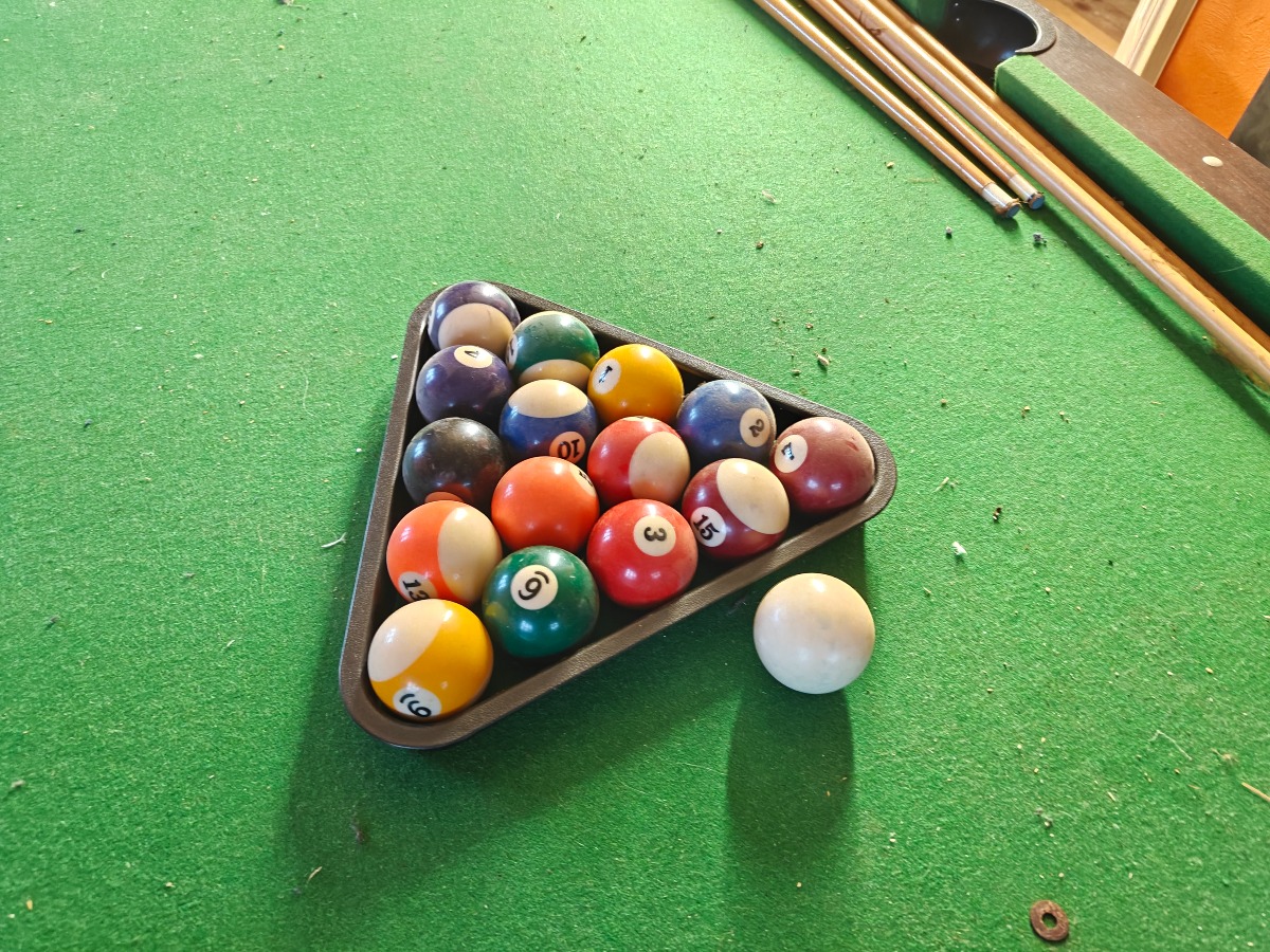 Billiard bord med kugler og køer. Måler 2,14 x 1,20 x  81 høj. I ok stand, trænger til rengøring. Fra dødsbo.