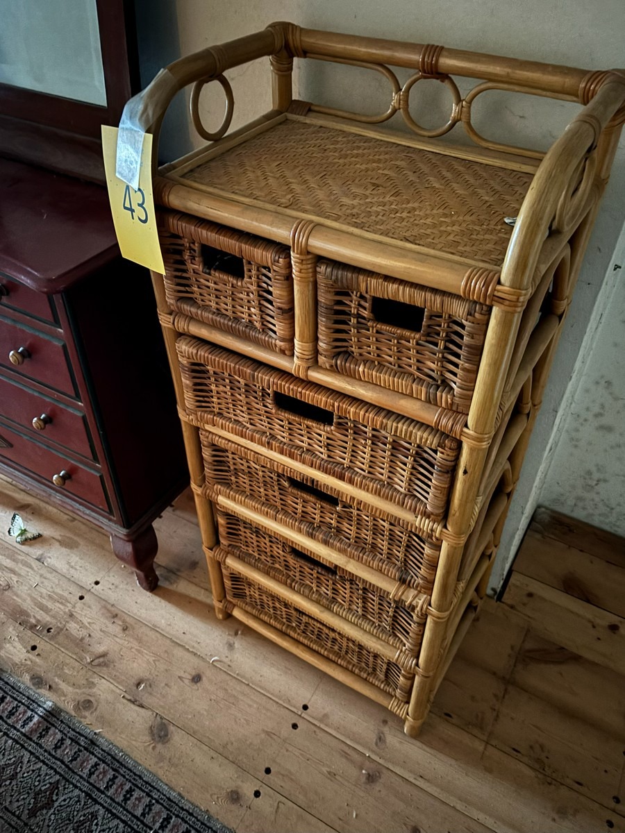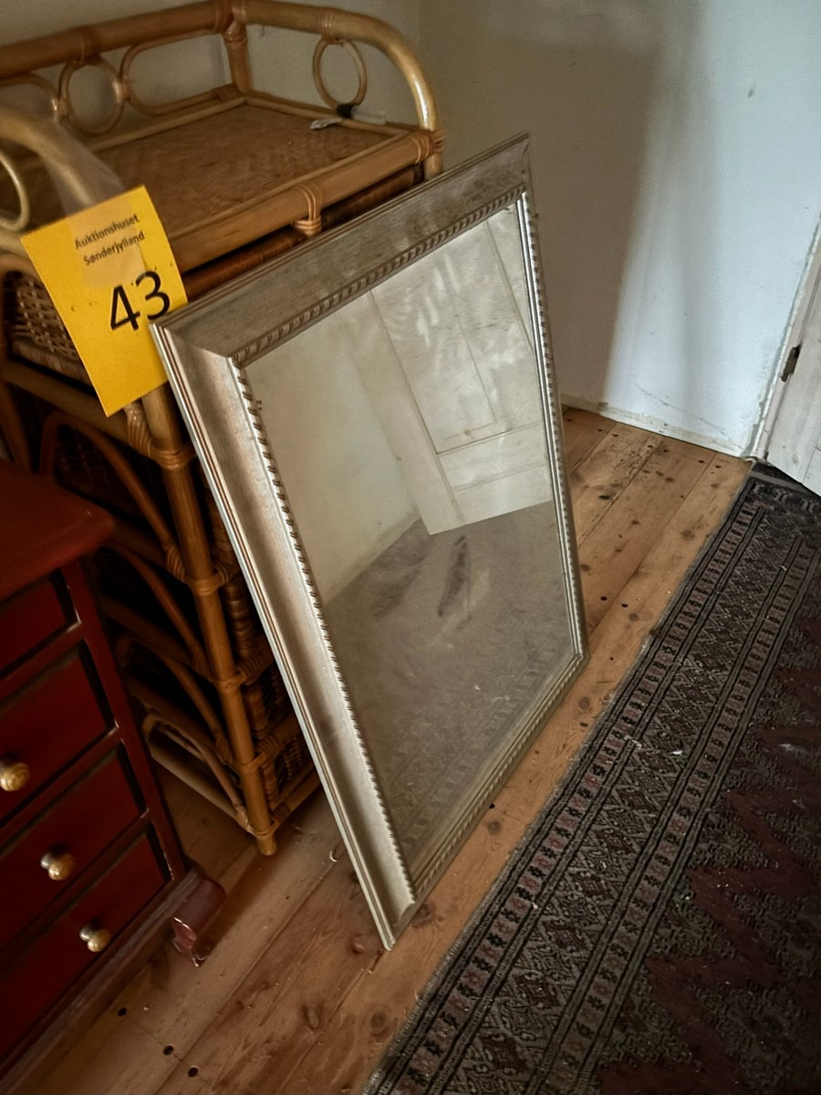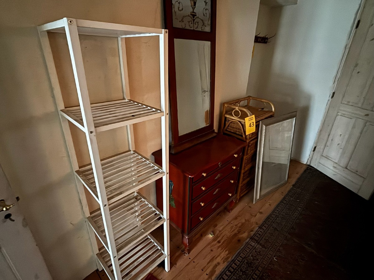 Diverse entremøbler. Kommode, spejl, bamubus kommode, hvidt spejl og hvid reol. Kommoden måler 69 bred x 39 dyb x  76 cm høj. I ok stand, trænger til rengøring. Fra dødsbo.