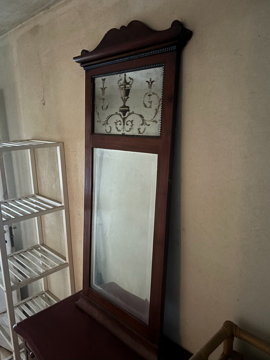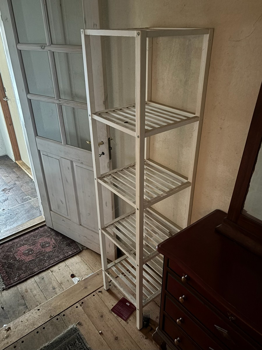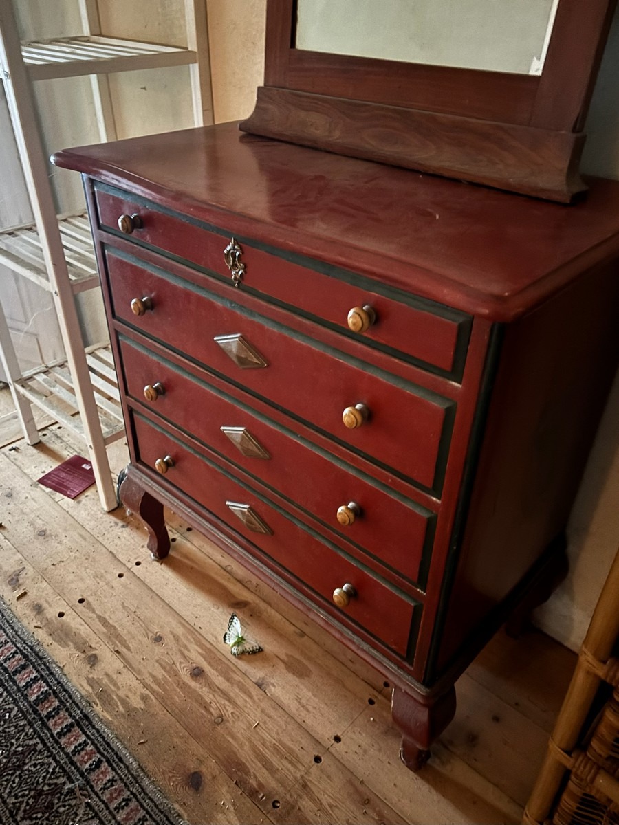 Diverse entremøbler. Kommode, spejl, bamubus kommode, hvidt spejl og hvid reol. Kommoden måler 69 bred x 39 dyb x  76 cm høj. I ok stand, trænger til rengøring. Fra dødsbo.
