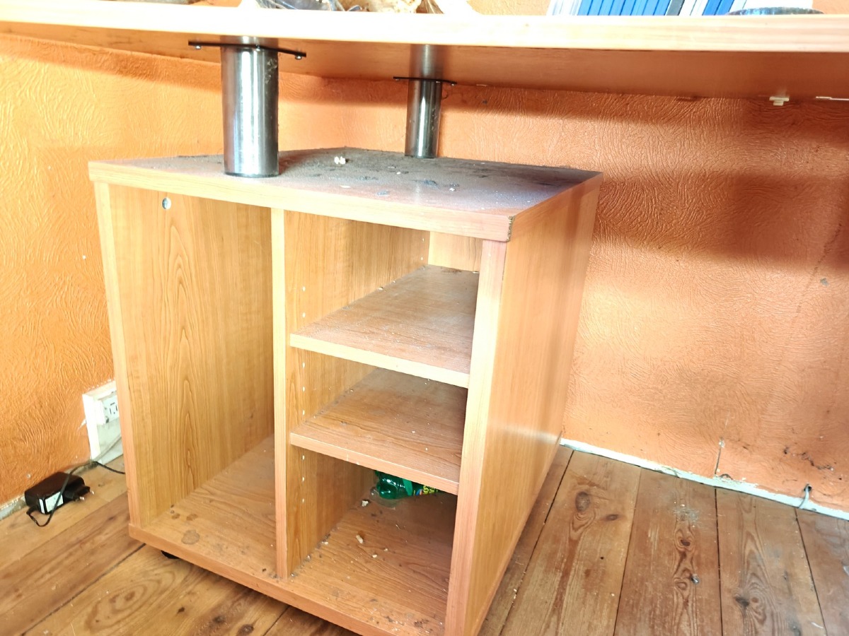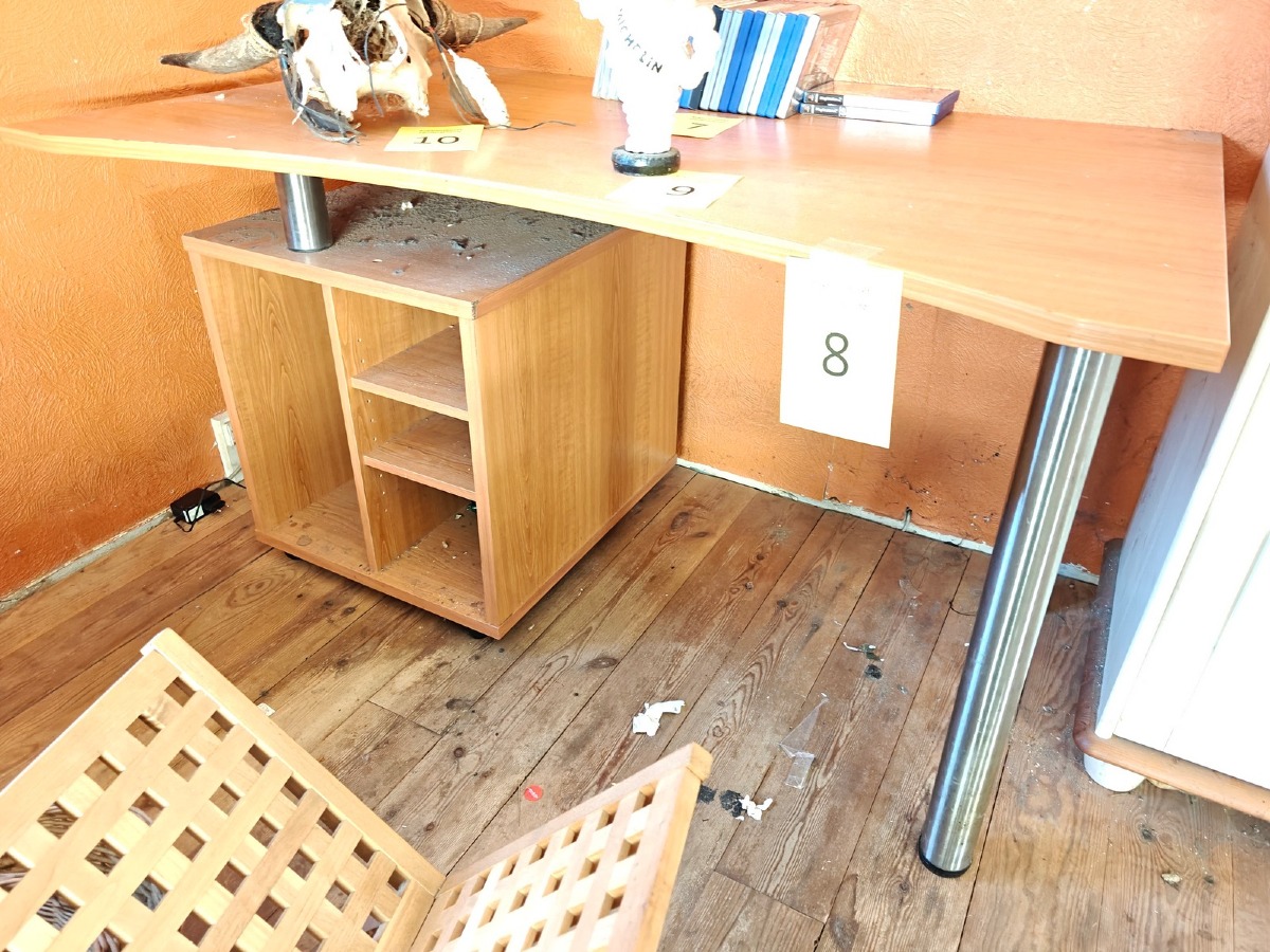 Kontorbord med bøgelaminat og med aluben.Måler 135 x 80 cm lang. I ok stand, trænger til rengøring. Fra dødsbo.