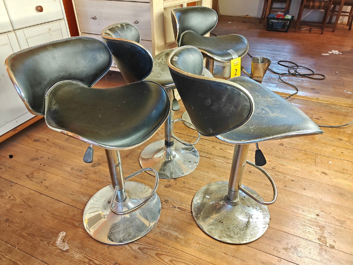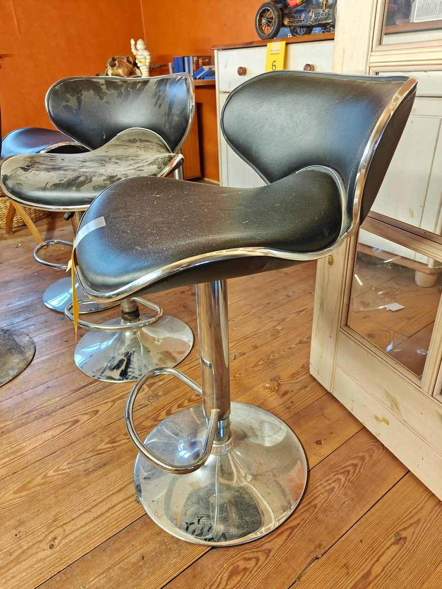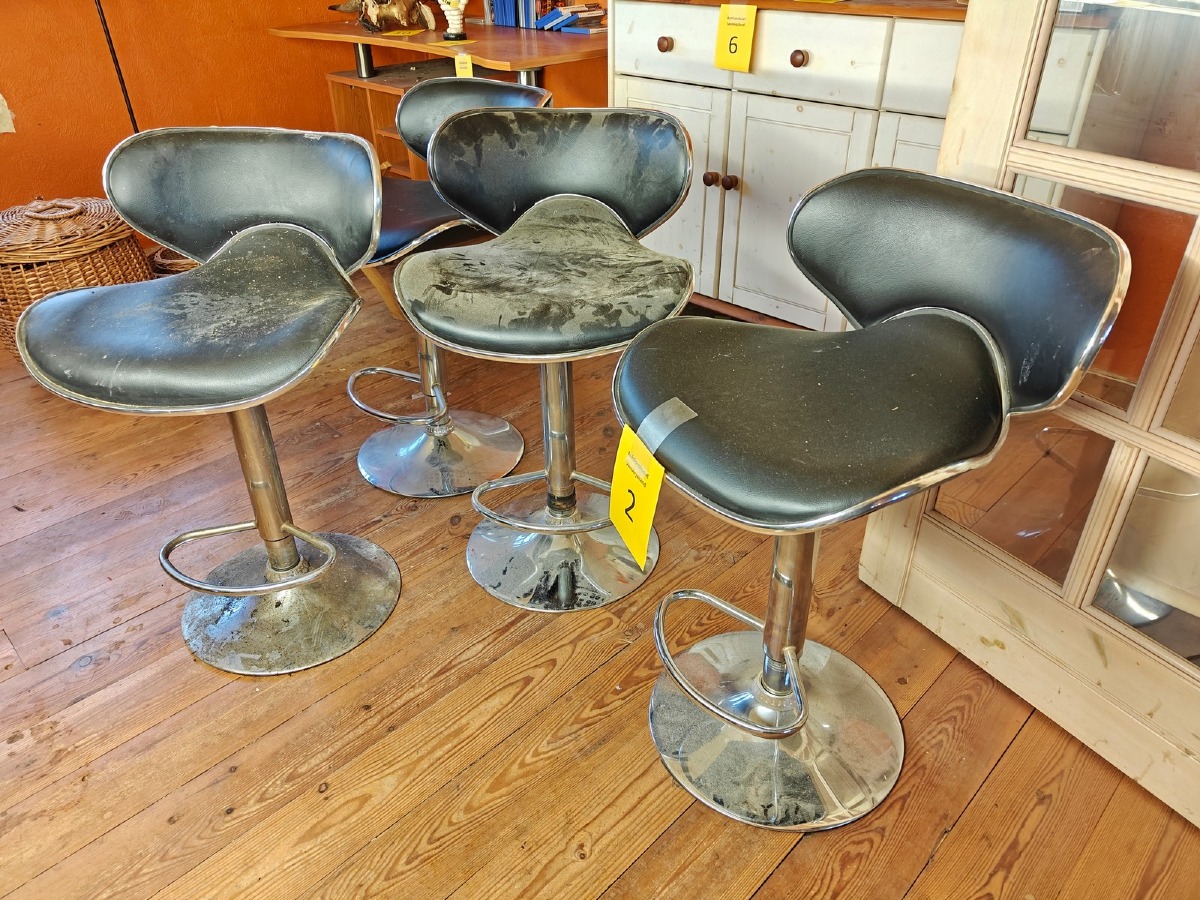 Barstole i sort læder, 4 stk. Med rund alufod og med benstøtte. Måler 45 x 50 dyb x 55 høj. Kan højde justres. Trænger til rengøring. Fra dødsbo.
