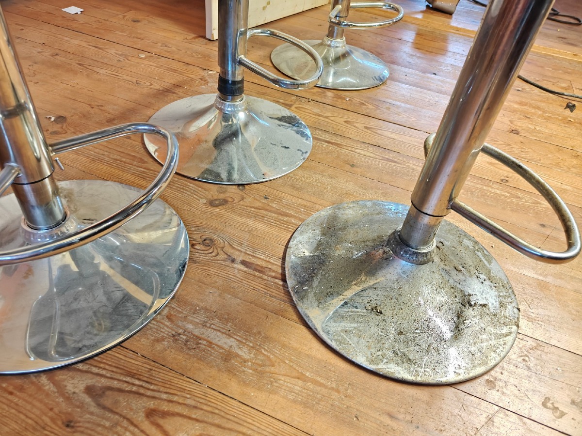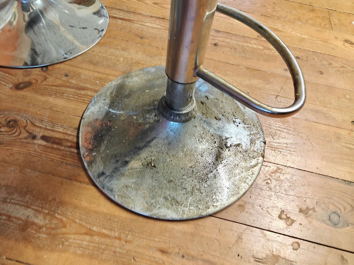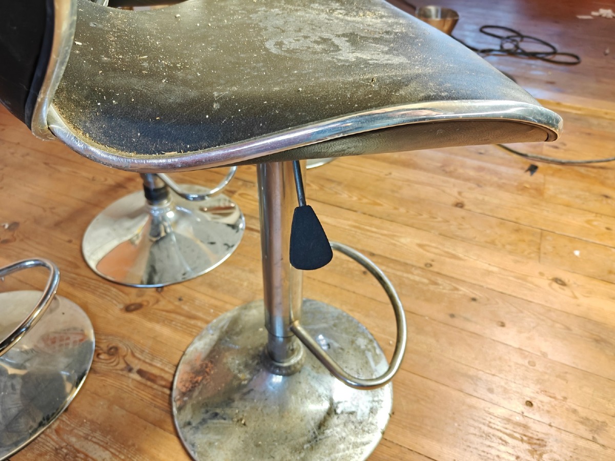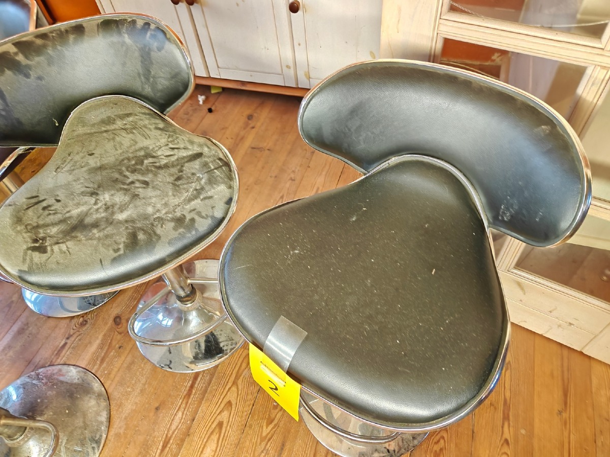 Barstole i sort læder, 4 stk. Med rund alufod og med benstøtte. Måler 45 x 50 dyb x 55 høj. Kan højde justres. Trænger til rengøring. Fra dødsbo.
