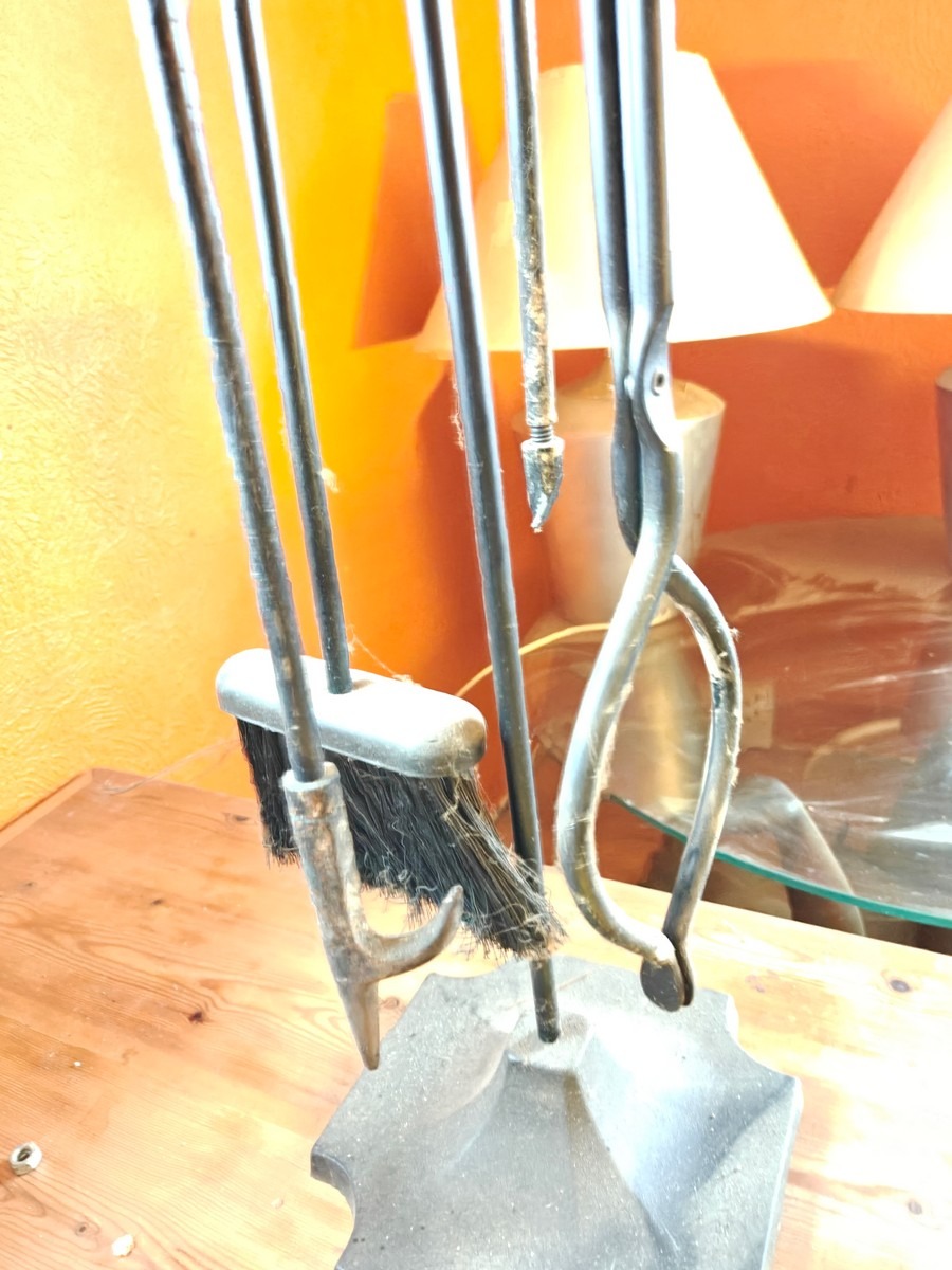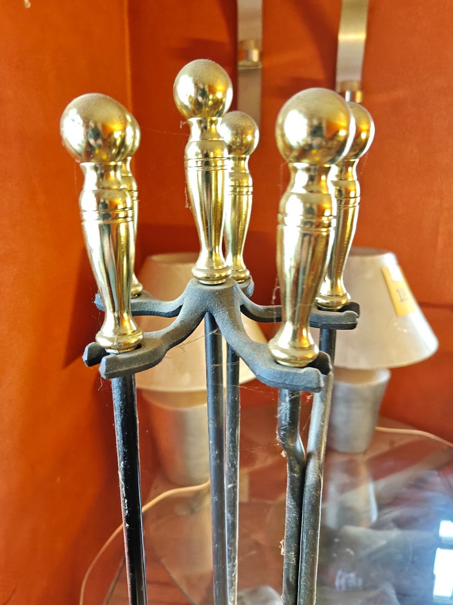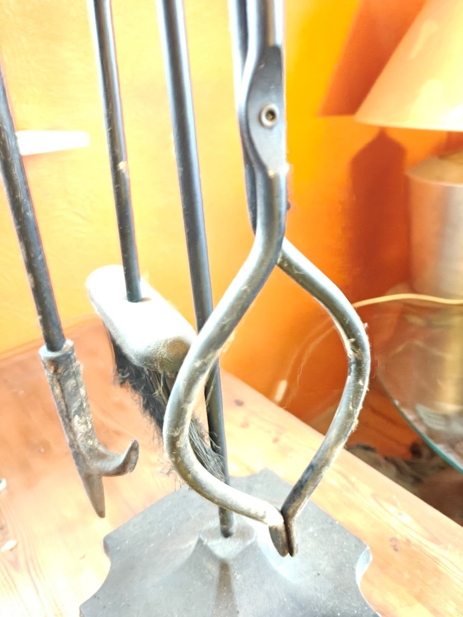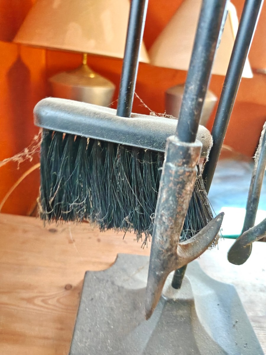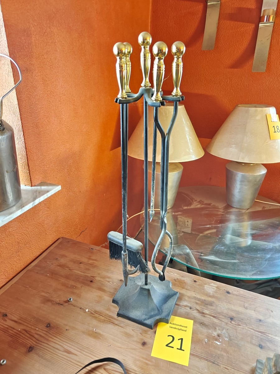 Pejse redskaber, kost skovl, ilddrager og tang på stativ. Med messing håndtag og på jern stativ. Måler 80 cm lang. I ok stand, trænger til rengøring. Fra dødsbo.