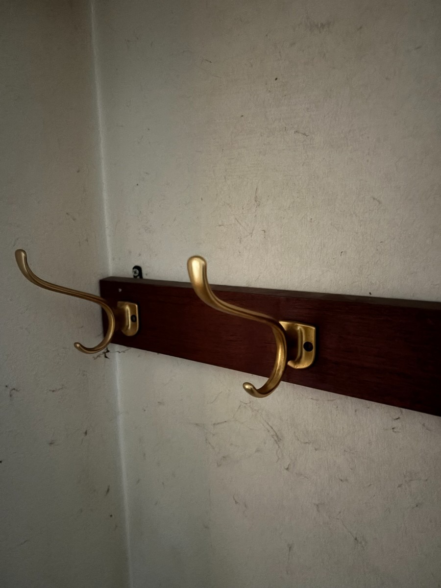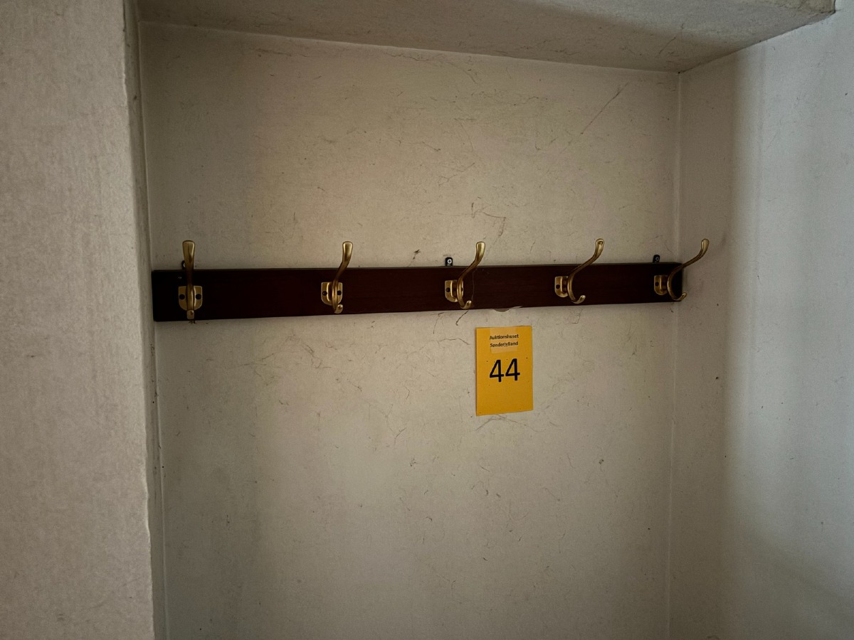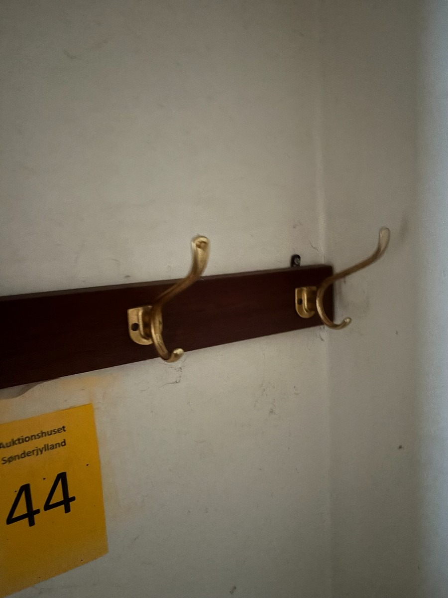 Teak knagerække med 5 messing knager. Måler 90 cm lang. I ok stand, trænger til rengøring. Fra dødsbo.