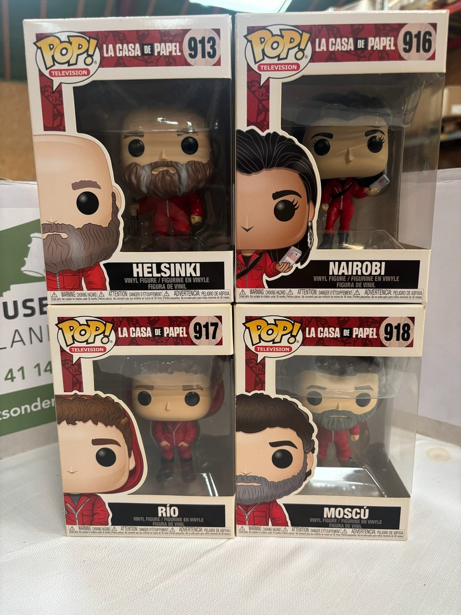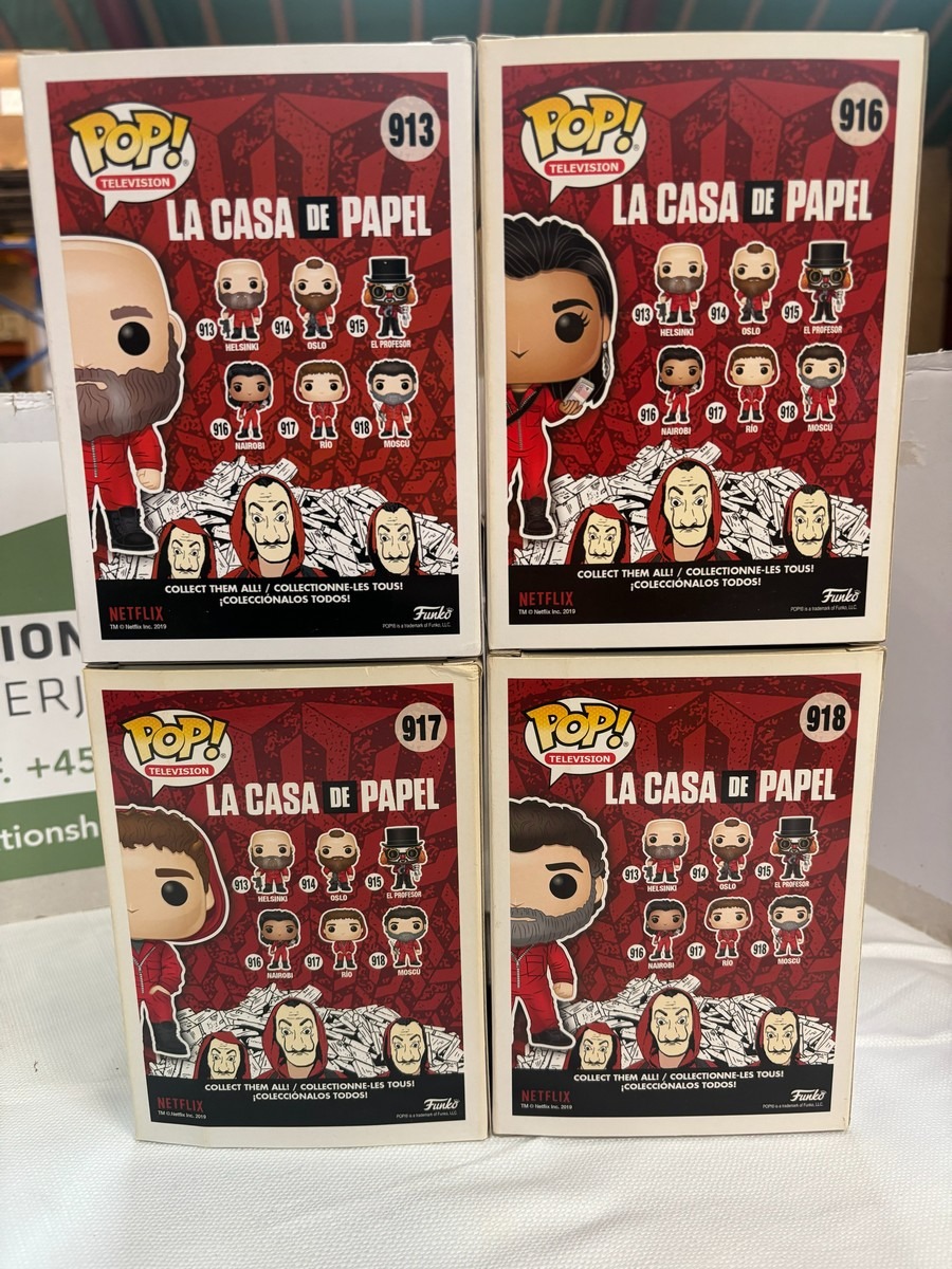 4 stk. Funko Pop LA Casa De Papel (913, 916, 917 & 918). Fra rygerhjem og kan have en snært af røglugt eller tegn på æsken