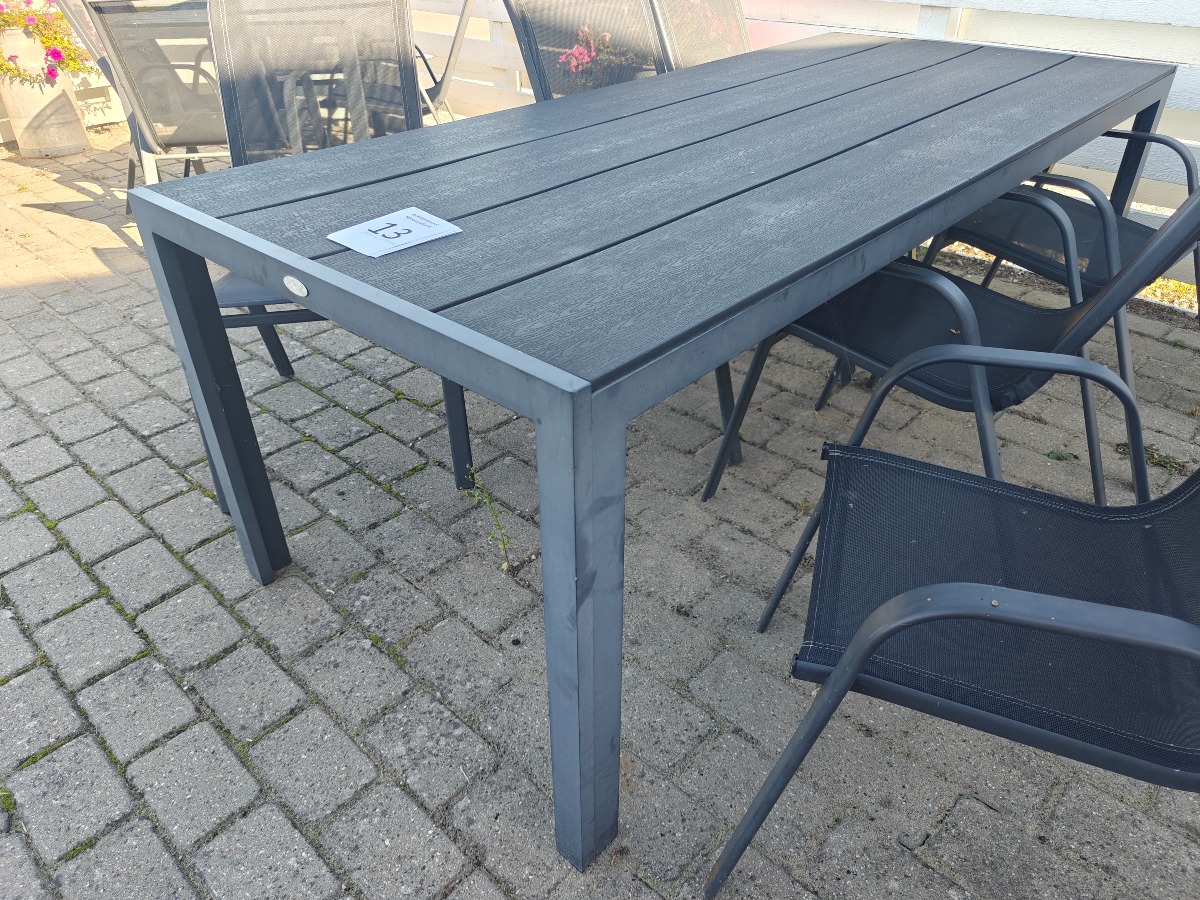 Havebord med 6 stk. stole. Bord: Mrk: Jutlandia. Mål: L: 205 cm. B: 90 cm. H: 76 cm. Brugt med brugsspor.