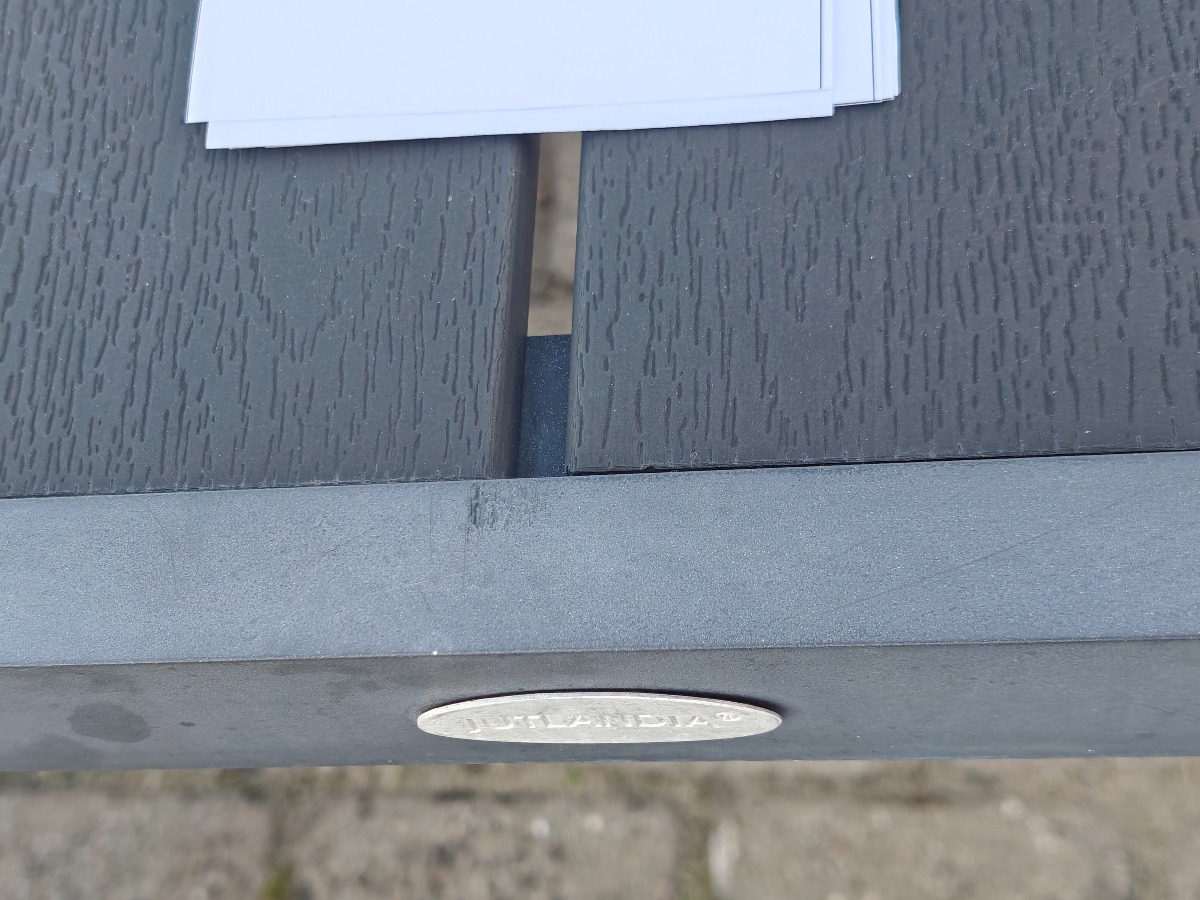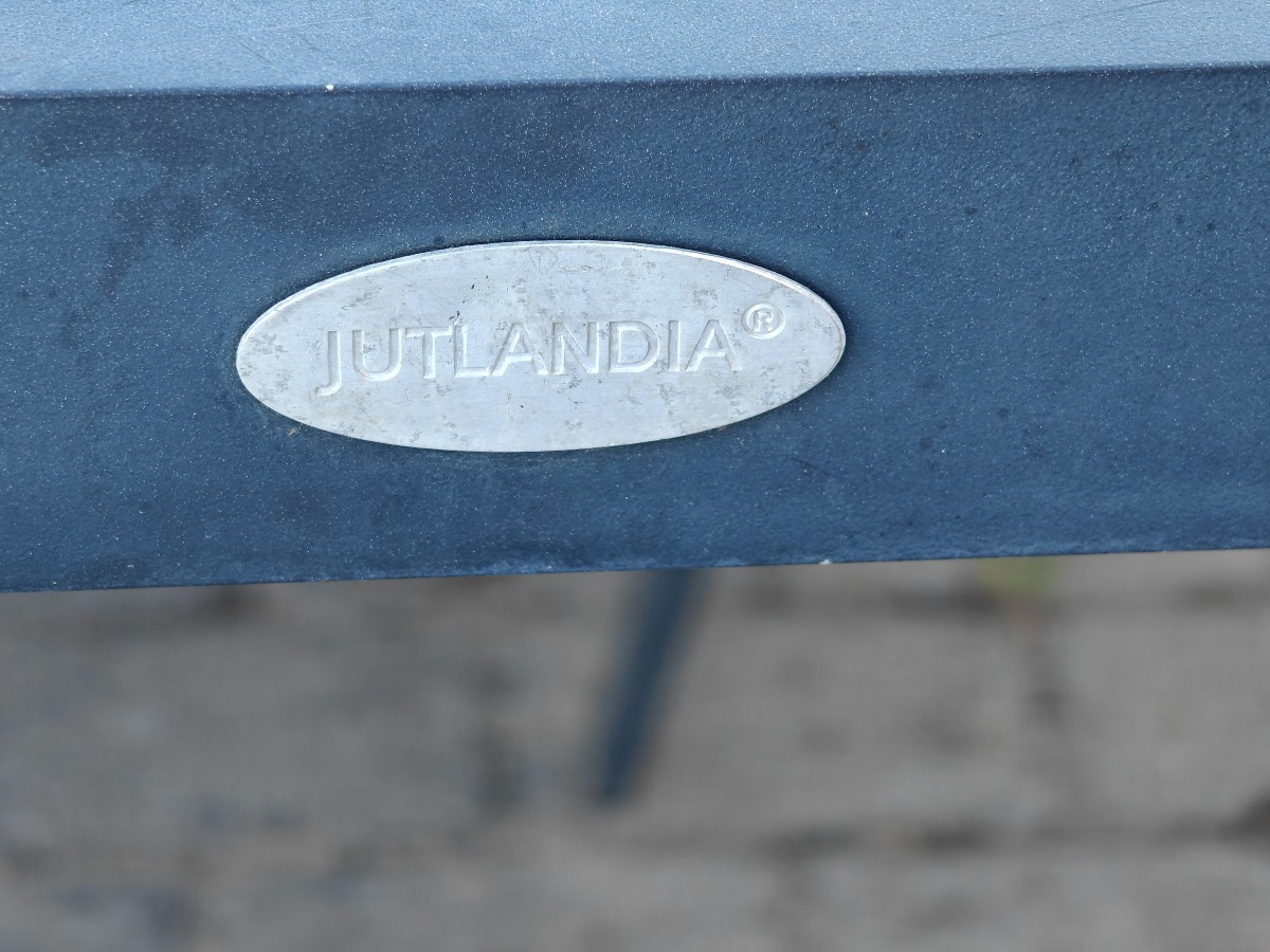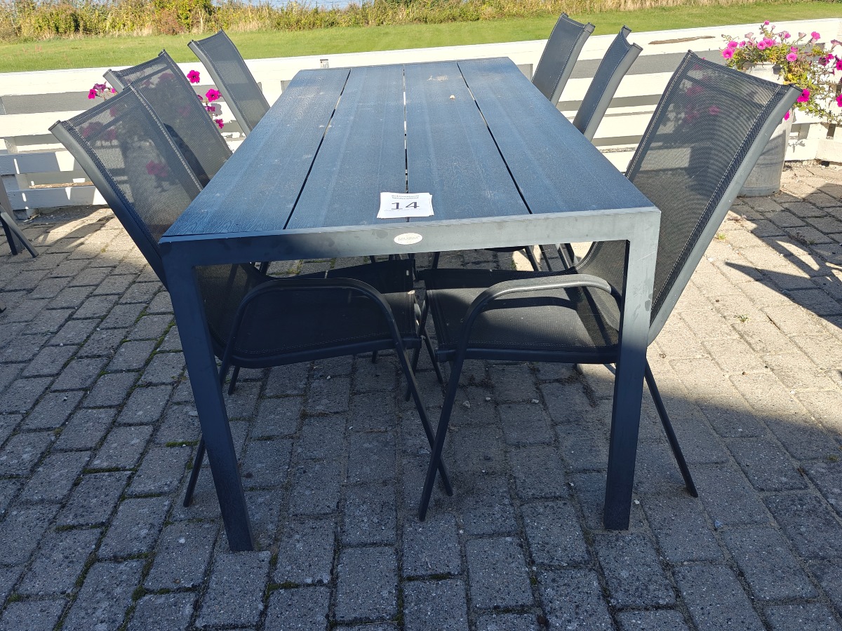 Havebord med 6 stk. stole. Bord: Mrk: Jutlandia. Mål: L: 205 cm. B: 90 cm. H: 76 cm. Brugt med brugsspor.