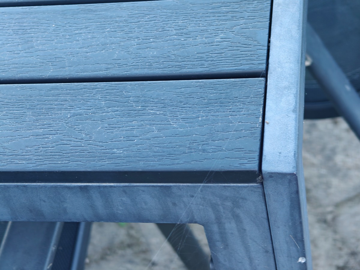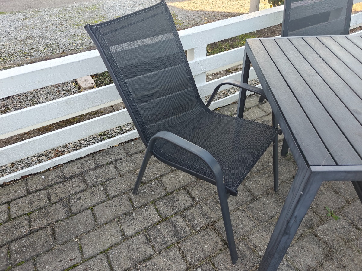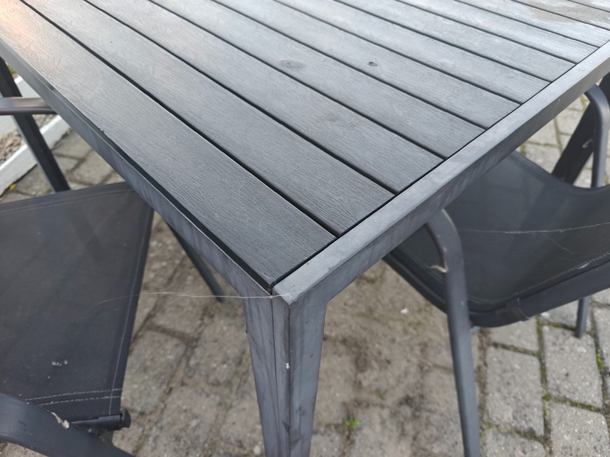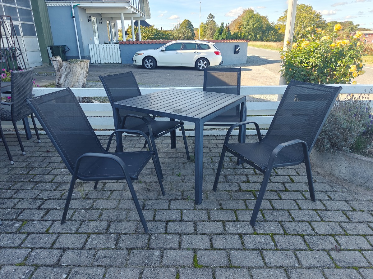 Havebord med 4 stk. stole. Bord: Mrk: Jutlandia. Mål: L: 90 cm. B: 90 cm. H: 76 cm. Brugt med brugsspor.