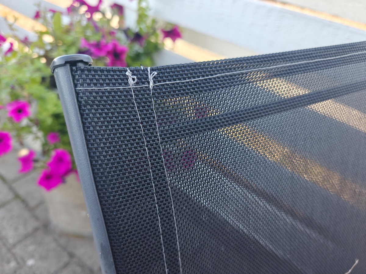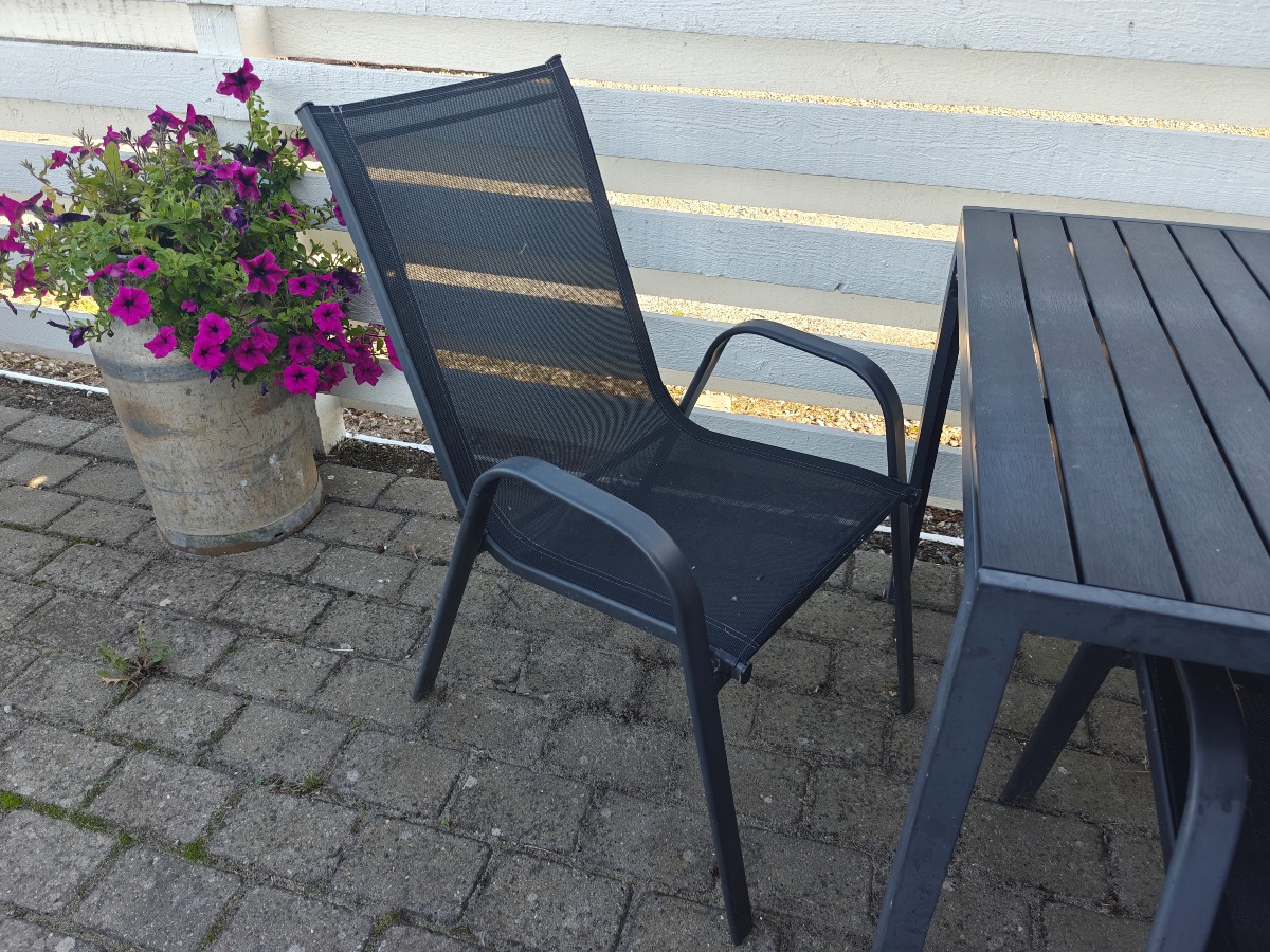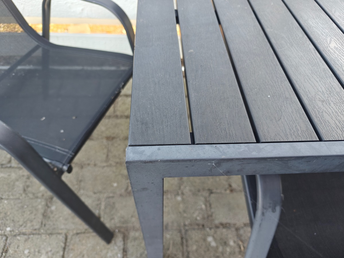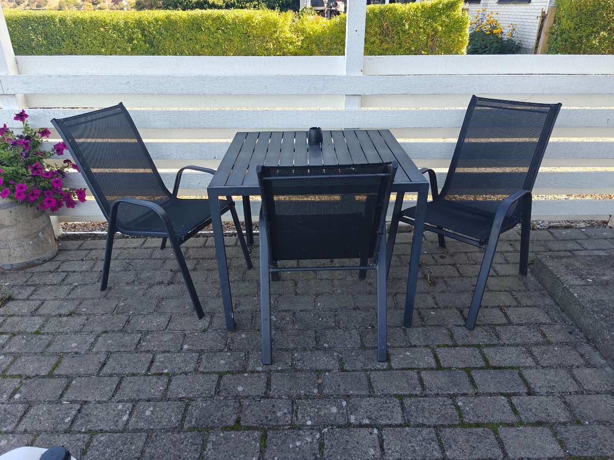 Havebord med 3 stk. stole. Bord: Mrk: Jutlandia. Mål: L: 90 cm. B: 90 cm. H: 76 cm. Brugt med brugsspor.