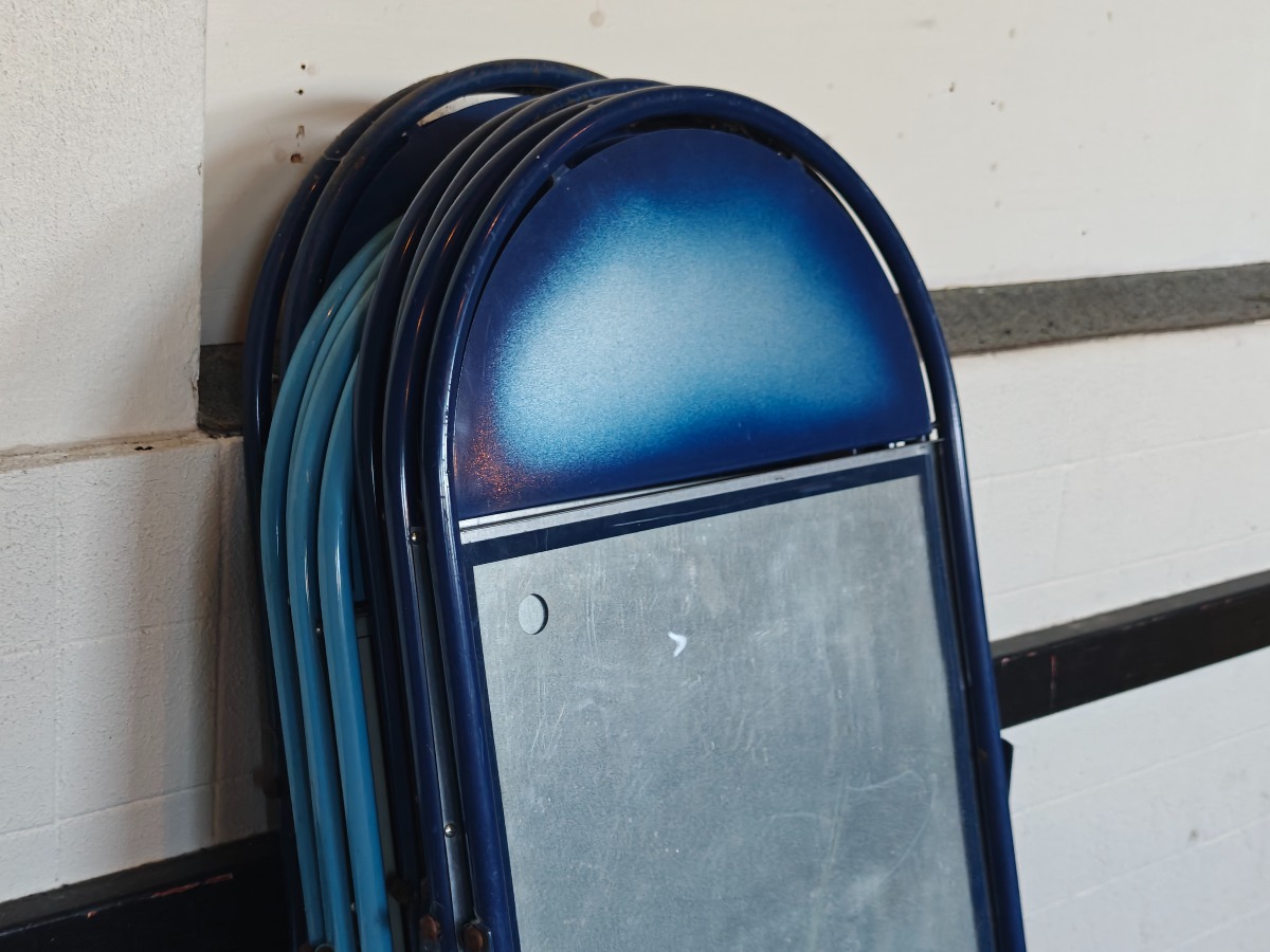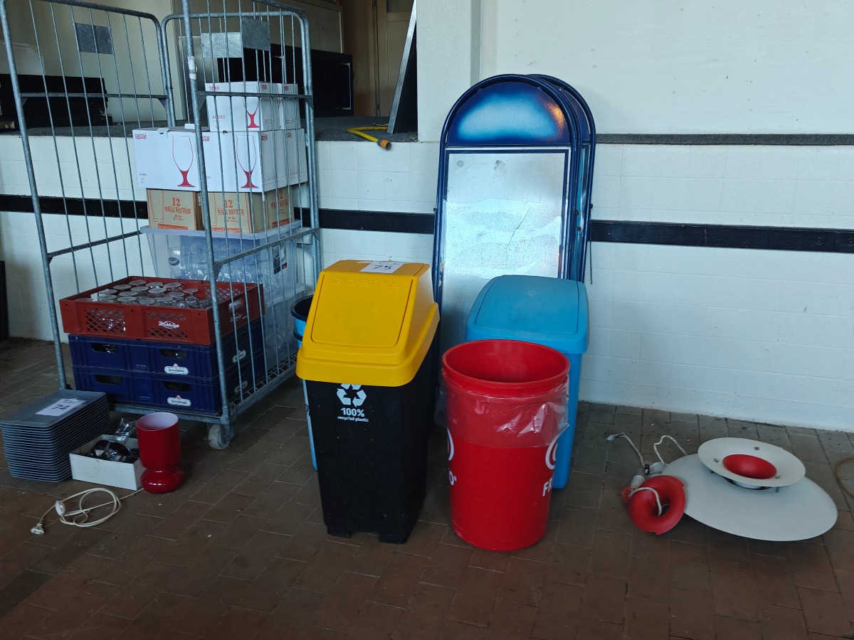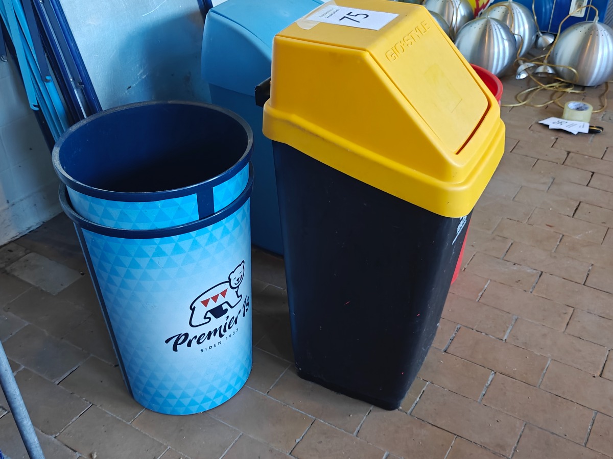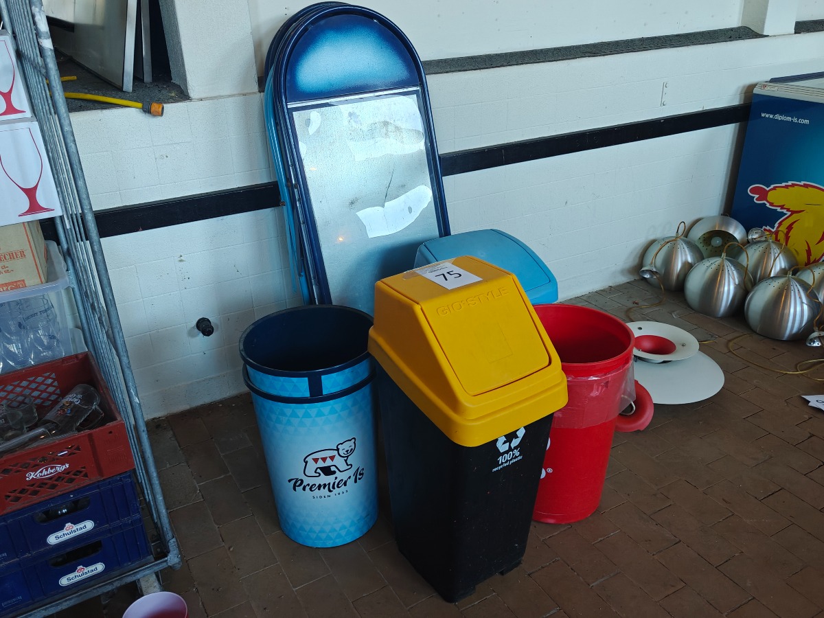 5 stk A-skilte & 6 stk skraldespande med logo, heraf 2 med vippelåg. Brugte.