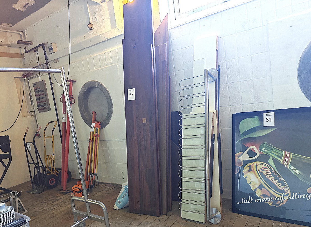 Bordplader, svævehylder, loftophængt glasholder og glashylde.